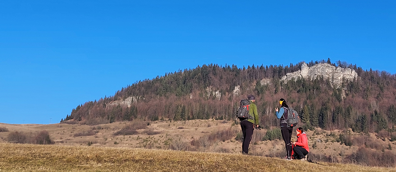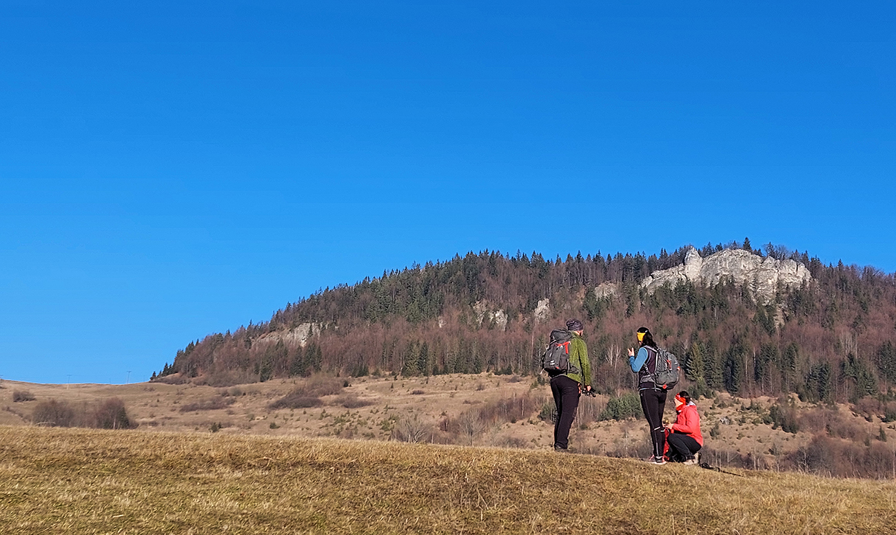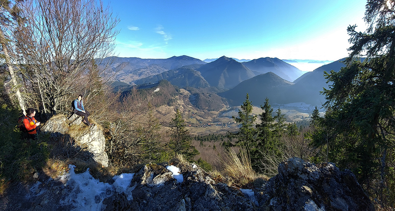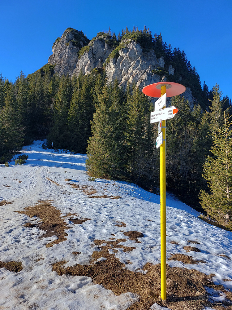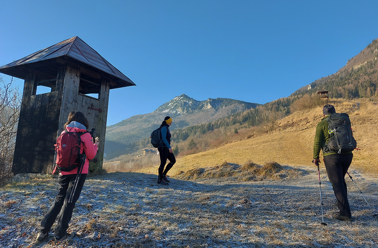 A teraz už seriózne teda... Na rozchodenie tak akurát do kopca, okolo dvoch zvoničiek nad Bielou do sedla Príslop. Po trávnatých chotárnych cestách a po ovčích prtiach, z hlbokého, mrazivého tieňa na ostré slnko. S naberaním výšky čoraz širšie panorámy: vpredu bralá pod Čapicou, vľavo Veľký Rozsutec, vpravo zalesnené dolnooravské dominanty: