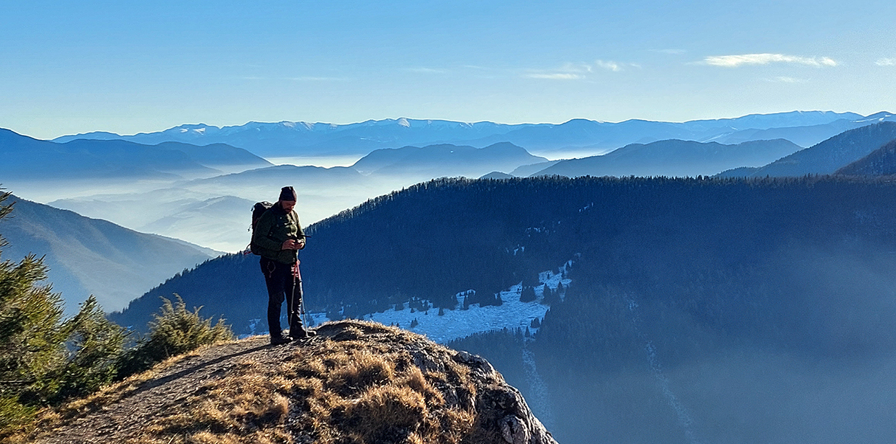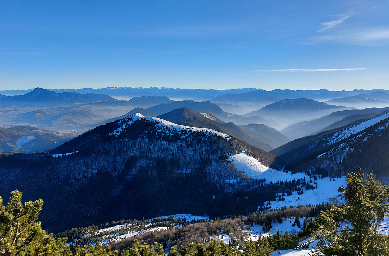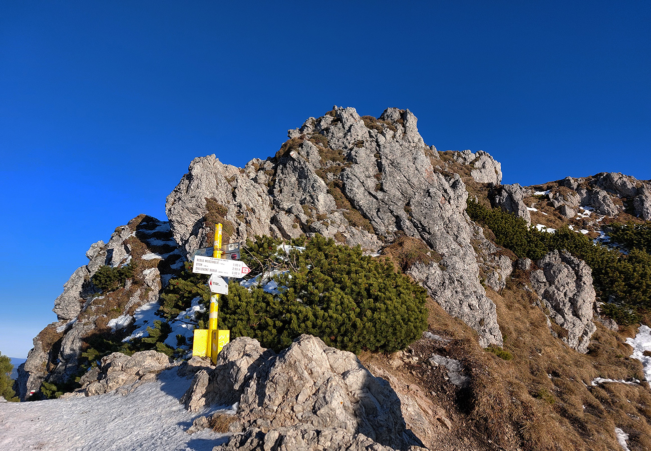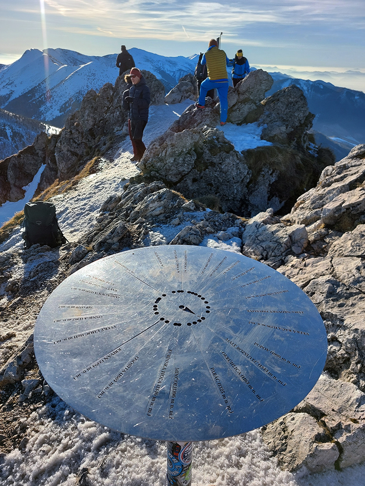 Hore prefukuje fest, ale dajú sa nájsť aj ohriate miestečká v závetrí, tak piknikujeme na predvrchole, a potom ideme už len na krátku návštevu ku smerovníku, ružici a krížu. Aj preto, lebo je tam husto. Furt tie isté panorámy, škoda hovoriť, akurát čo vidíme nové, že aj Turčianska kotlina je na dne mrazáku.