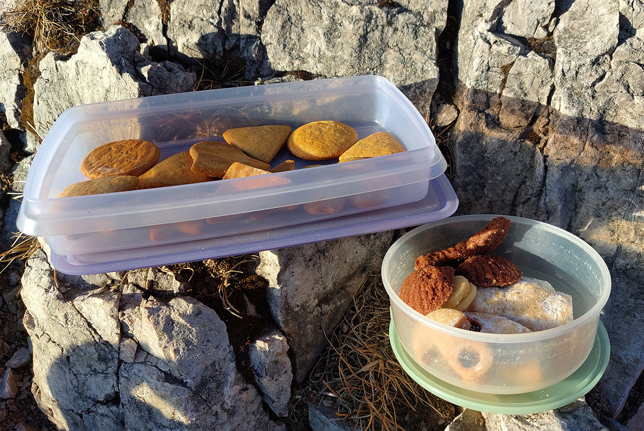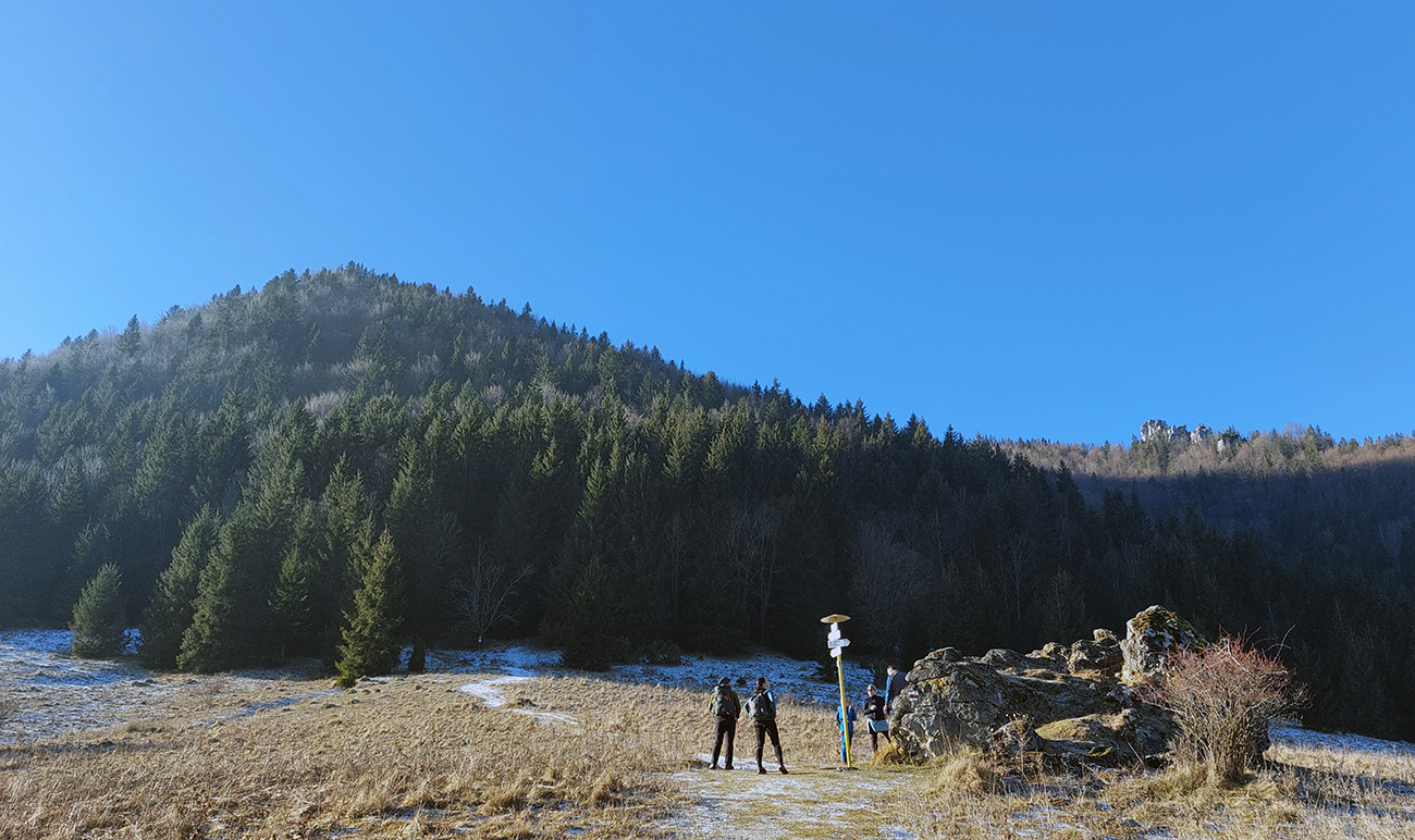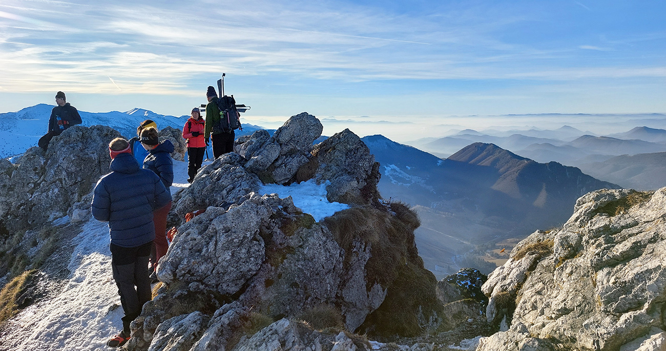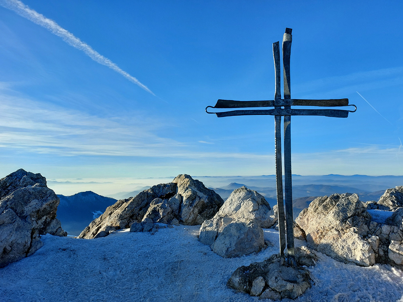 Hore prefukuje fest, ale dajú sa nájsť aj ohriate miestečká v závetrí, tak piknikujeme na predvrchole, a potom ideme už len na krátku návštevu ku smerovníku, ružici a krížu. Aj preto, lebo je tam husto. Furt tie isté panorámy, škoda hovoriť, akurát čo vidíme nové, že aj Turčianska kotlina je na dne mrazáku.