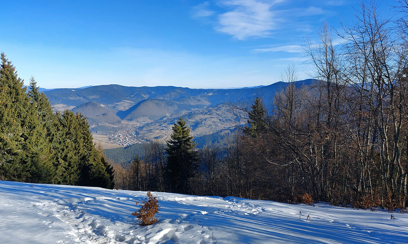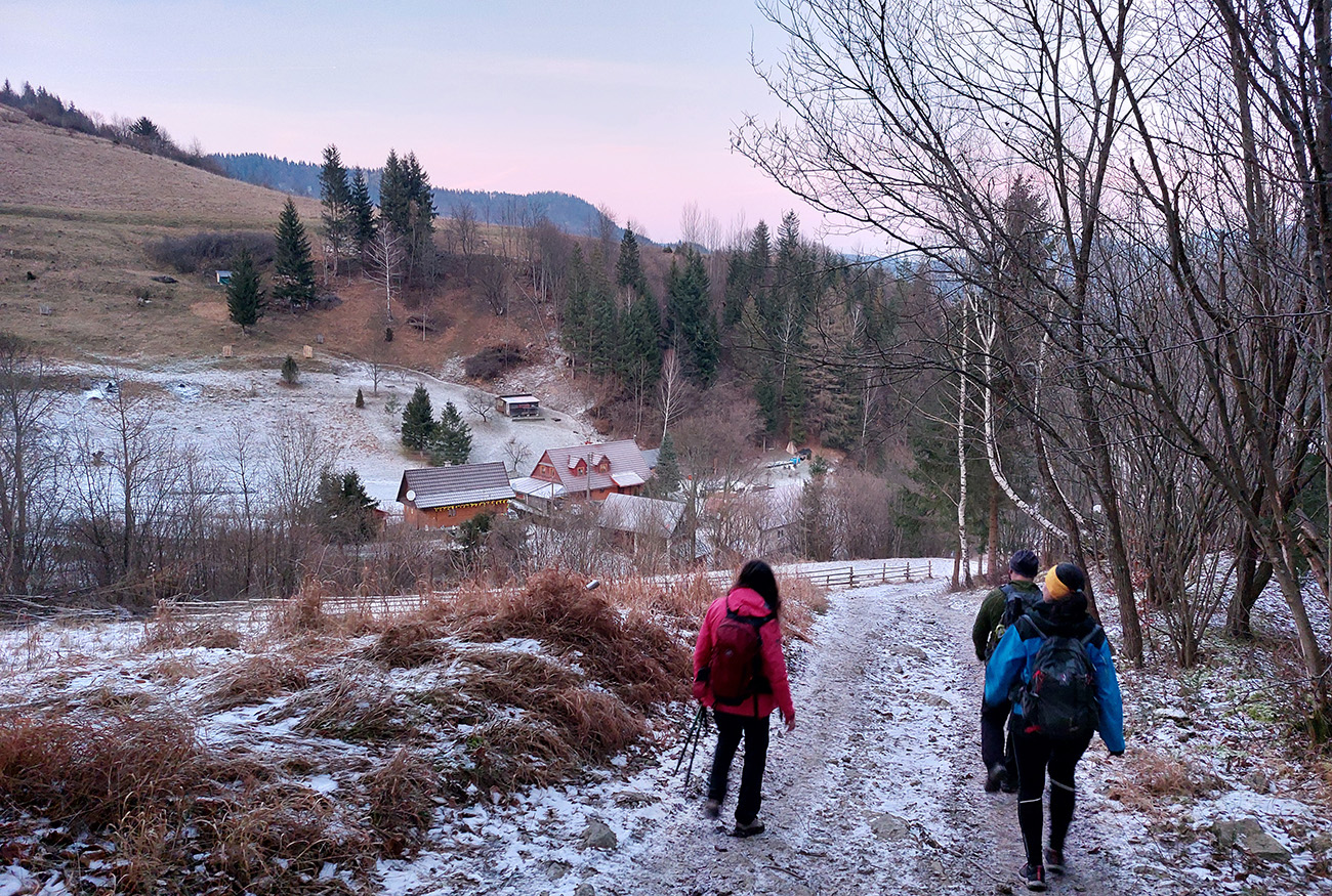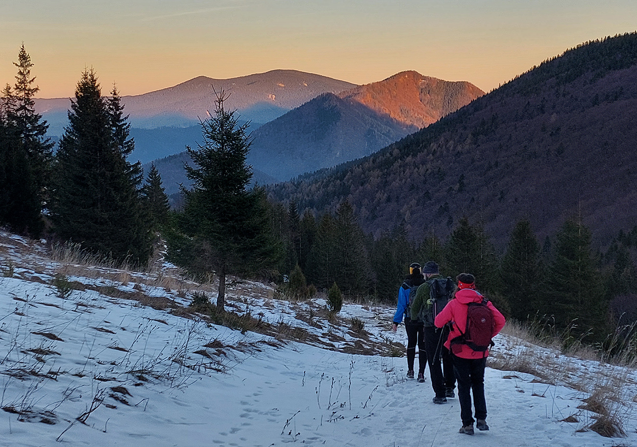 V Medziholí už len v tieni. Zužujúce sa panorámy sú preteplené len odbleskami svietiacich vrcholkov, ale ako klesáme a za hrebeňmi slnko tiež, aj tie zvyšky svetla prechádzajú do podvečernej oranžovej. Z lesa na lúky nad Bielou sa už vynárame do šera a dole dedinou okrem tmy a mrazu hustne aj atmosféra rozbiehajúcich sa predsilvestrovských osláv. Povoz trpezlivo čaká, a že načo sme sa tam hore trepali, keď sme aj tak nakoniec dole zišli :-)