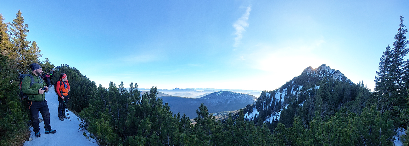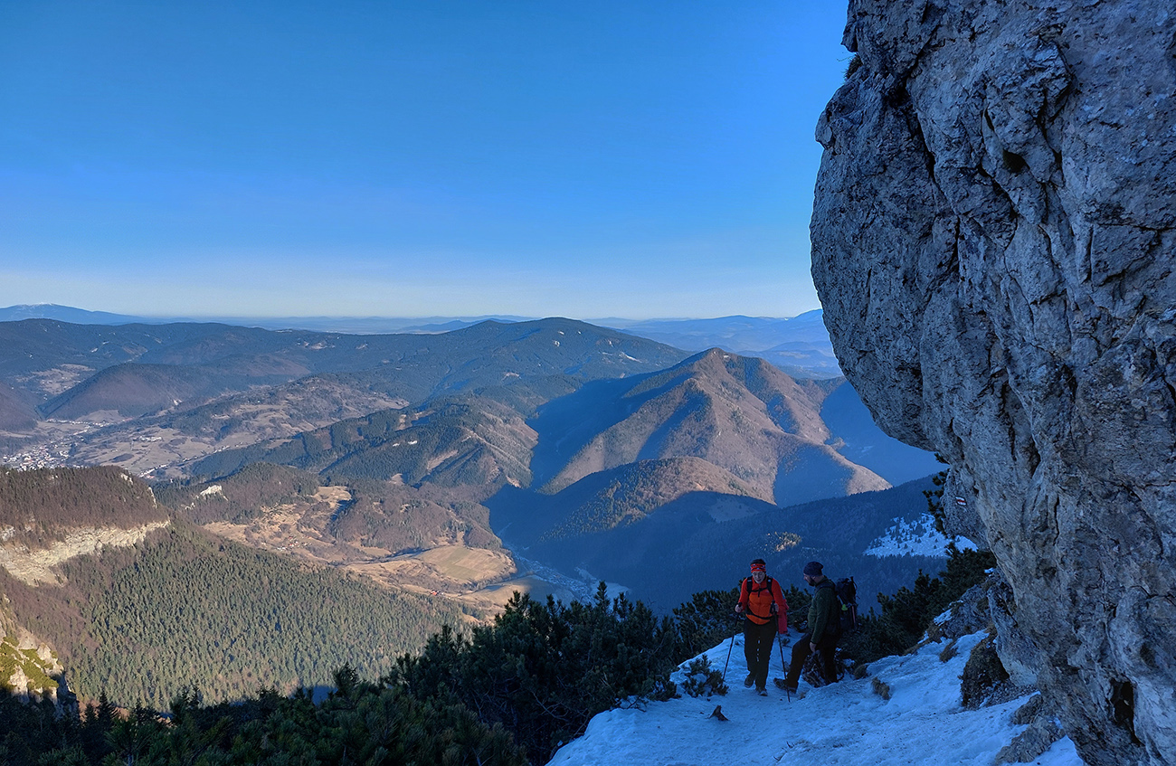 Malý Rozsutec nasvietený a výstupová stena suchá, ide sa hore, keď už sme tu. Samozrejme v tieňoch aj ľady pod nohami, ale dalo sa aj bez mňaukania. Skôr zubami poriadne škrípali tí, ktorí mačky vytiahli vyvenčiť sa. Dokonalú vrcholovú panorámu netreba predstavovať, akurát hlavný cieľ dňa sme mali priamo v protislnku.