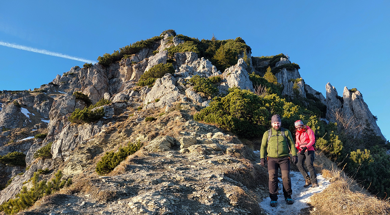 Nazad dole, medzi sedlami jedovato prefukuje a v tieňoch prituhuje, tešíme sa, ako sa ohrejeme výstupom na Veľký. Aj tu cestou pár pekných miest na predýchanie a pokochanie. A kontrast zavinený polohou a výškou zimného slnka: