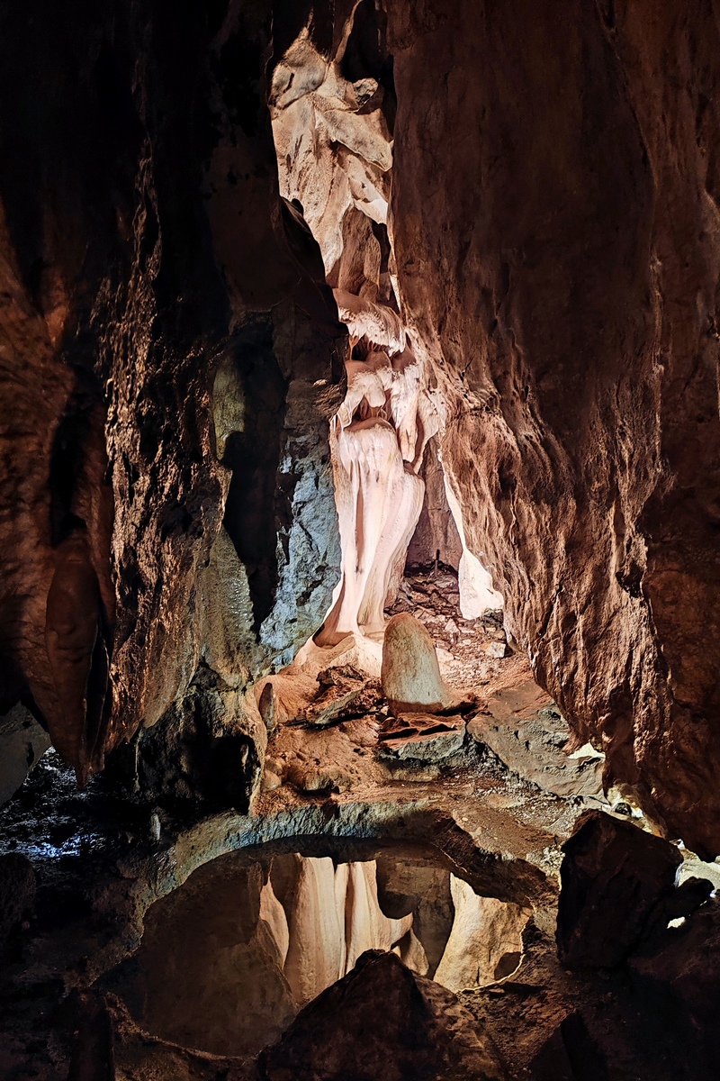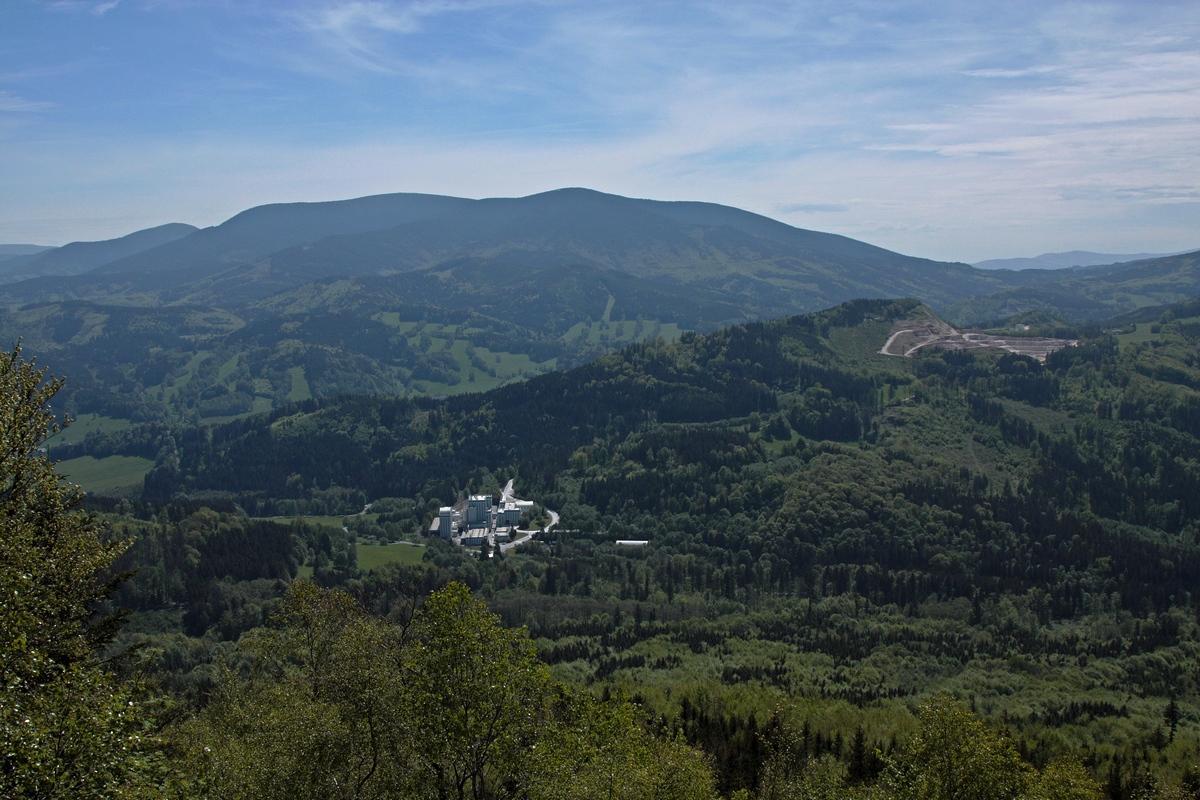 Míňame areál vápenky, ktorá získala titul v súťaži stavba roku 2000, a mierime rovno k druhej miestnej zaujímavosti. Je ňou Jeskyně na Pomezí, najväčší sprístupnený jaskynný systém ČR v kryštalickom vápenci. Vyznačuje sa členitosťou podzemných priestorov a bohatou kvapľovou výzdobou. Objavená bola v 30. rokoch 20. storočia pri ťažbe mramoru a od roku 1950 je oficiálne prístupná verejnosti. Ani my neodoláme a na 45 minút sa strácame v podzemí (viac info TU ). Po prehliadke sme kvalitne uzimení a vďačíme za každý výškový meter, ktorý v nasledujúcom úseku zohreje naše telá. Výživné stúpanie končí na vyhliadke Medvědí kámen. Nenápadné súskalie vyčnievajúce z lesa ponúka výhľad k výraznému kameňolomu a vápenke pod ním, na Šerák v Hrubom Jeseníku a na celý hraničný hrebeň Rychlebských hôr od Smrku na sever. Pre pozorné oko je v skale pod vyhliadkou vytesaný nápis „BÄREN STEIN 1859“.