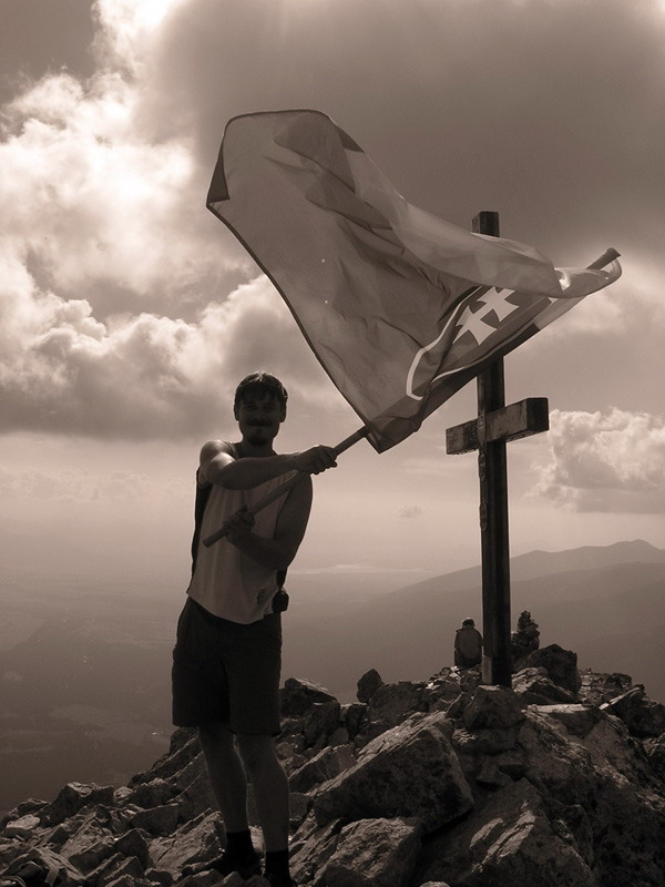 Na rázcestí v Krivánskom žľabe sa nás jeden ujo, vidiac naše zúbožené tváre, pýta či už nevládzeme. Jožo mu vysvetľuje, že ideme až z Rysov. „A to naozaj?“ „Nie, to si iba vymýšľame“, hovorí mu Jožo. „Aj som si myslel, veď to sa nedá stihnúť za deň“. Tak sme tu dnes za lúzrov, myslím si. Na vrchole je už len pár ľudí. Zapózujeme so slovenskou vlajkou, čo tu zabudol nejaký národovec a oceňujeme, že sme sa v oboch prípadoch vyhli nátresku na vrchole kopca.