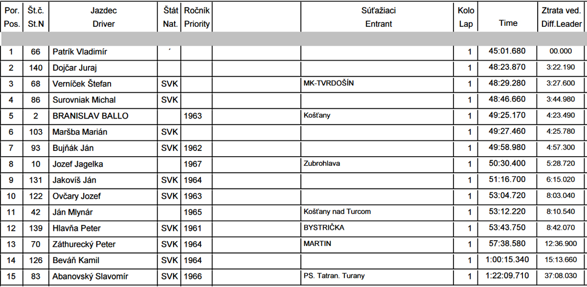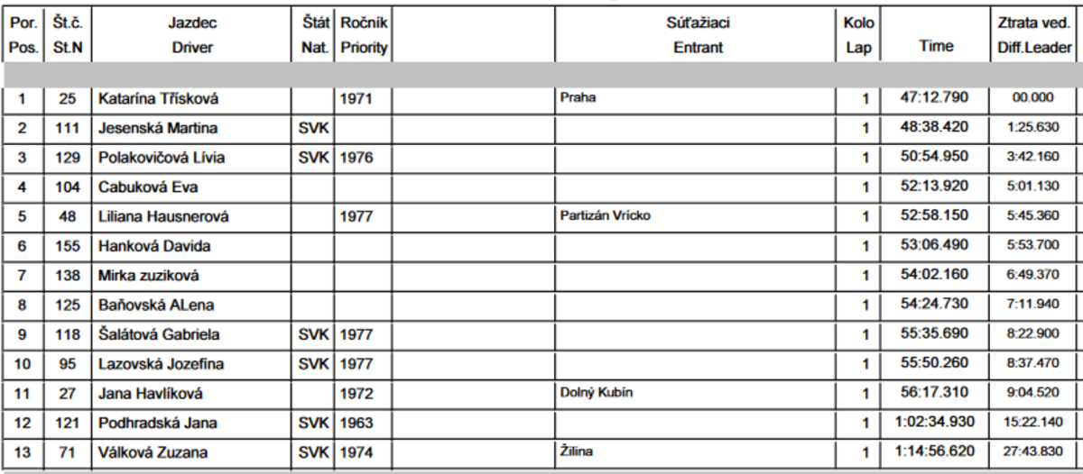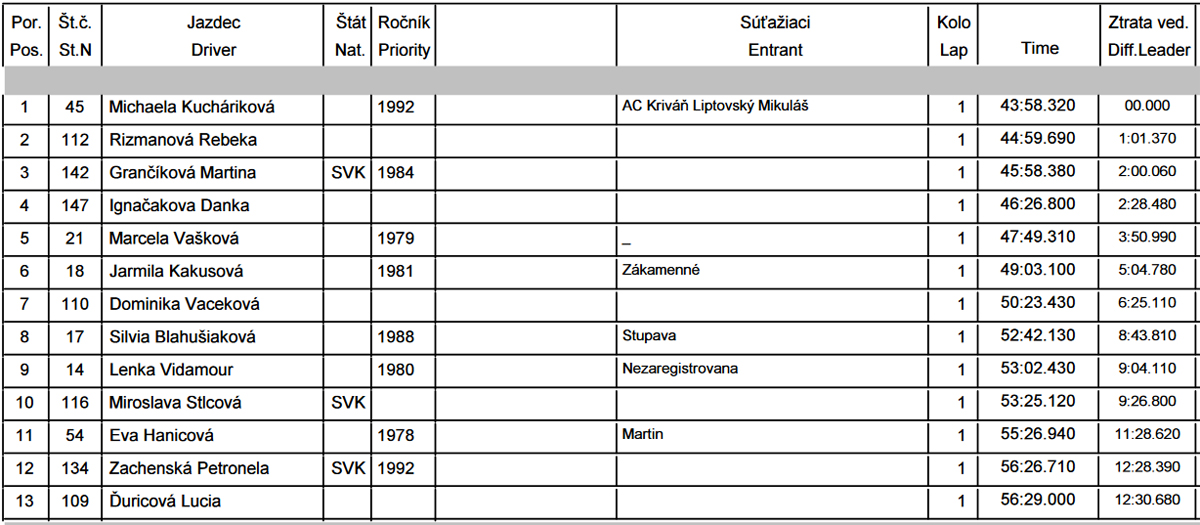 Medzi dioukami tiež skoro samé známe firmy, často domáce alebo z najbližšieho vesmíru. Prvé tri takisto ako u mužov boli z tej mladšej kategórie. Do cieľa sa zoradili pekne v minútových odstupoch, najrýchlejšia bola Michaela Kucháriková (43:58). Medzi väčšími dievčatami to najrýchlejšie behalo Kataríne Třískovej (47:12). Kompletné výsledky sú na stránke kk-sporttiming.com.