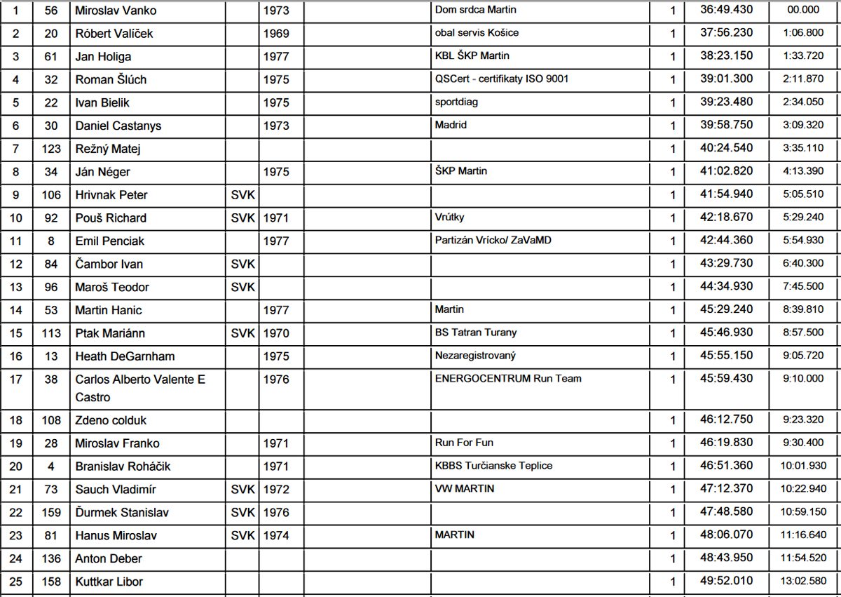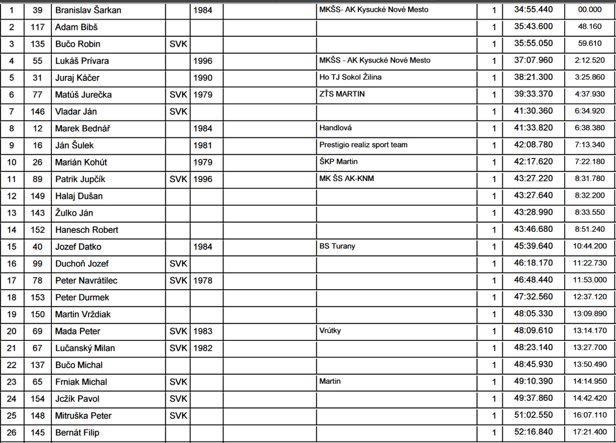 Favoriti tentoraz prišli na štart včas :-) Takže pekne dopredu a už sa rezali. Víťaz posledných ročníkov Braňo Šarkan nechýbal ani nechybil, išiel systémom štart – cieľ (34:55), vraj na pohodu... A možno aj na nervy ostatným, ktorí ho darmo naháňali. Prví traja v absolútnom poradí boli v kategórii do 39 rokov, prvý „nadštyridsiatnik“ Miro Vanko doletel do cieľa štvrtý (36:49).