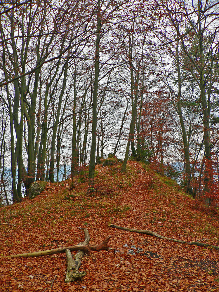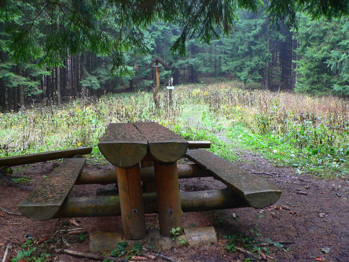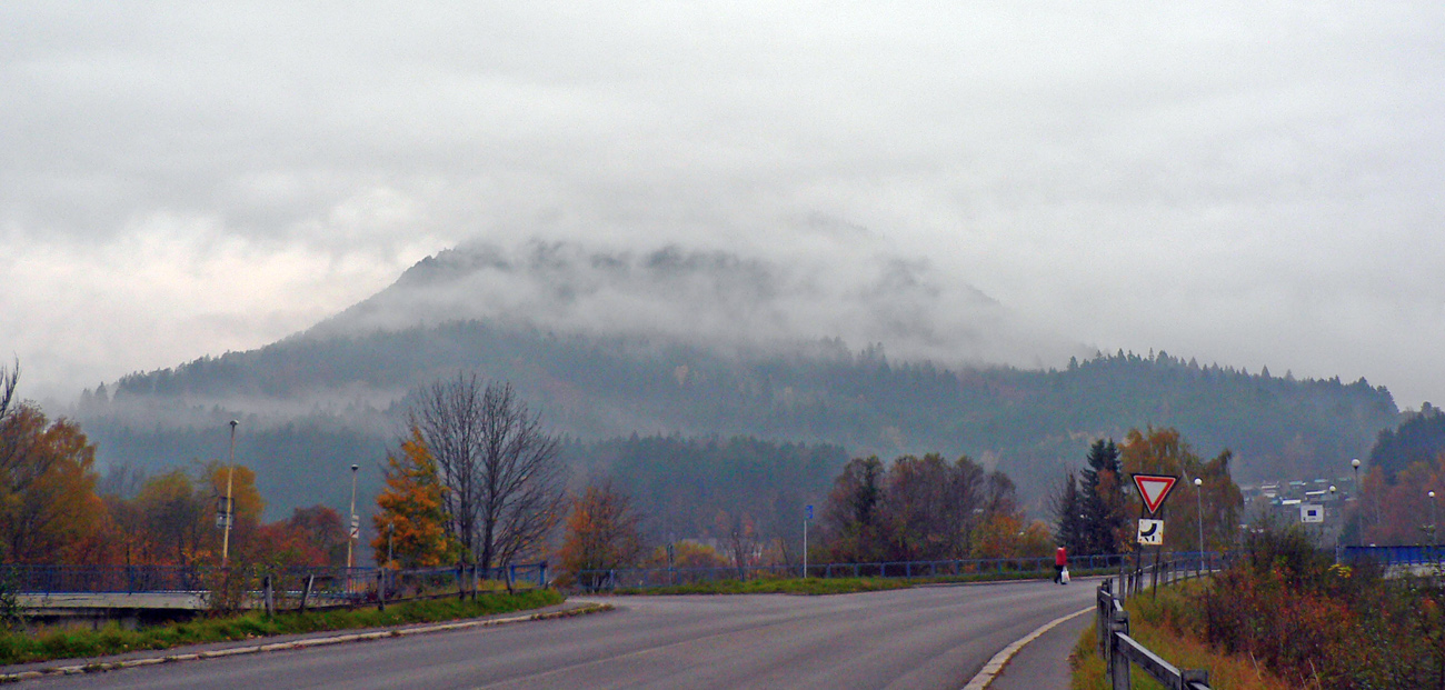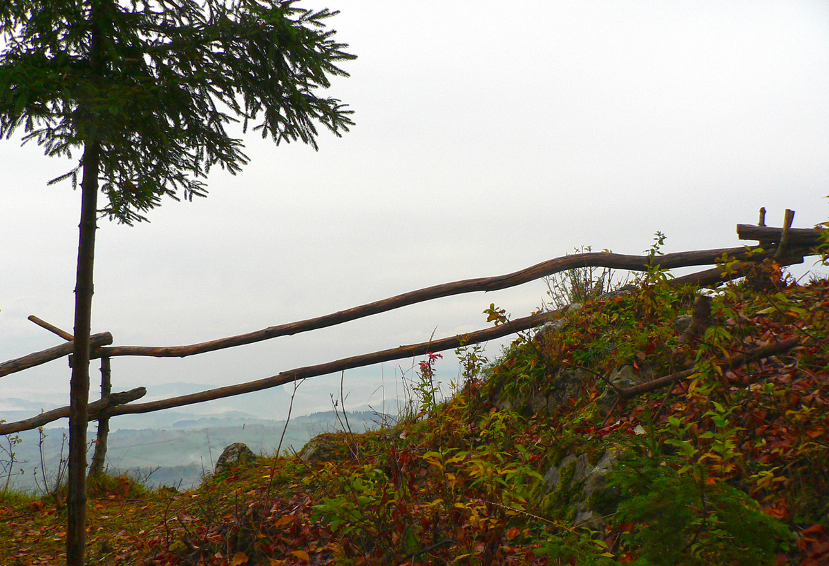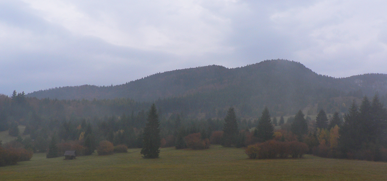 Napájam sa na červenú a začína seriózne pršať, nepomáha ani to, že som v lese. Tak posedím chvíľu v prístrešku v sedle pod Radičinou, aj v ďalšom na vrchole. Na vyhliadkovú plošinku sa môžem len pozerať, za ňou sa rozlieva plnotučné mlieko a nie výhľady. Zachádzku ponad skalné zrázy, po hrebienku na sever k Tlstej hore si nechávam na inokedy. Keď ale dážď vidí, že ma neodradí, prestáva postupne otravovať. Po tvrdej lesnej ceste (pod lístím vápenec) je to pod Kečky poklusom len chvíľa. Za poľanou s posedom sa ide krátko a strmo hore, na zarastenú vrcholovú lúku. Bez výhľadov.