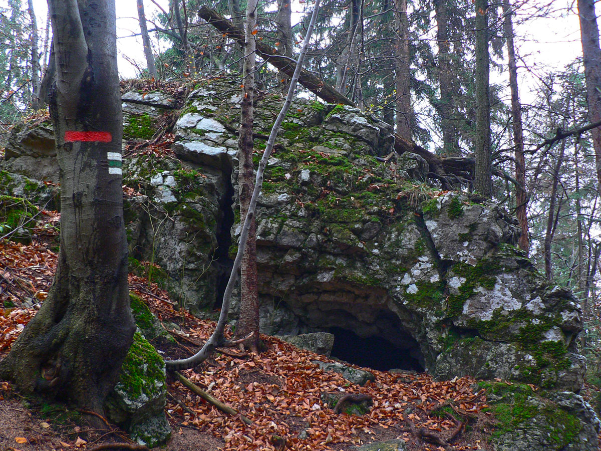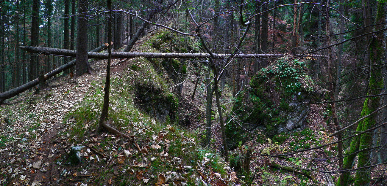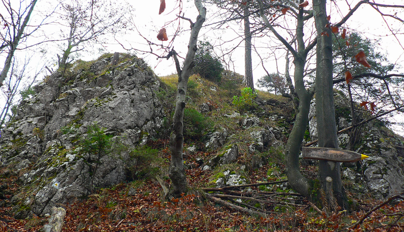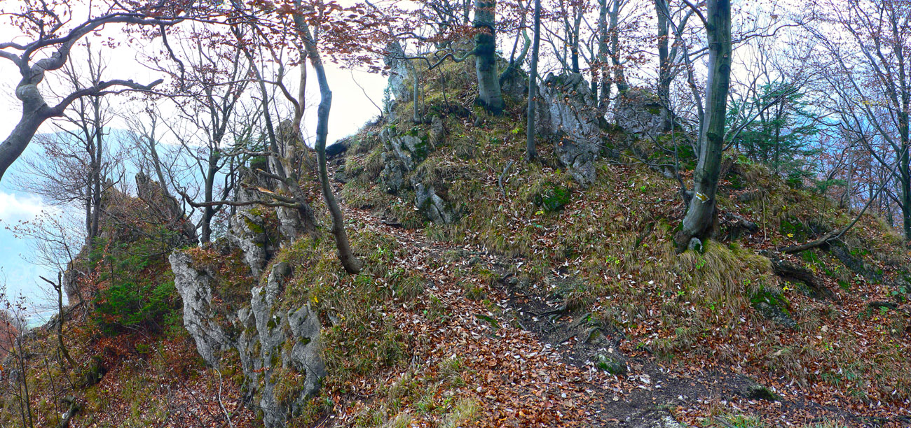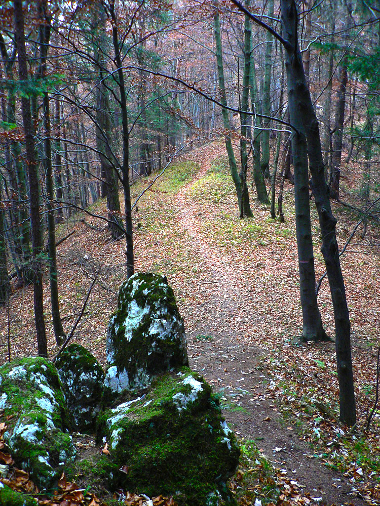 Príjemný chodník lesom po hrebienku spestrujú početné skalky a jaskynky, zo skalnej plošinky Hrdoša je výhľad naopak na západ k Šípu, dnes samozrejme len v odtieňoch sivej: