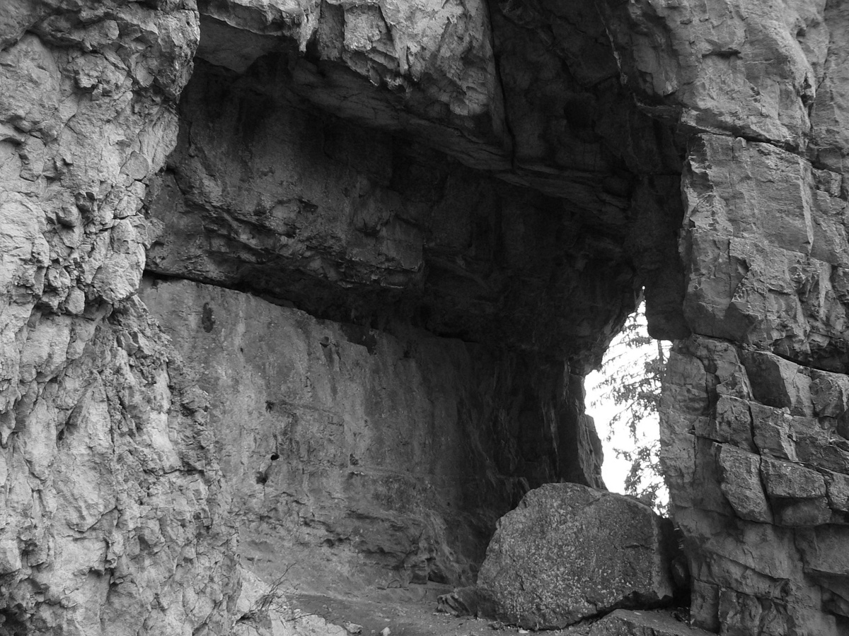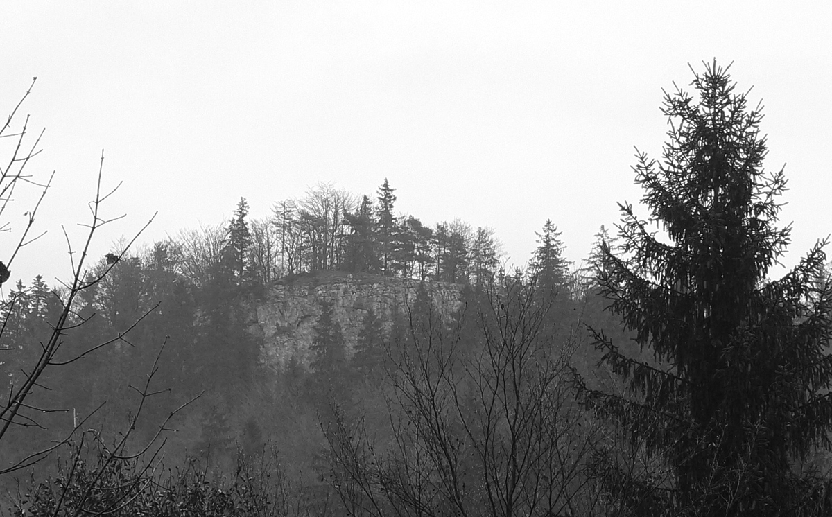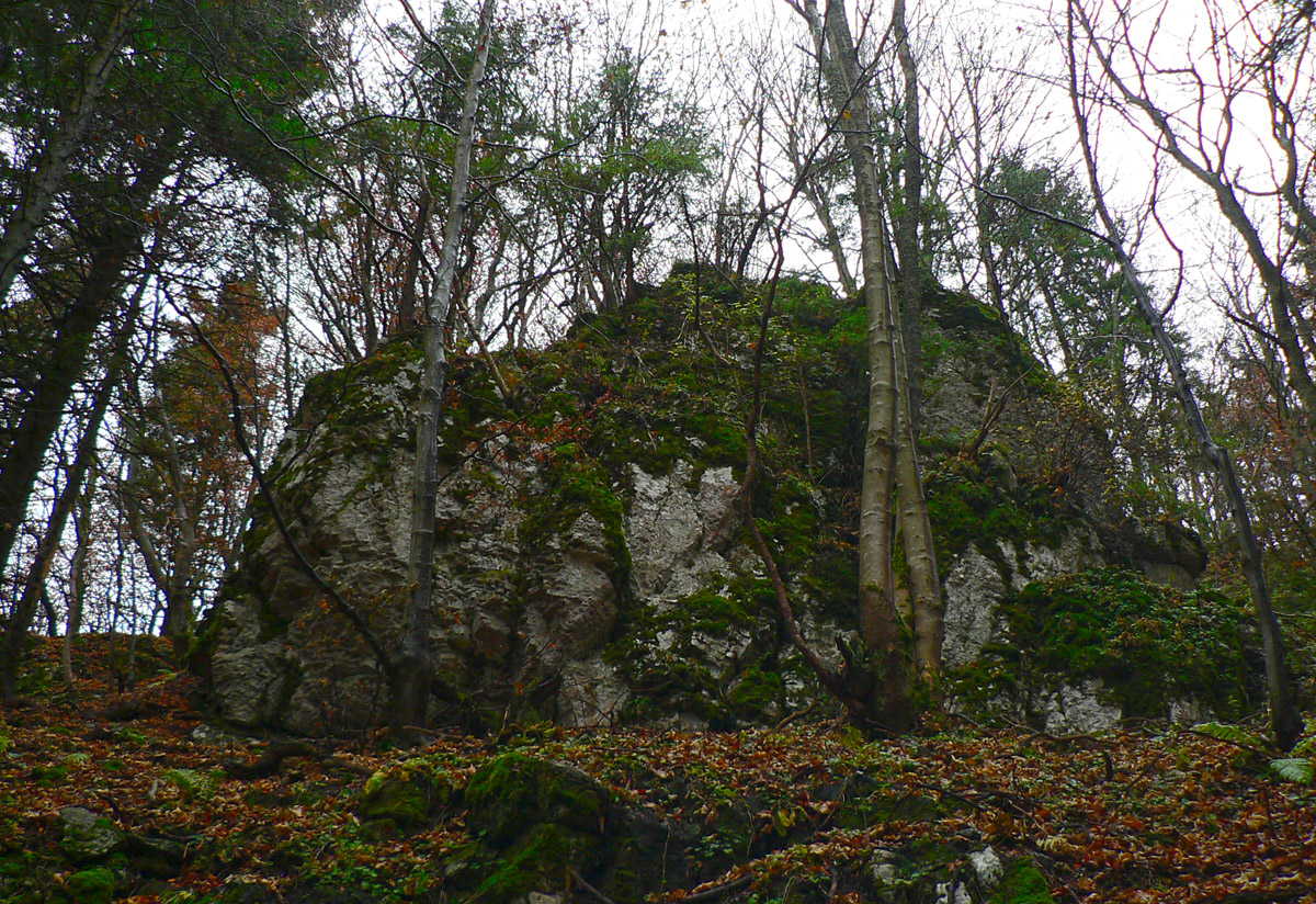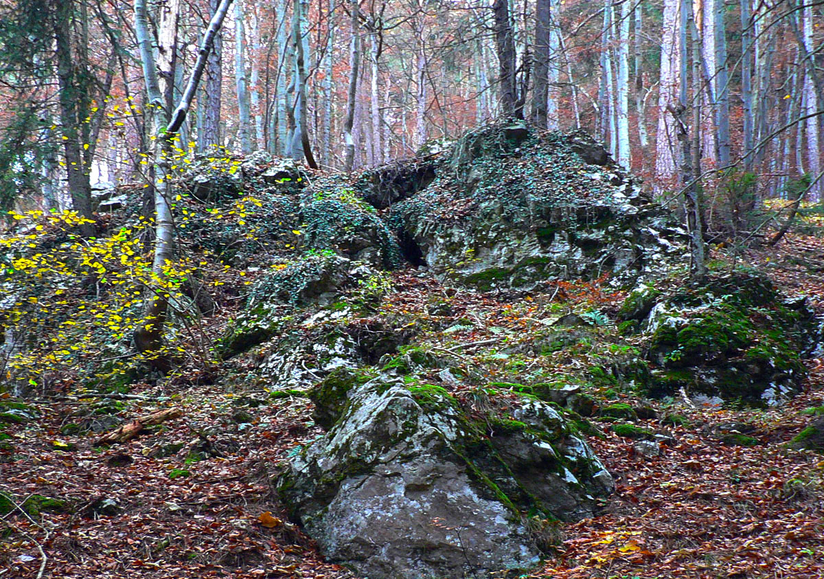 Príjemný chodník lesom po hrebienku spestrujú početné skalky a jaskynky, zo skalnej plošinky Hrdoša je výhľad naopak na západ k Šípu, dnes samozrejme len v odtieňoch sivej: