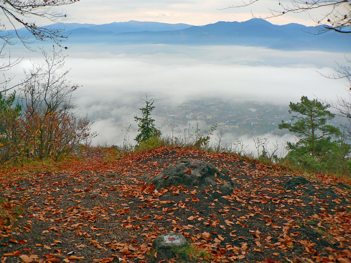 Takže na začiatok Čebrať, po červenej z RK, zo stanice. Krátko po asfalte a dlho a strmo priamo na vyhliadku Predného Čebraťa. Najprv po spádnici, vyššie príjemnejšie serpentínky, celou cestou pekné skalky v lese, zdola hluk mesta a smrad z celulózky, klasika.