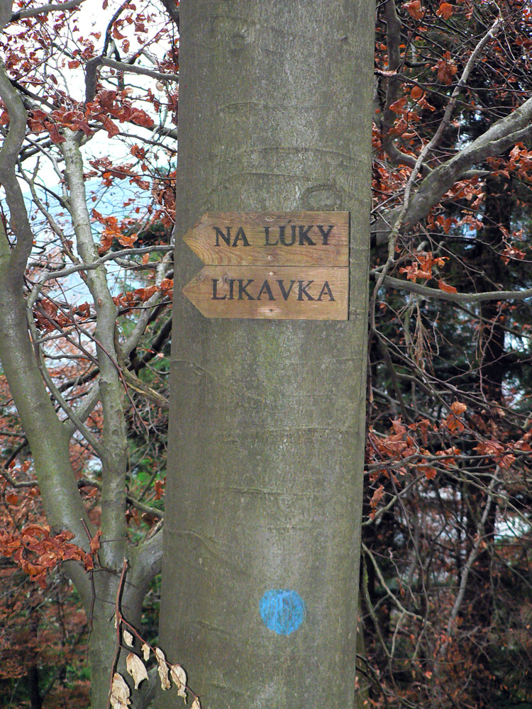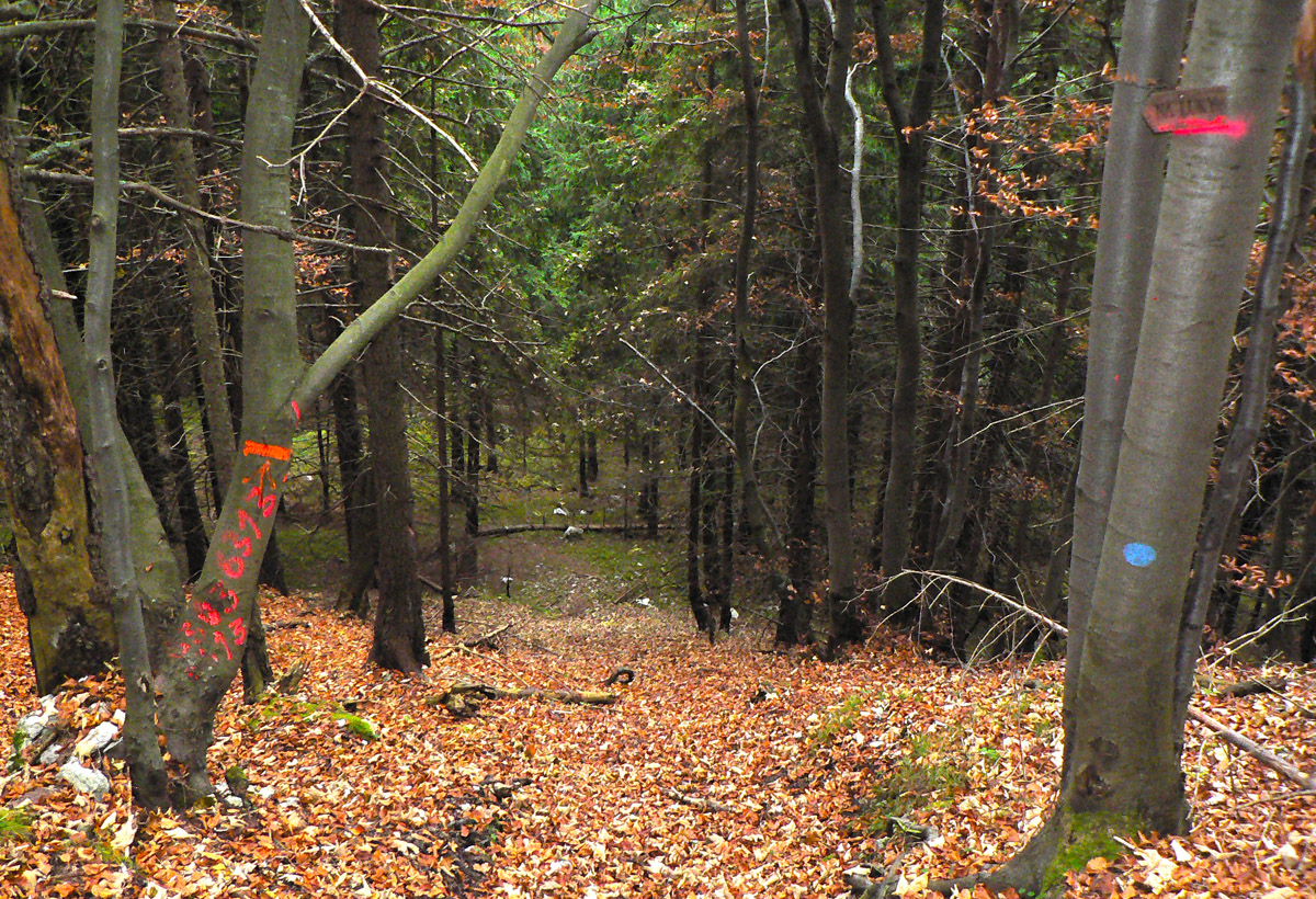 Zo zadného, zalesneného vrcholu Čebraťa vedie chodníčok už menej zreteľný, dole na Dubovské lúky. Tak aj stojí na drevenej šípke, na stromoch sú modré krúžky. Serpentínky podľa mapy by mali klesať na sever. No po tom, ako ich hneď pod vrcholom stratím a až nižšie zase nájdem, padajú na severozápad, lebo medzi stromami presvitá vrchol Radičinej. Záver je poriadne strmý, ale zase poriadne „ošípkovaný“ a vypľúva ma priamo na Dubovských lúkach, v sedle medzi senníkmi.