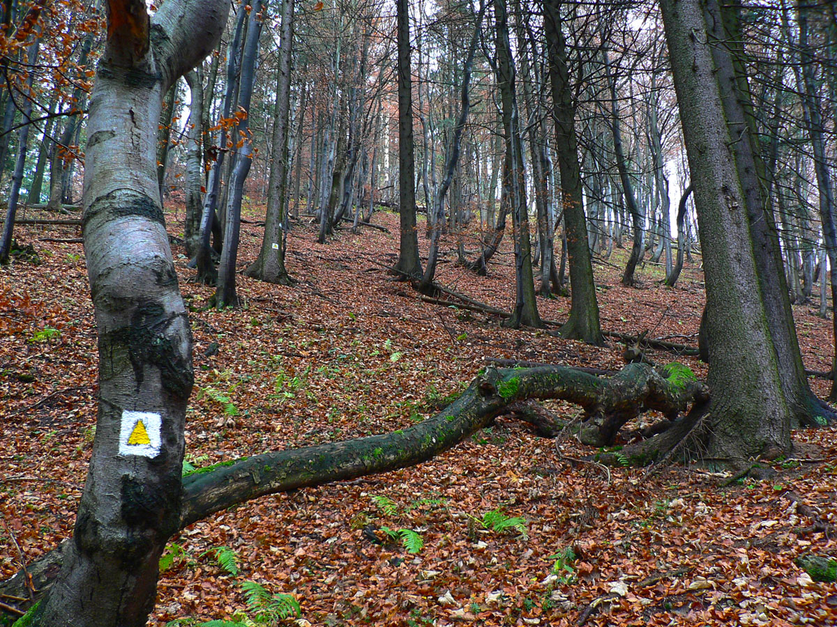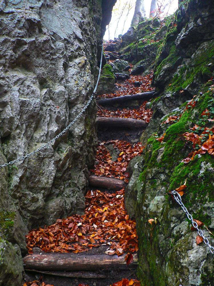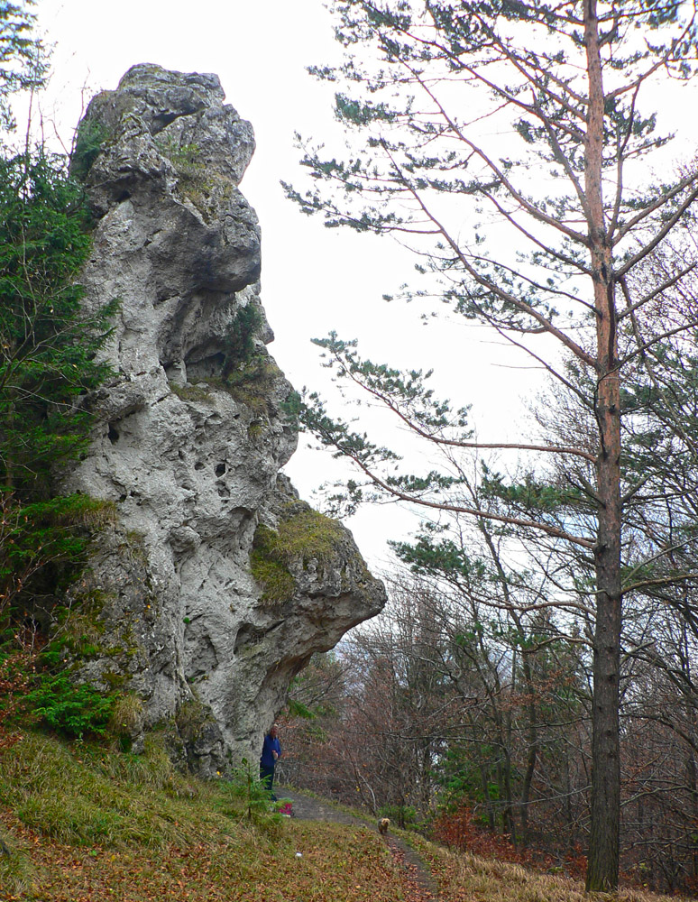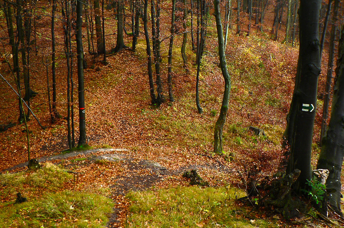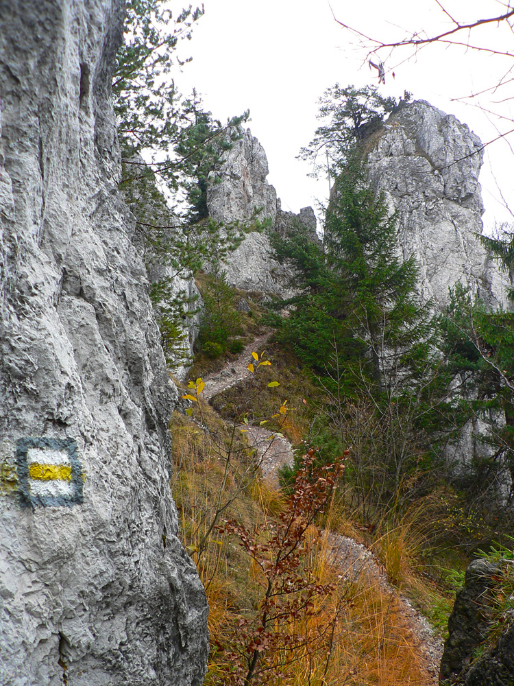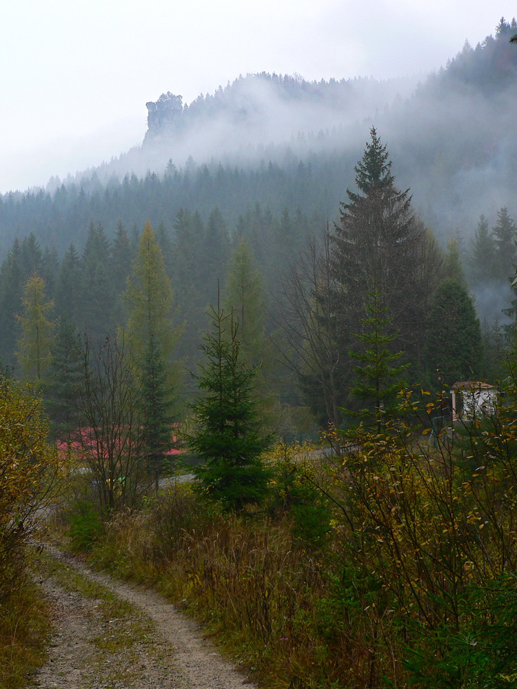 Je tu finálne stúpanie na Šíp, les ticho šumí, len z diaľky a hĺbky sem doliehajú zvuky civilizácie. Stále viac skaliek, brál, vežičiek okolo chodníka, hore známe skalné mesto s vyhliadkami a známym „testerom štíhlosti“ v skalnej štrbine, na konci drevený kríž. Aj počasie sa trochu vylepšuje, aj časovú rezervu už viem, že znovu mám.