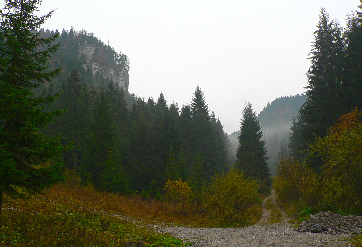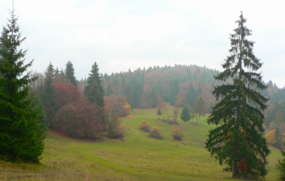 Čas ma kvôli posedávaniu pod prístreškami a motaniu pod Kečkami už trochu tlačí, tak po zvážnici do Žaškovského sedla radšej pobehnem. Aj tak na nej len blato a sem – tam voľne pohodený traktor. Cez lúky sa z juhu valia mraky, tam zas nič nevidno, ale je tam taká príjemná jesenná atmosféra v pastelových farbách.