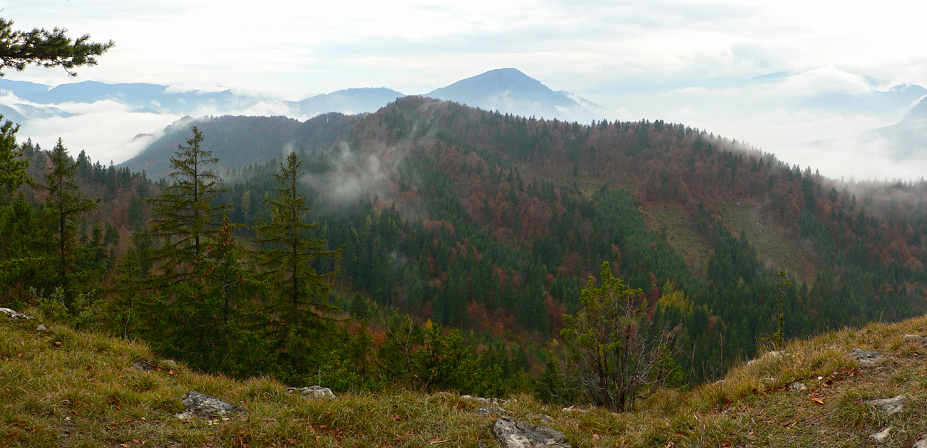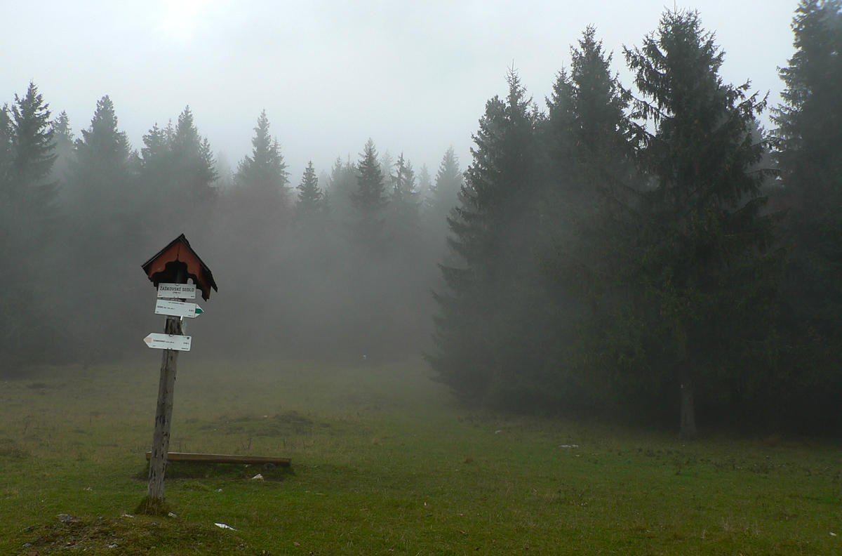 Po zostupe v malom sedielku ignorujem zabočenie zelenej značky doprava a skracujem riedkym lesom priamo v ústrety zďaleka viditeľným žltým značkám. Prudko sa štverajú na Ostrô. Zase husto kvapčí, dookola nič poriadne nevidno, tak hore ignorujem aj šípku k vyhliadke na Švošov, len sa pomocem, pozriem na zadekovaný dolný Liptov a valím nazad dole.
