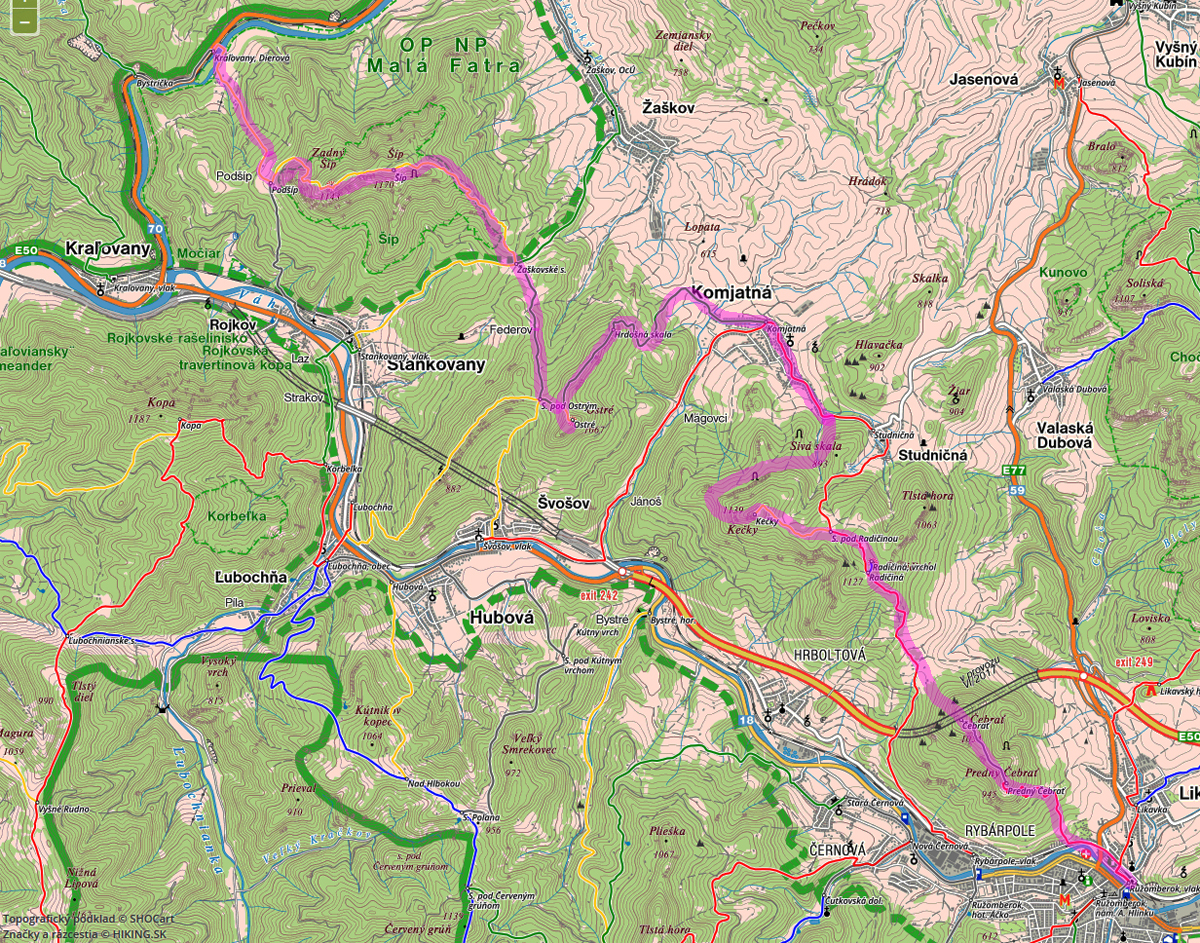 Šípska Fatra je najsevernejší podcelok Veľkej Fatry, už mimo územia národného parku. Len niekoľko maloplošných chránených území je tu, ale jej krajina je veľmi príjemná pre oko aj nohy: nie veľmi poznačená masívnou ťažbou dreva (zatiaľ?) a husto vyzdobená krasovým reliéfom. Bralami, vežičkami, ale aj závrtmi a jaskyňami. Väčšinou lesné chodníky, málo zvážnic aj asfaltu. Váh medzi Ružomberkom a Kraľovanmi ju „prepílil“ na dve časti. Tak tú severnejšiu, medzi Čebraťom a Šípom, som sa snažil prepojiť súvislou čiarou do takej „sťaby hrebeňovky“, aby som vyliezol na všetky jej hlavné vrcholy. S trochou improvizácie (mimo značiek) žiadny problém. Akurát pod Kečkami trochu motania, ale o tom nižšie. Tu je mapa (https://mapy.hiking.sk):
