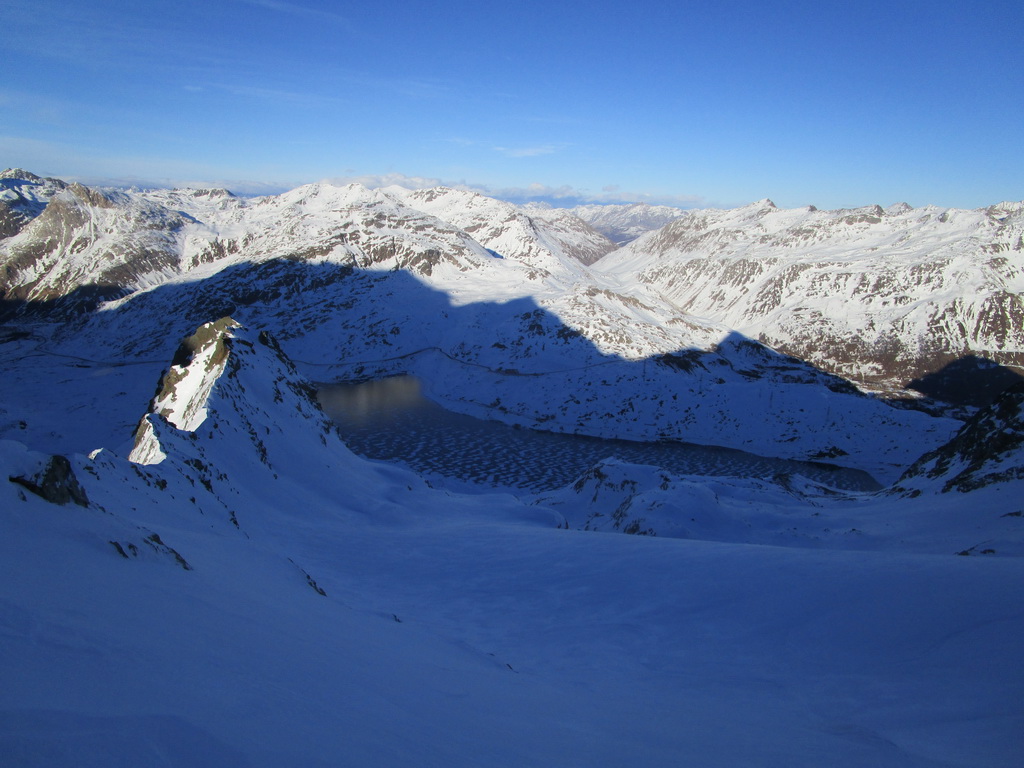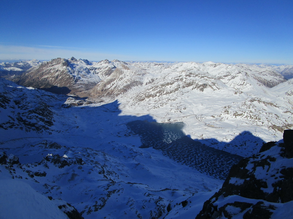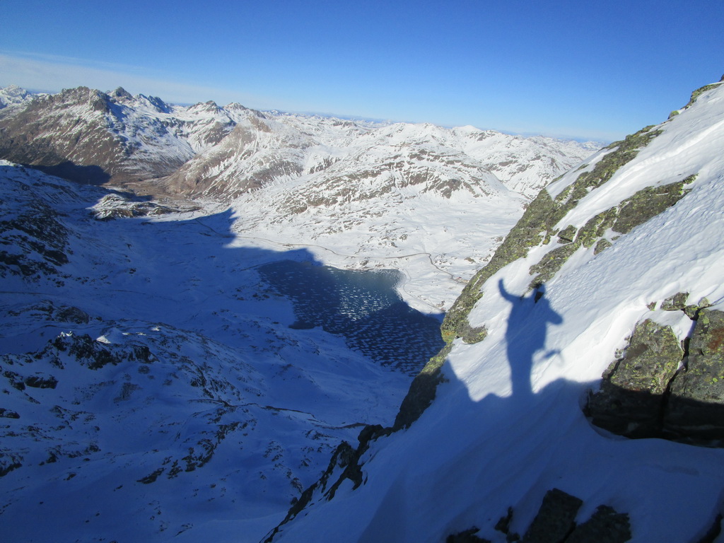 Lyže ma ostali čakať v sedle, na vrchol sa im nechcelo... Táto selfie vznikla asi v polovici hrebeňa vedúceho na vrchol. Štartoval som približne z miesta kde tieň začína prekrývať cestu. V údolí vidieť Lago Bianco aj jeho tmavý ľad.