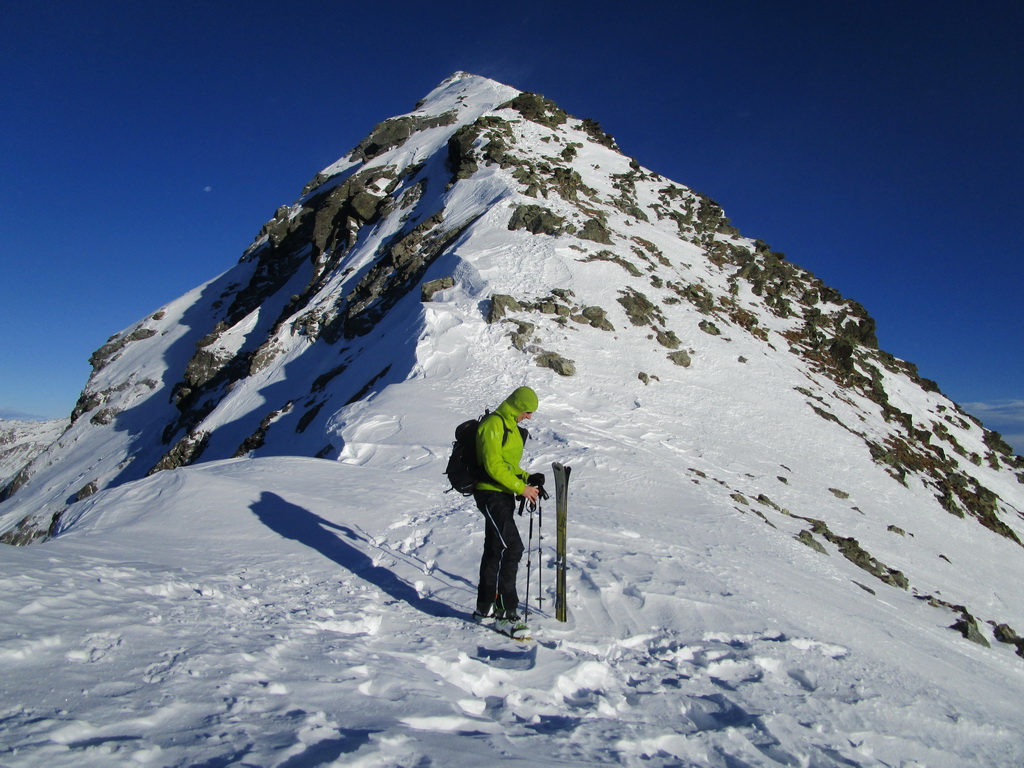 Pri zostupe som vyzdvihol lyže v sedielku a pokračoval s nimi na chrbte po hrebeni na opačnú stranu. Zakrátko som sa dostal na tzv ski-vrchol z ktorého sa v dobrých podmienkach lyžuje. Ešte kúsok som zbehol na mačkách a potom už nasledoval zjazd naspäť. V hornej časti sú dokonca zvyšky ľadovčeka. Sneh tu bol celkom príjemný. V spodnej časti zjazdu už bolo tvrdo. Šúchal som dole ako sa len dalo. Pre zjazd som nezvolil výstupovú trasu lebo sa mi najstrmšie miesto zdalo moc ľadové ale chcel som si aj pri zjazde pozrieť tú miernejšiu variantu...