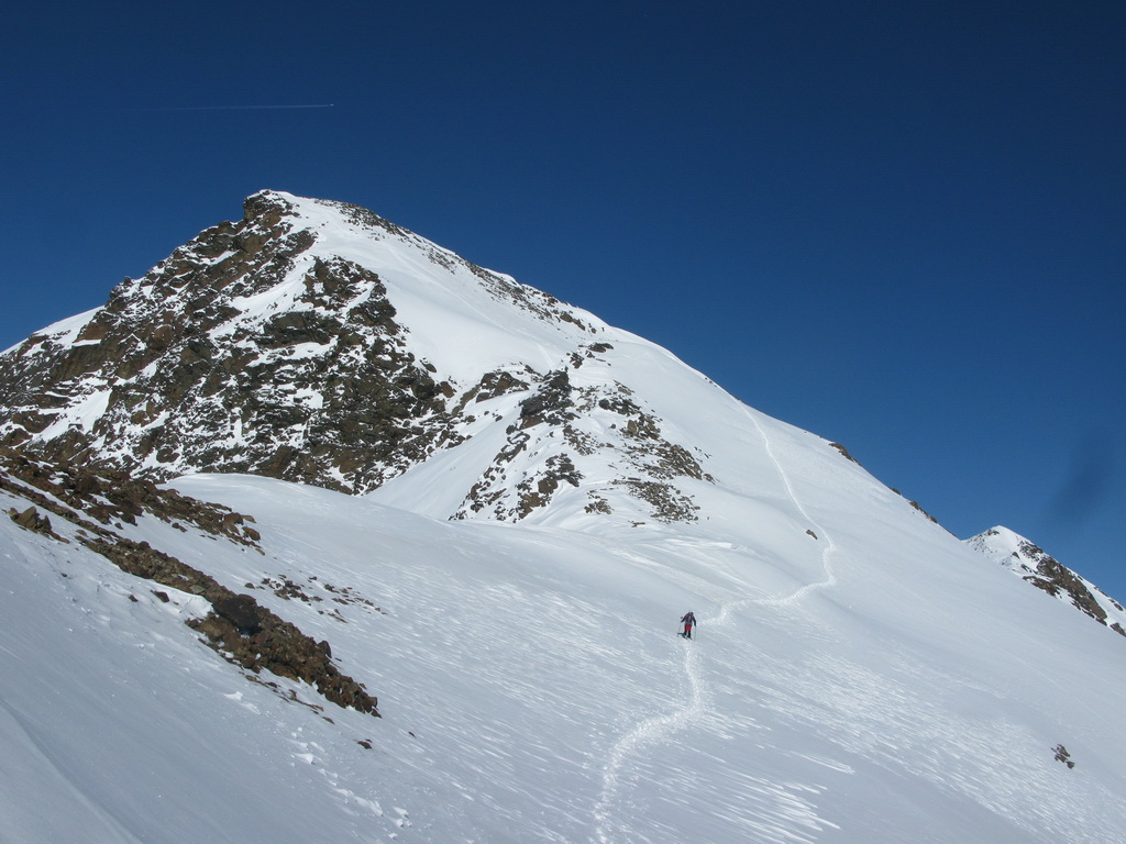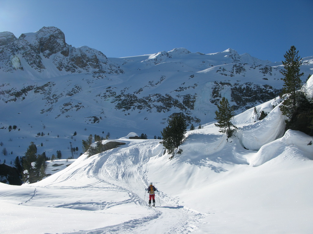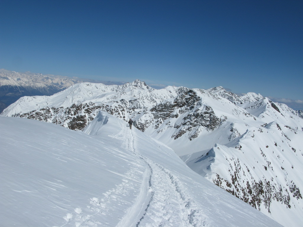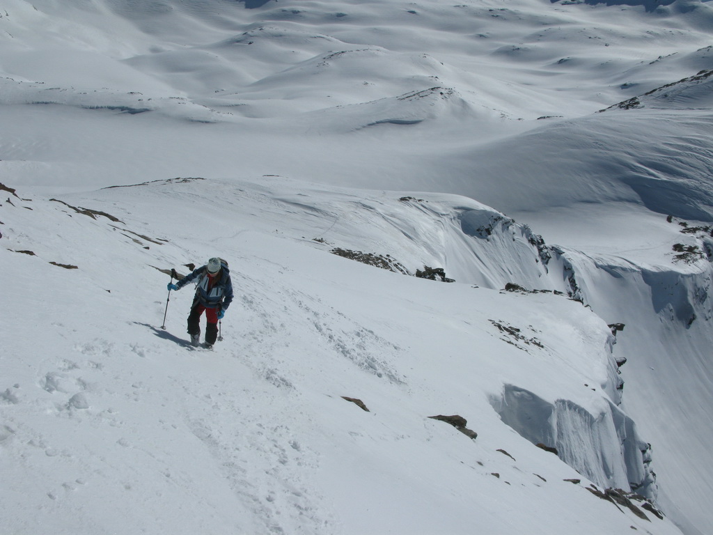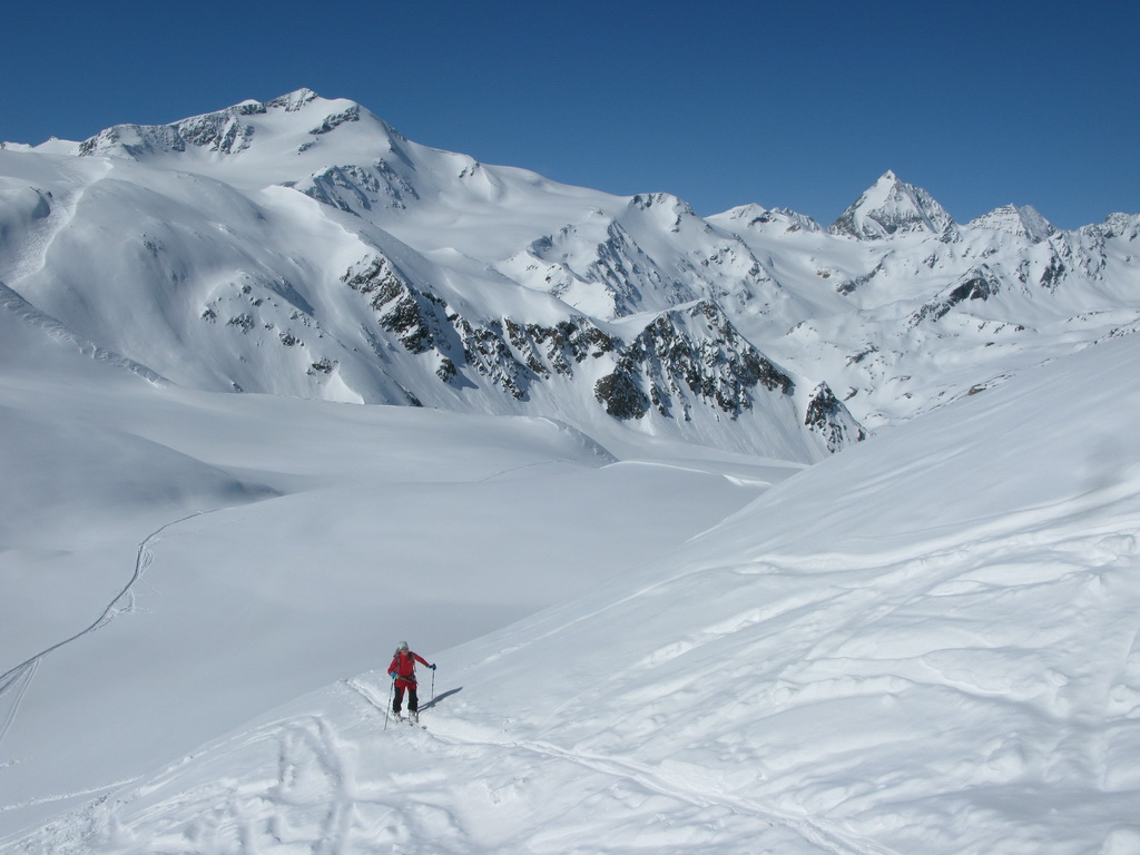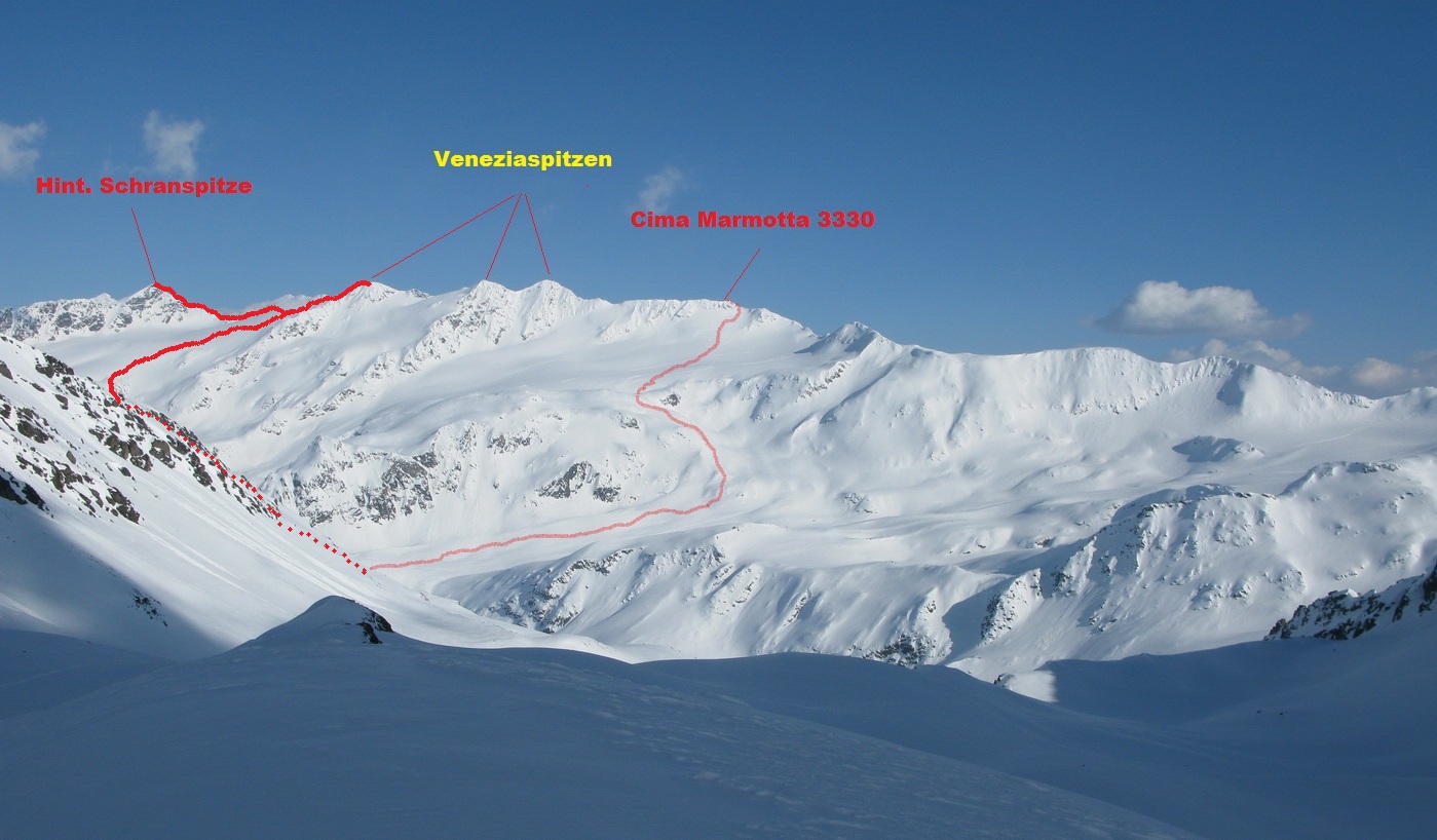 Od Martellerhütte pokračuje stúpanie strmým traverzom. Stopu sme mali dobrú, v oblasti sa koncom marca pohybovalo množstvo skialpinistov. Jednak kôli pretekom Marmotta Trophy ale hlavne preto, že dostatok snehu bol túto zimu len na južnej strane Álp. Po kvalitnej stope a v super počasí sme pokračovali vo výstupe na východný Veneziaspitze 3356m. . Už počas výšlapu som si všimol rozsiahlu nepolyžovanú plochu s ideálnym sklonom pokrytú množstvom čerstvého prašanu. Až pôjdeme dole určite to už bude polyžované, pomyslel som si.