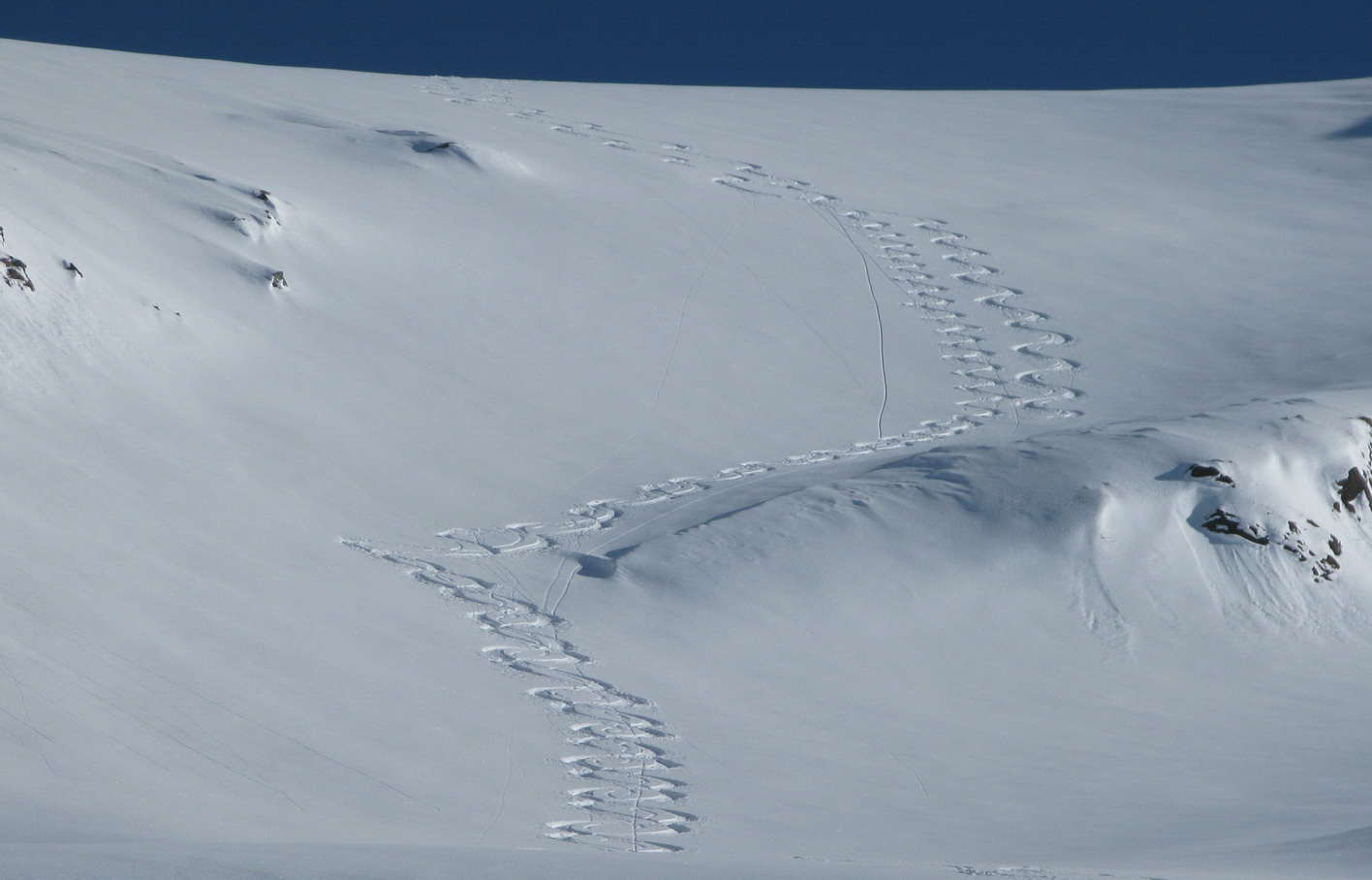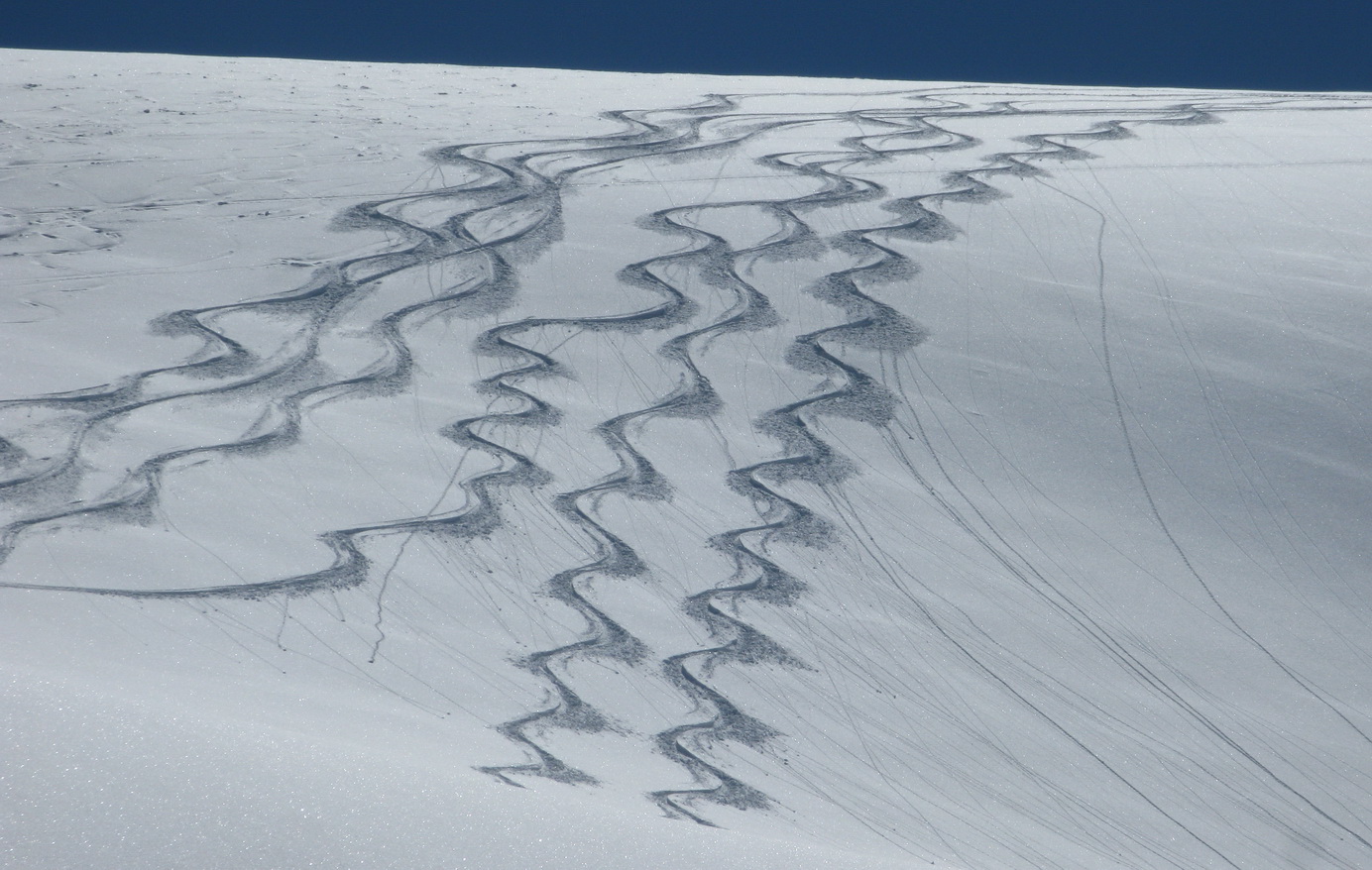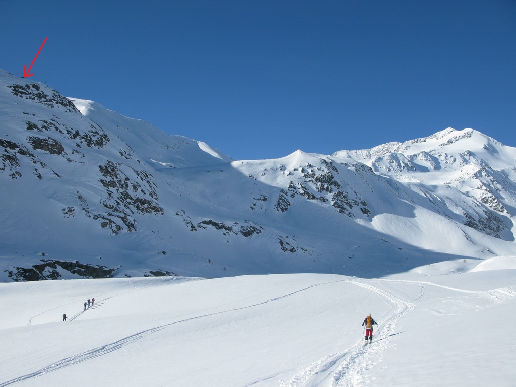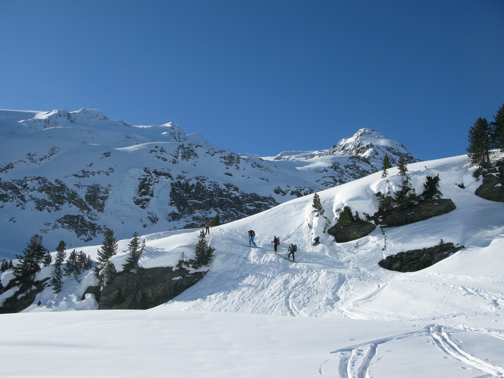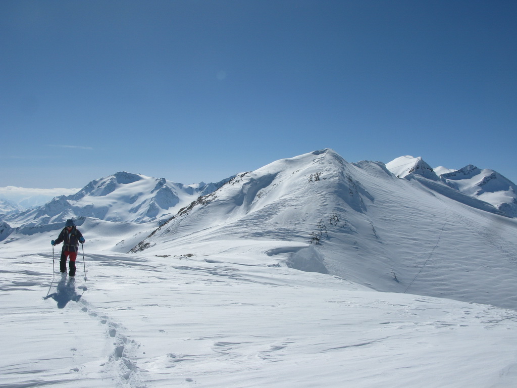 Od Martellerhütte pokračuje stúpanie strmým traverzom. Stopu sme mali dobrú, v oblasti sa koncom marca pohybovalo množstvo skialpinistov. Jednak kôli pretekom Marmotta Trophy ale hlavne preto, že dostatok snehu bol túto zimu len na južnej strane Álp. Po kvalitnej stope a v super počasí sme pokračovali vo výstupe na východný Veneziaspitze 3356m. . Už počas výšlapu som si všimol rozsiahlu nepolyžovanú plochu s ideálnym sklonom pokrytú množstvom čerstvého prašanu. Až pôjdeme dole určite to už bude polyžované, pomyslel som si.