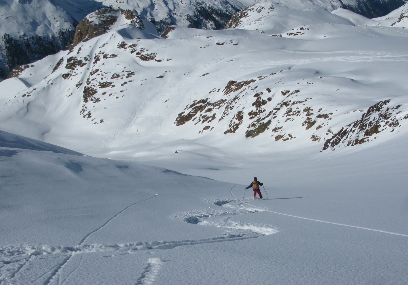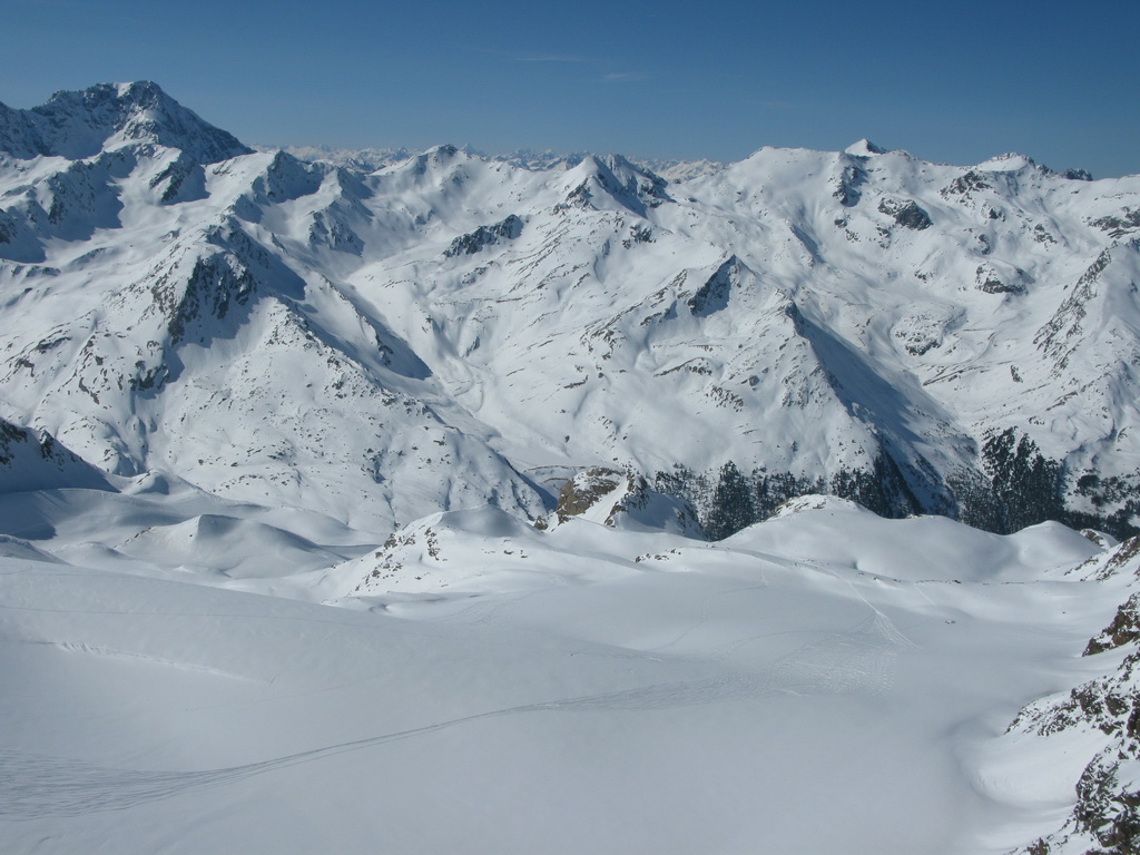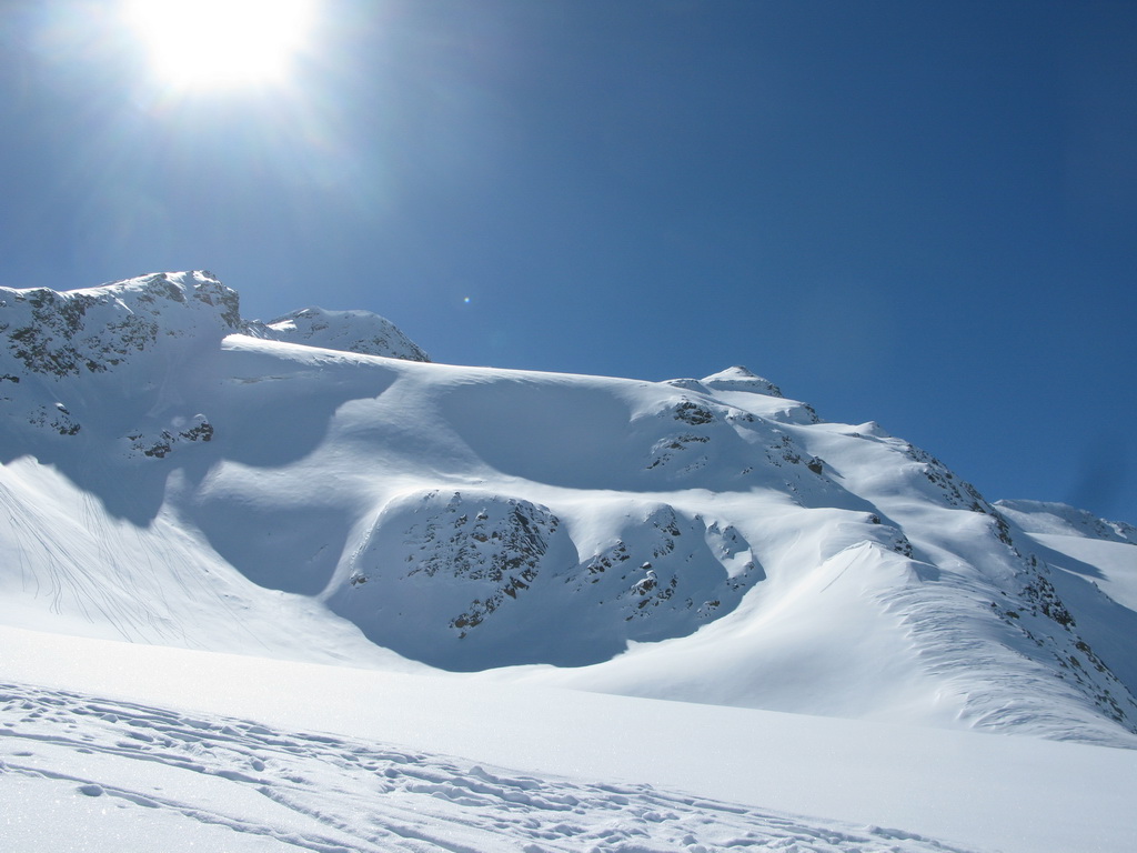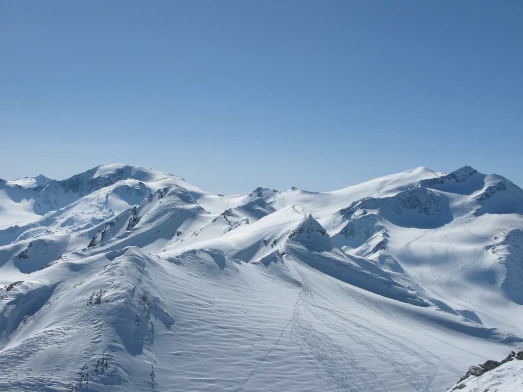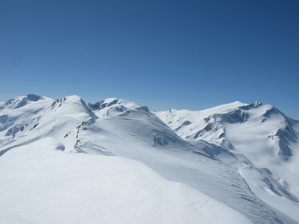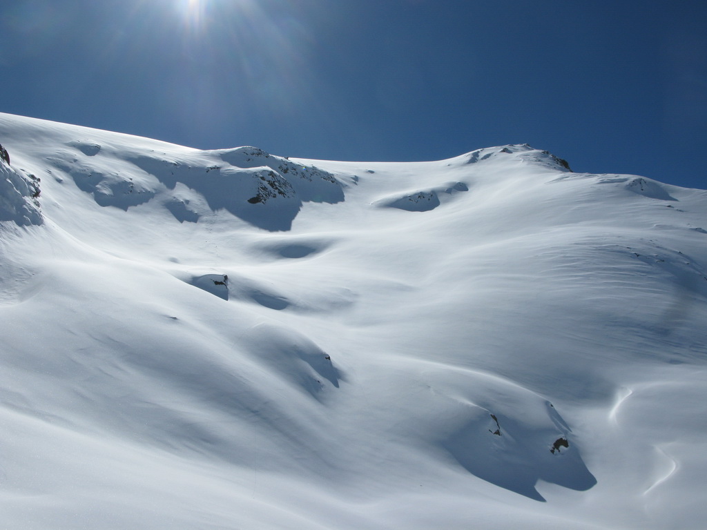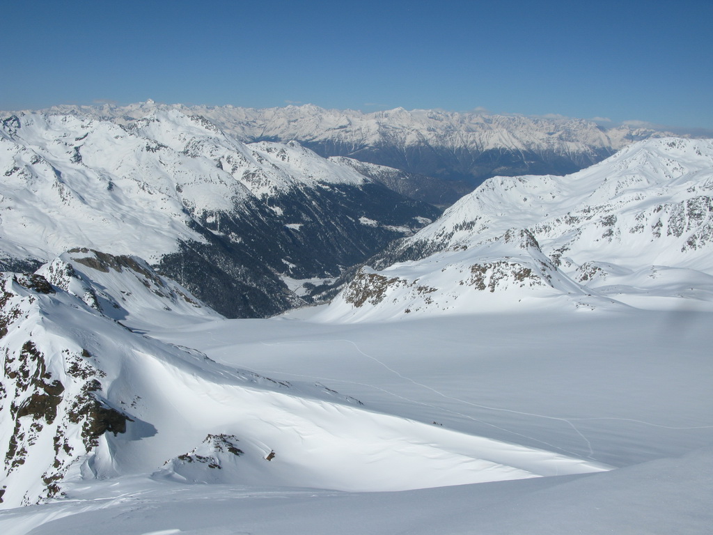 No nechoď tam... a tak sme išli. Traverzli sme. Lyže sme nechali opäť pod vrcholom a netrvalo dlho a nový vrchol nám ukázal nové krásne výhľady. Po ceste späť sme sa vrátili do sedielka pod Veneziaspitze. Čakal na nás panenský svah. Ktovie prečo tadiaľto nikto nelyžoval? Obzeral som si to poriadne už z dola. Intuícia hovorila že to bude ok. Bolo to lepšie... :)