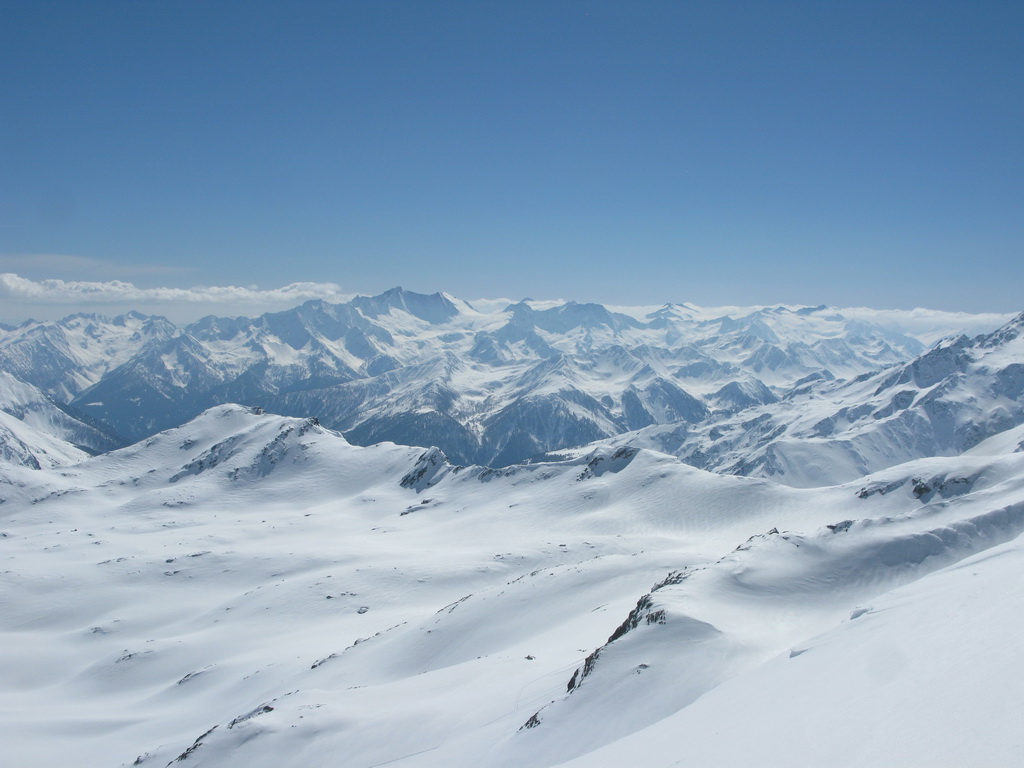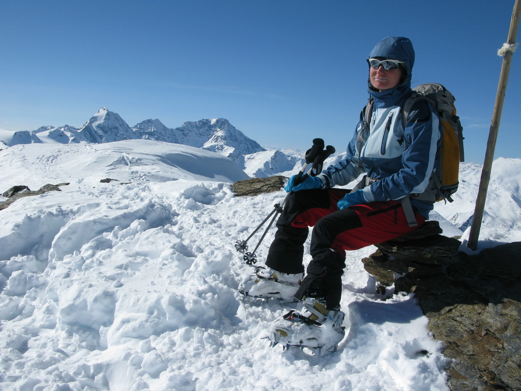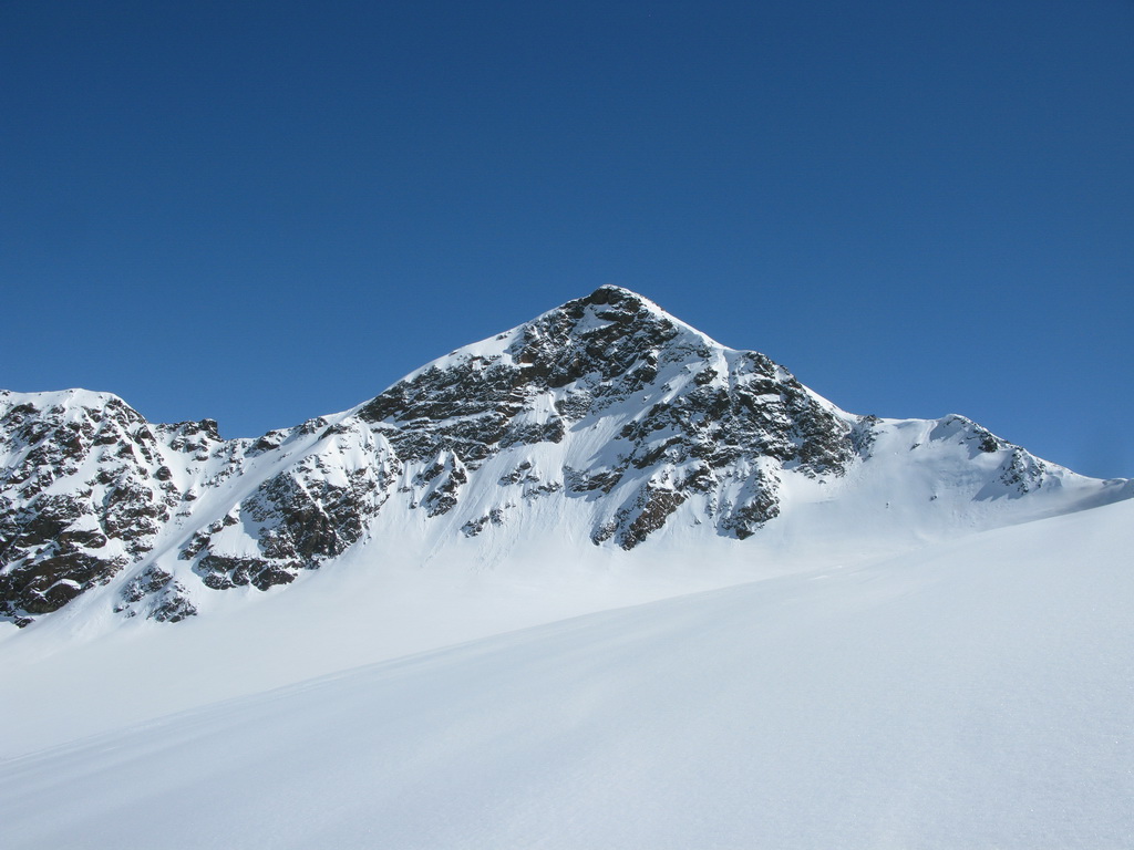 Najprv nás však ešte čakal výšlap po rozsiahlych pláňach ľadovca. Trhliny sme nezaznamenali žiadne. V sedielku pod vrcholom sme stretli skupiny francúzskych skialpinistov. Väčšinou už boli v dôchodkovom veku. Stretnúť na lyžiarskych túrach niekde hore mladších ľudí je naozaj vzácnosť. Pod vrcholom sme si nechali lyže a vybehli hore peši. Pokochali sa výhľadmi a pohľad nám padol na pyramídu smerom na východ - Hintere Schranspitze 3357m .