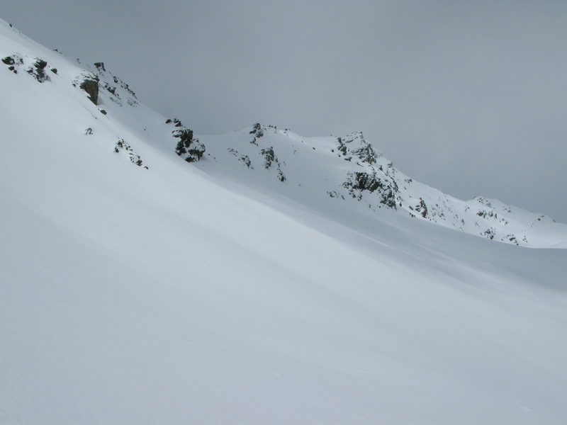 Pomaly naberám výšku a slnko presvitá stále viac. Tesne pod hrebeňom začujem hlasy, pozriem hore a uvidím oproti lyžovať skupinku ľudí. Prešli okolo, ani nepozdravili. Mali veľké batohy a na sebe ešte aj sedačky. Prichádzam do sedla a obzerám sa, odkiaľ prišli. Stopa ide z dola, neboli teda ani na vrchole.