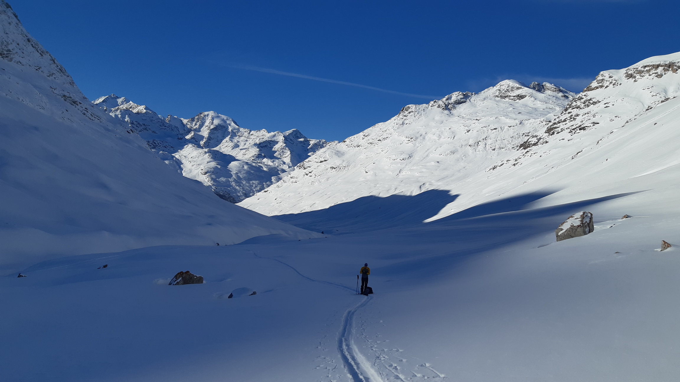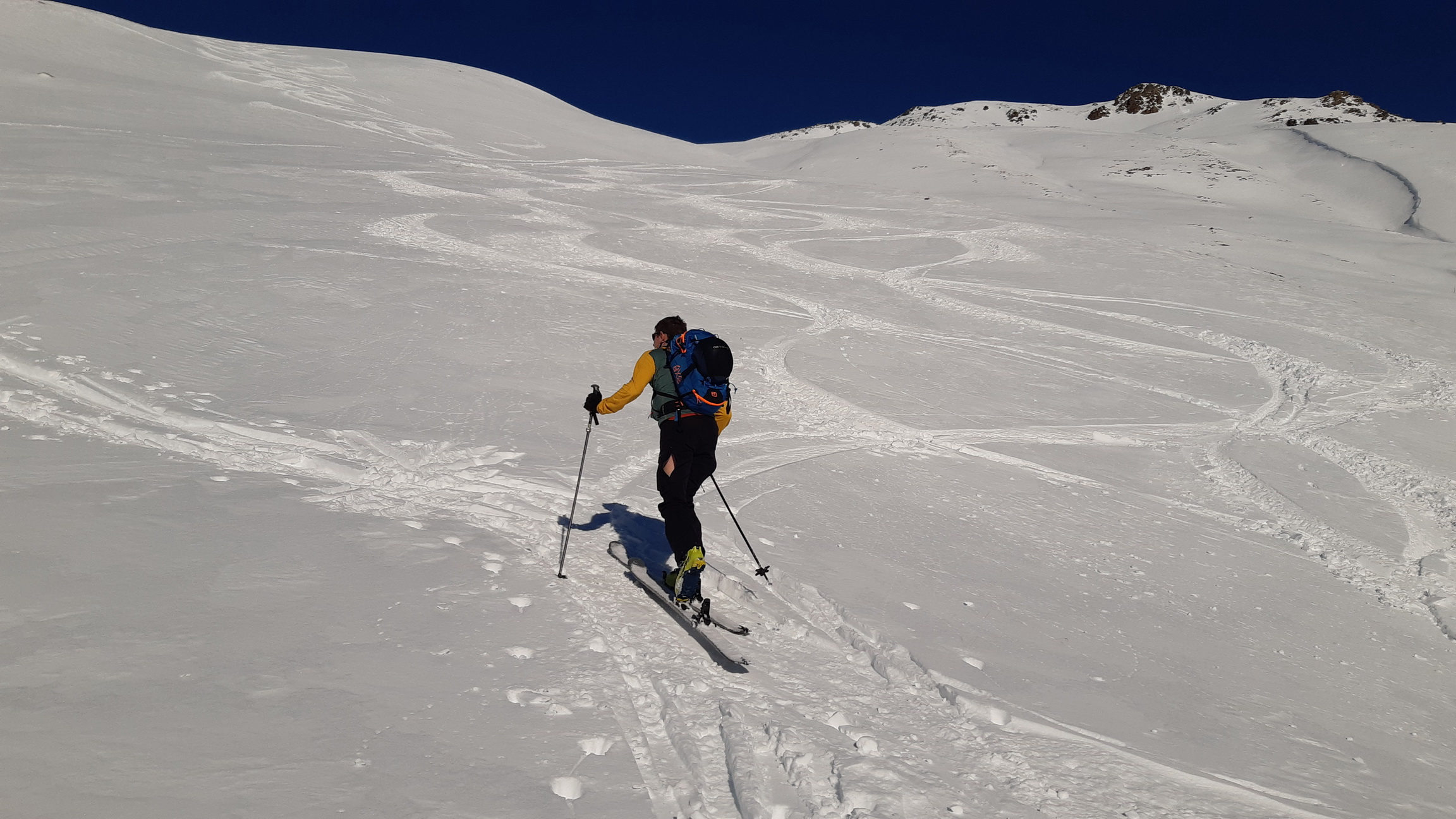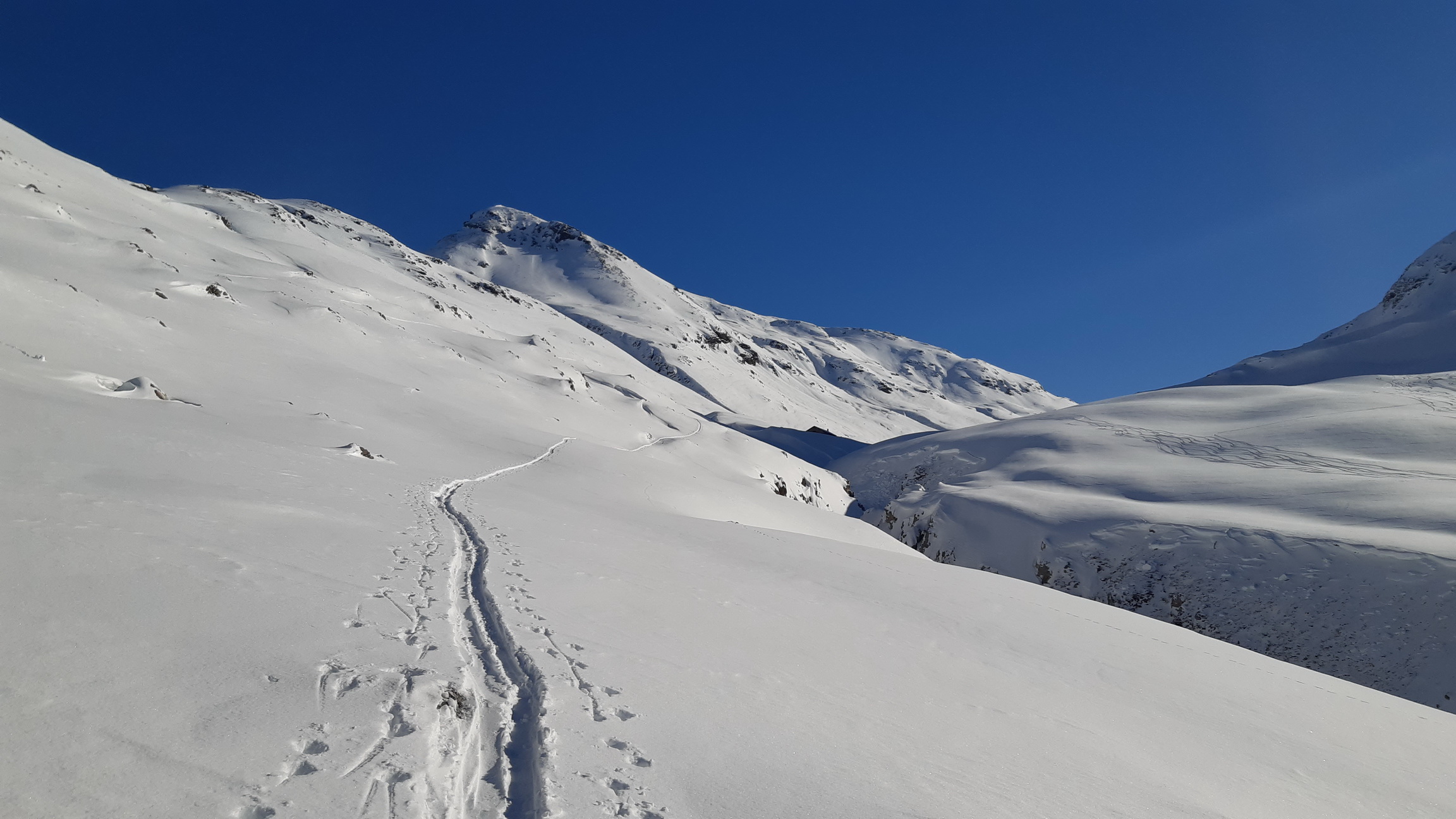 Vyrážame do Val da Fain a rozhliadame sa po cieľoch. Dolinou prídeme až dozadu ku Alp la Stretta a odtiaľ odbočujeme vľavo smer Piz Cantun. Máme stopu, ktorá nám spríjemňuje stúpanie, tá ale neskôr končí a ďalej už prešlapávame svoju. Snehové podmienky sa po nedávnom snežení výrazne zlepšili a na tvrdom podklade je stále kvalitný prašan, povrch kôrnatie zatiaľ iba na tých najnasvietenejších svahoch.
