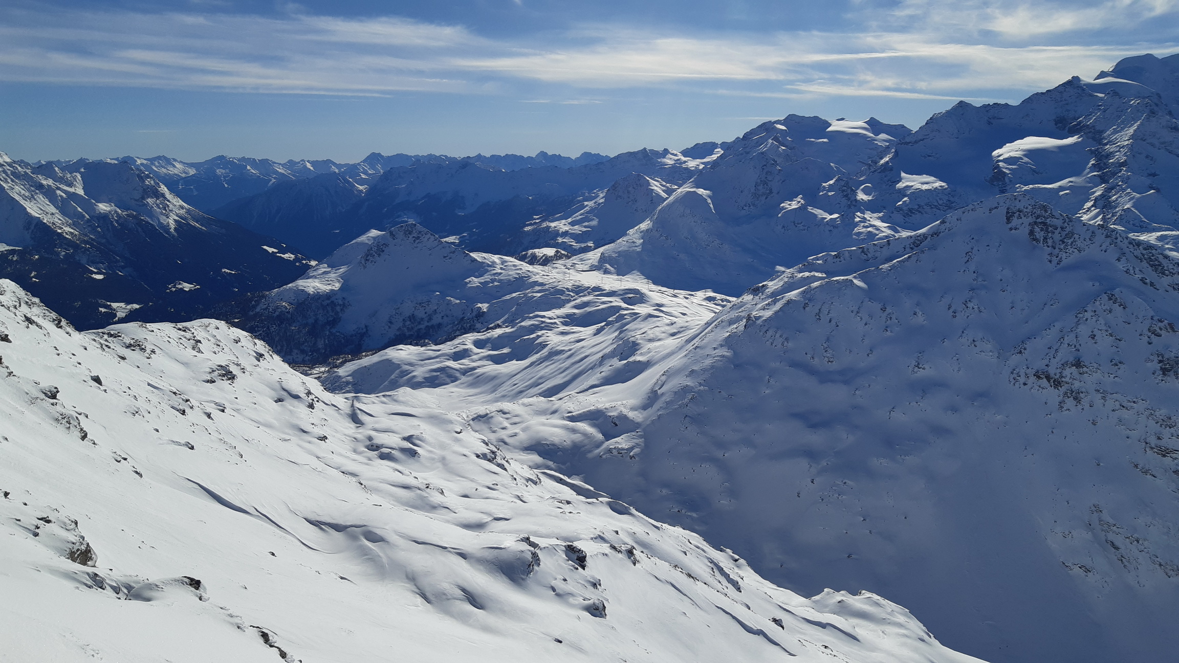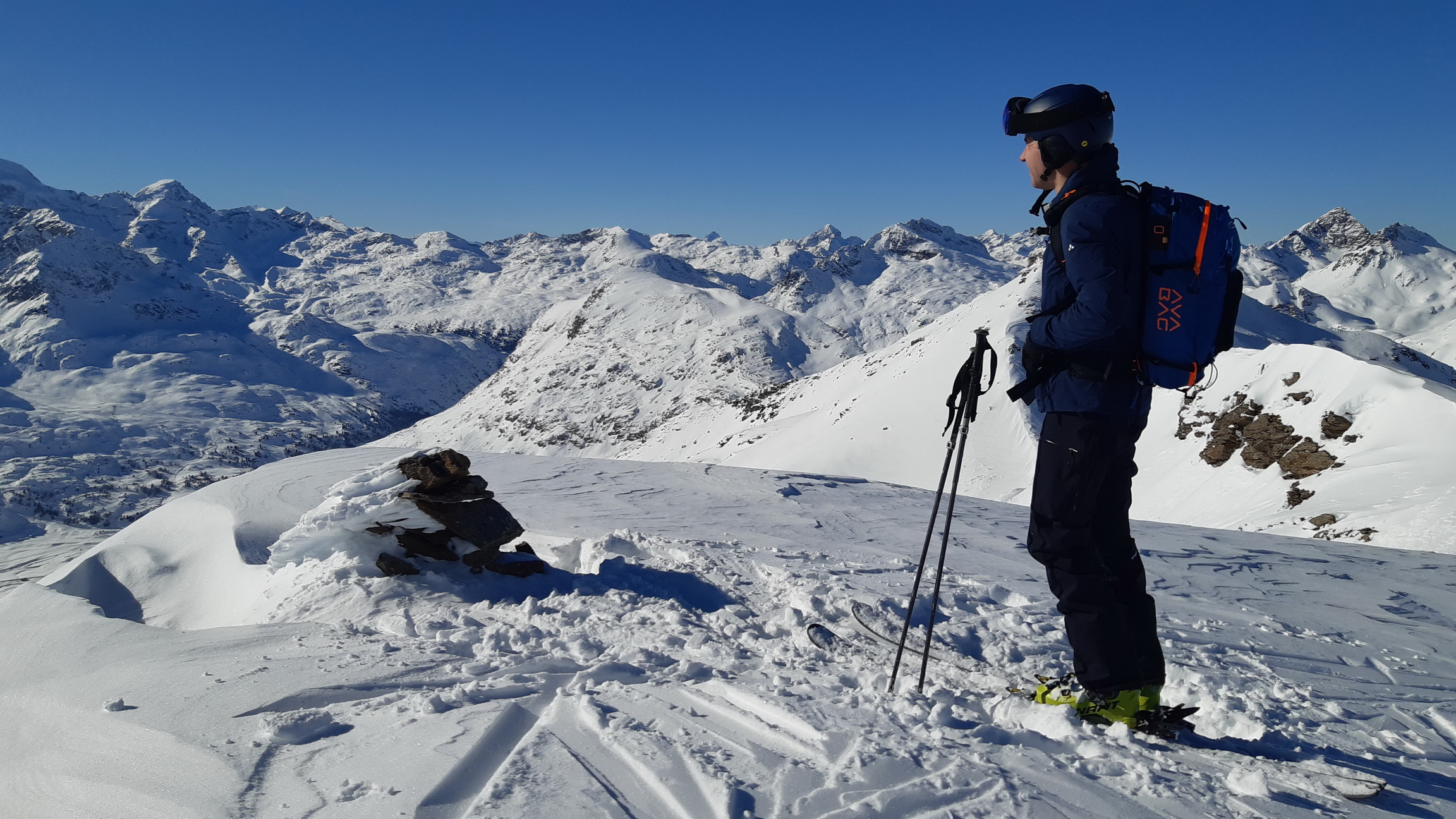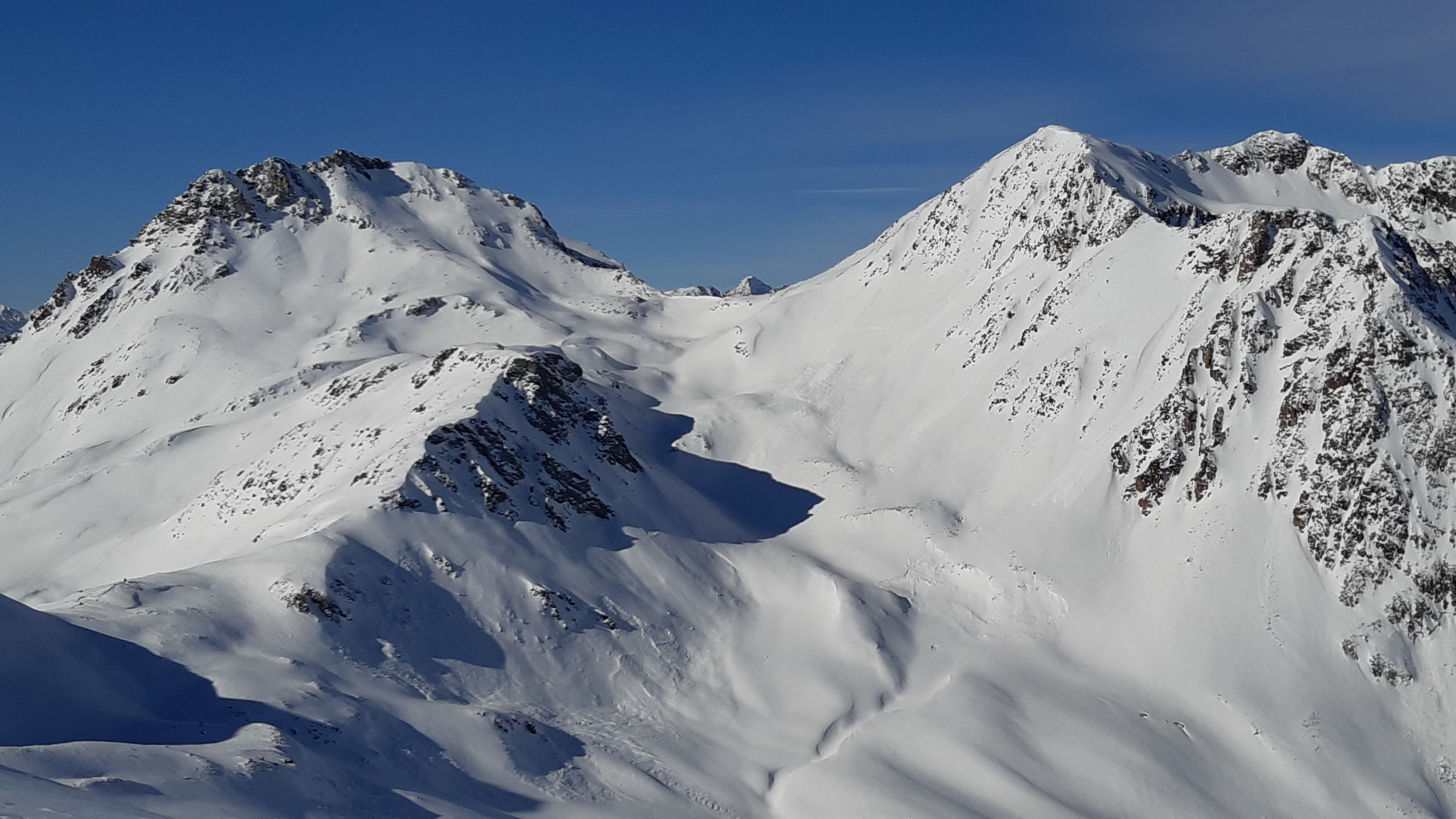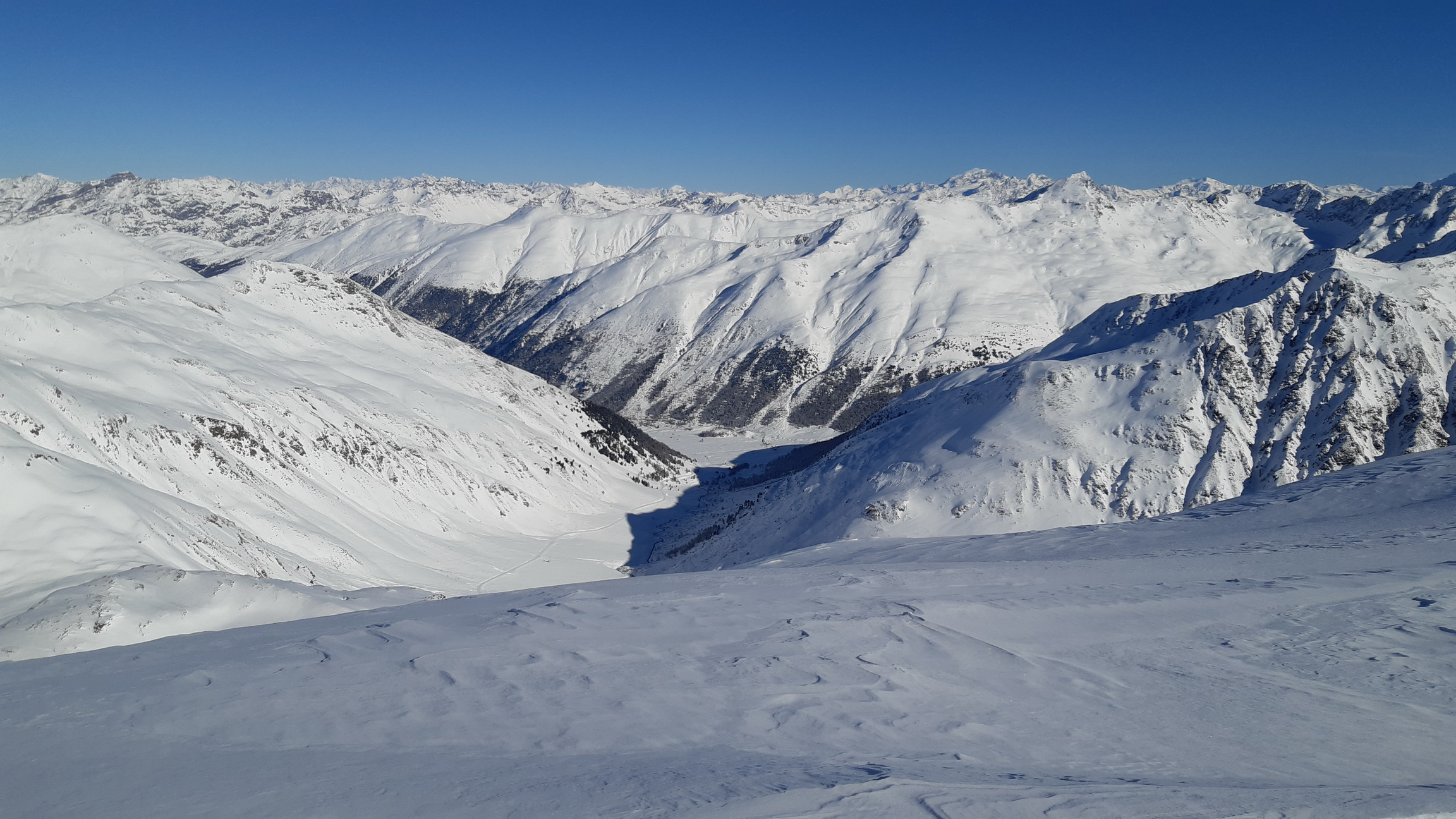 Prichádzame na vrchol, z Piz Cantun report už mám (odklik pod článkom) obzeráme sa čo ďalej. Pôvodný plán zlyžovať niečo do Val Chamuera zavrhujeme a lyžujeme späť popri výstupovej stope parádnym prašanom až ku Alpu do Val da Fain. Tu nalepíme pásy a prešlapávame stopu opačným smerom pod Piz Minor, na križovatke sa napájame na hlavnú výstupovú stopu vedúcu na tento najčastejšie navštevovaný vrchol oblasti. Pod ním sa ale rozhodujeme zájsť kúsok ďalej a vystúpiť na Piz dals Lejs. Po klasických parádnych výhľadoch lyžujeme nazad popri výstupovej stope. Na križovatke tentoraz odbočujeme vľavo. Nalepíme pásy tretí raz a zamierime na dnešný tretí vrchol Piz Alv. (report pod čl.)