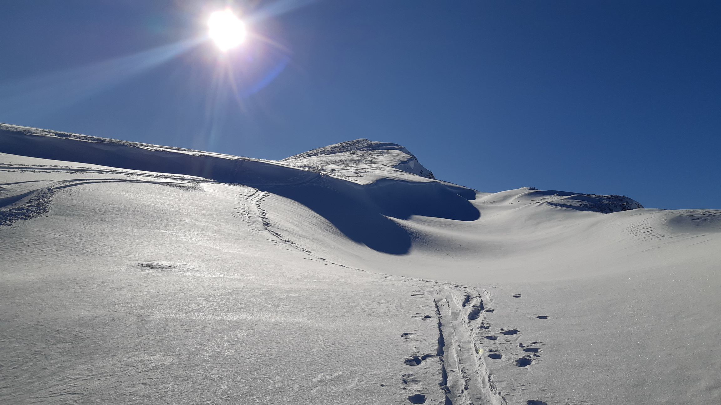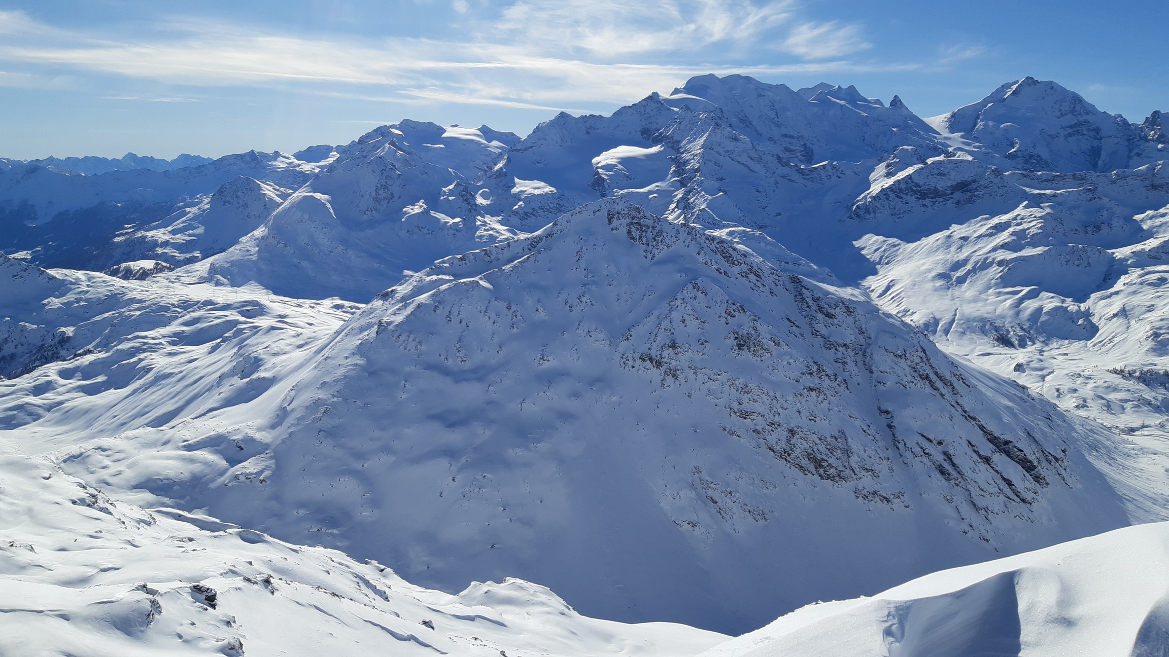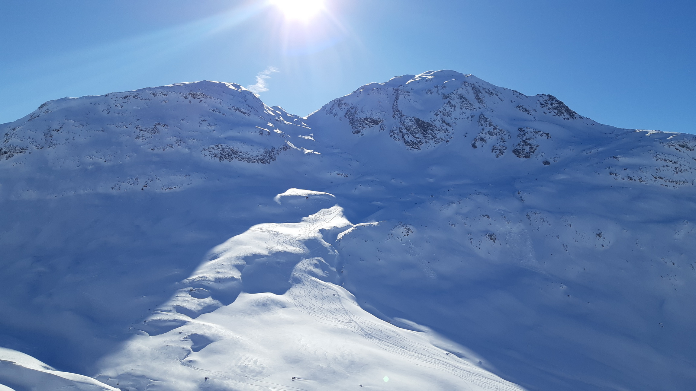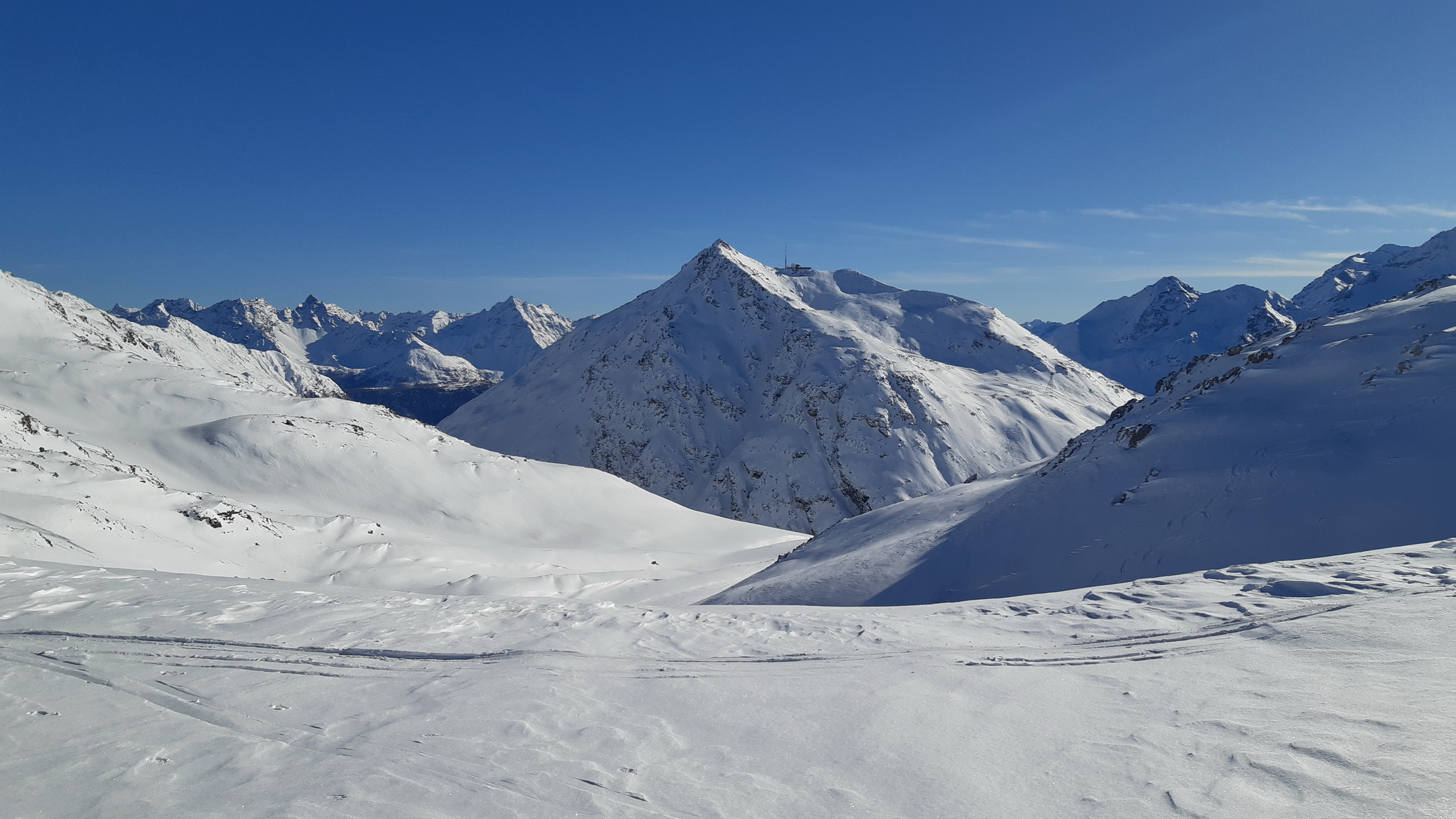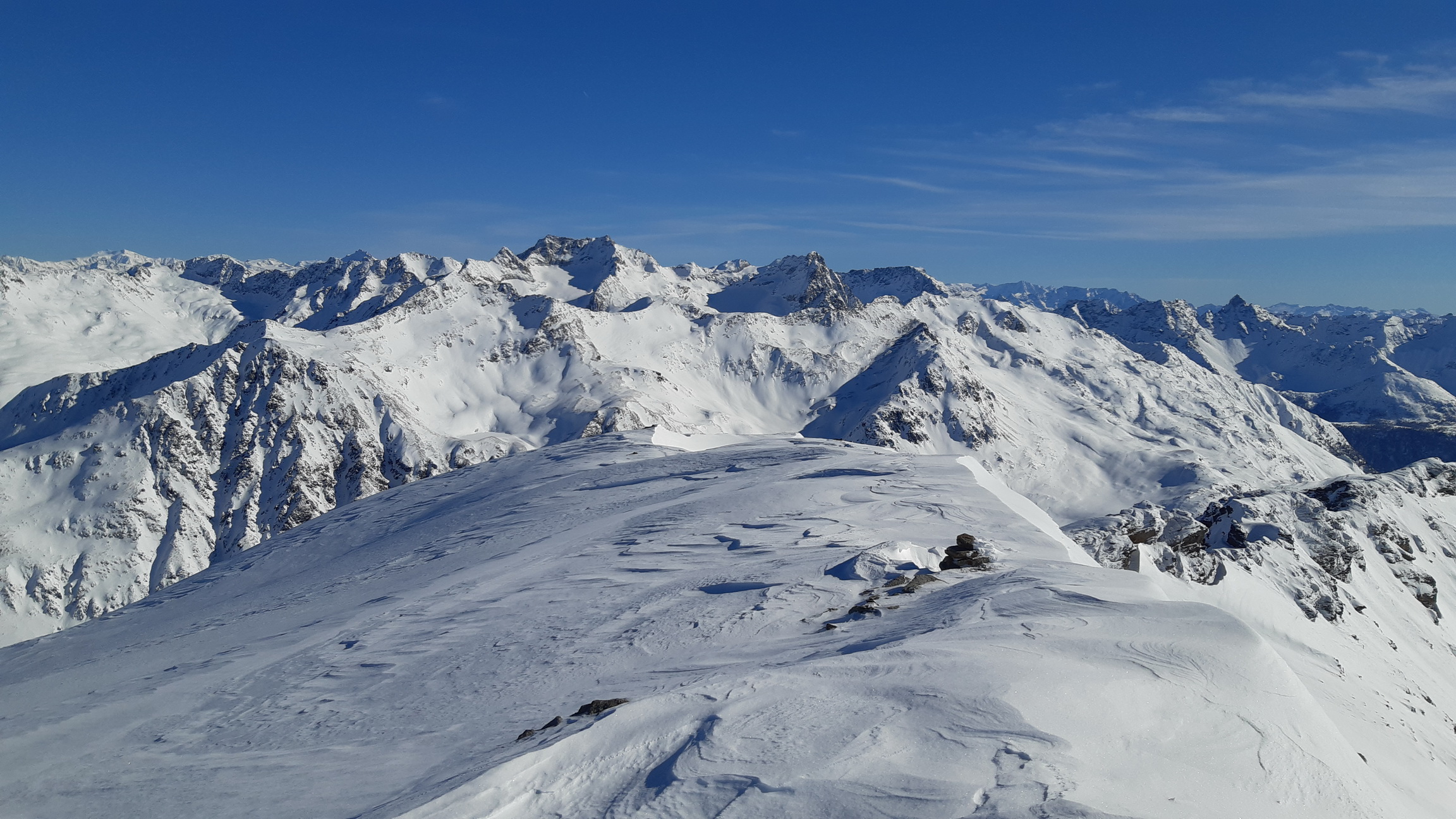 Prichádzame na vrchol, z Piz Cantun report už mám (odklik pod článkom) obzeráme sa čo ďalej. Pôvodný plán zlyžovať niečo do Val Chamuera zavrhujeme a lyžujeme späť popri výstupovej stope parádnym prašanom až ku Alpu do Val da Fain. Tu nalepíme pásy a prešlapávame stopu opačným smerom pod Piz Minor, na križovatke sa napájame na hlavnú výstupovú stopu vedúcu na tento najčastejšie navštevovaný vrchol oblasti. Pod ním sa ale rozhodujeme zájsť kúsok ďalej a vystúpiť na Piz dals Lejs. Po klasických parádnych výhľadoch lyžujeme nazad popri výstupovej stope. Na križovatke tentoraz odbočujeme vľavo. Nalepíme pásy tretí raz a zamierime na dnešný tretí vrchol Piz Alv. (report pod čl.)