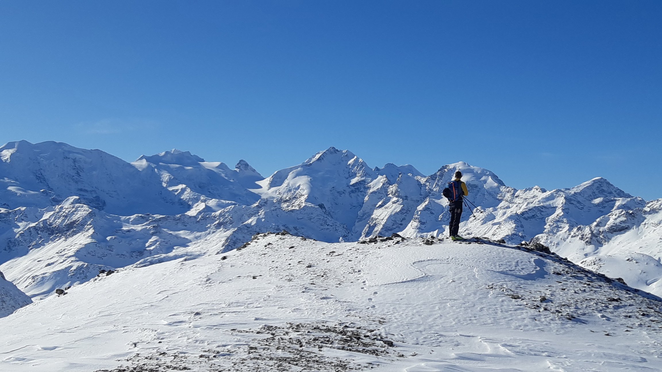Vo vrcholovej časti číhajú ostré kamene a tak záver ideme kúsok peši. Opäť topkové výhľady na Berninské Alpy a púšťame sa do záverečného zjazdu do Val Minor. Slnko už v spodnej časti svah nahrialo a tak sa popri nás spúšťajú splazy mokrého snehu. Darí sa nám ale pomedzi ne preklučkovať a prichádzame na lyžiach k dolnej stanici lanovky Lagalb. Prejdeme cez cestu a ešte chvíľu korčulujeme po uratrakovanom chodníku, korčulovanie v plnej poľnej po rovine je skialpová radosť ktorá prekrví celé telo a za chvíľu sme späť na parkovisku pri Diavolezze.