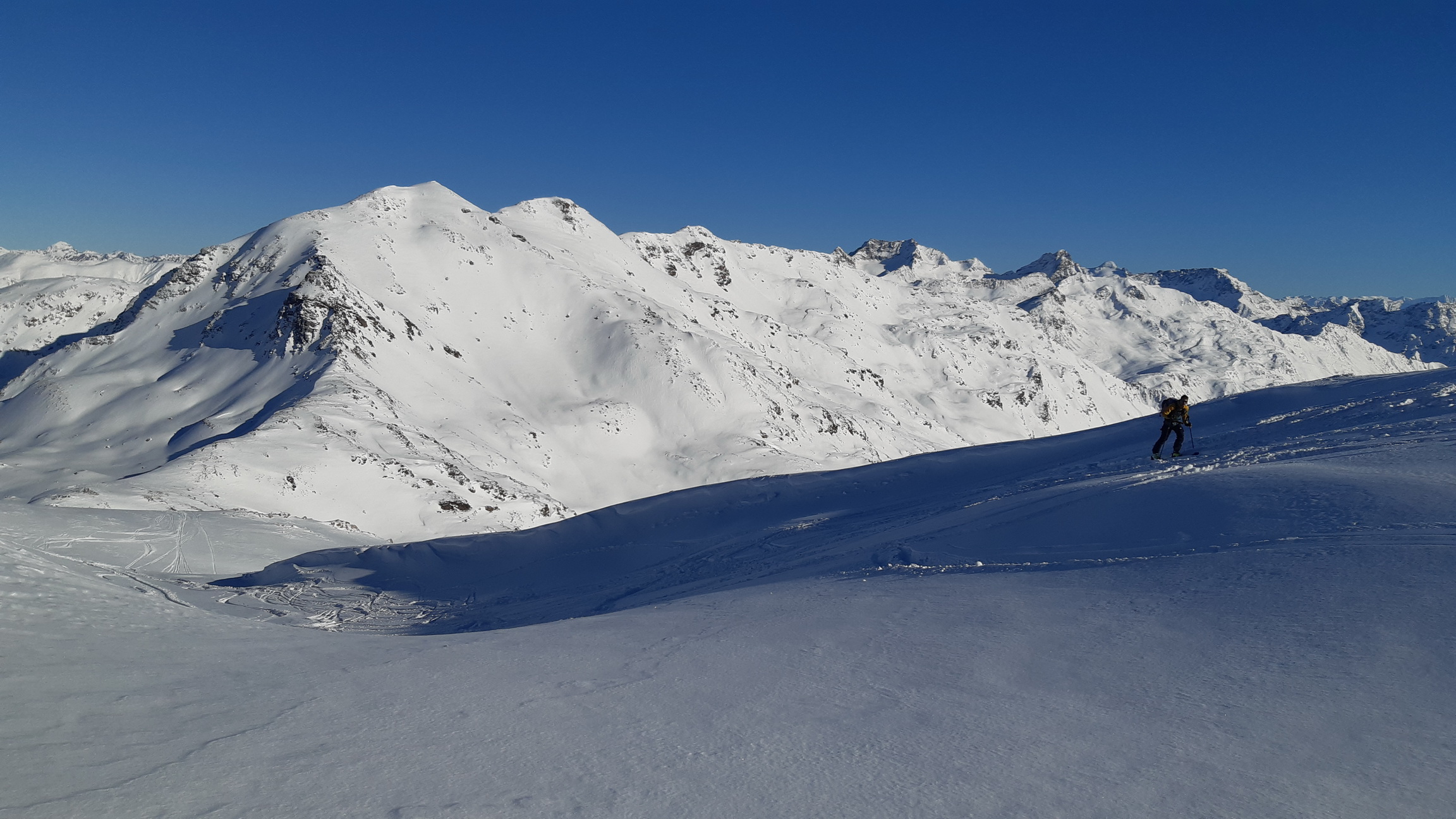 Využili sme pekne čo nám dnes počasie a podmienky ponúkli, po poslednom snežení sa už dá hovoriť o celkom dobrých snehových podmienkach v tejto oblasti. Z masívu Minoru sa ponúkajú parádne zjazdy do Val Minor ale dnes sme sa snažili postupovať defenzívne, bola lavínová 3 a tak sme si ich len obzreli a dole zlyžovali tým najčastejšie jazdeným kuloárom v ktorom už bola vypadnutá veľká lavína. Vo vrcholových partiách kôli vetru môžete stále chytiť nejaký ten kameň ale tak to už chodí..