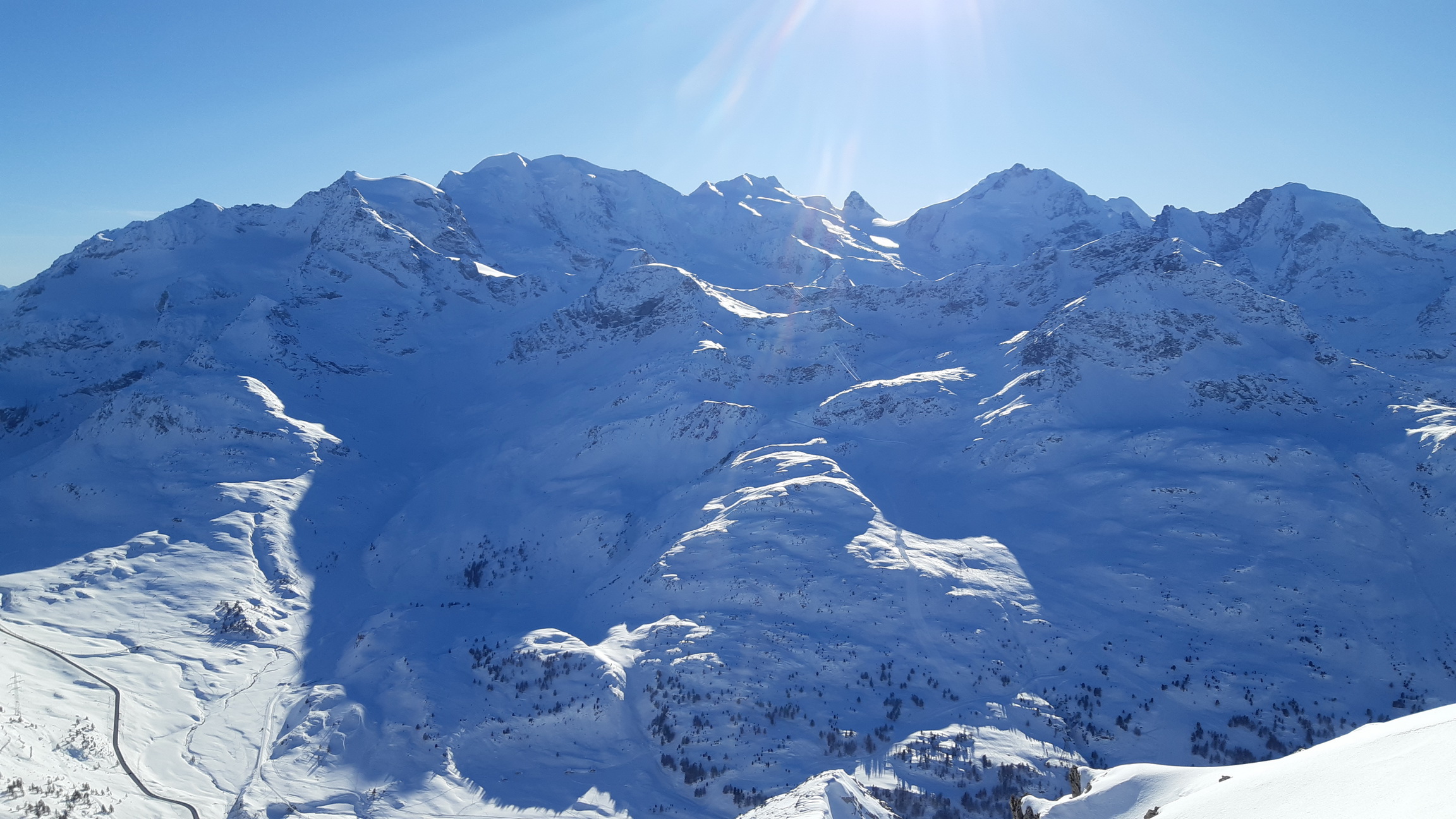 Prvý raz po veľkom snežení vyrážame na skialpovú túru. Výnimočne nejdem sám a tak nechám Beata chatára z Fornohutte vyberať. Vyrážame z parkoviska pri dolnej stanici Diavolezza, parkovanie je tu bezplatné rovnako ako pri neďalekom Lagalbe, taktiež nikoho tu nezaujíma, či idete lyžovať alebo šlapať.