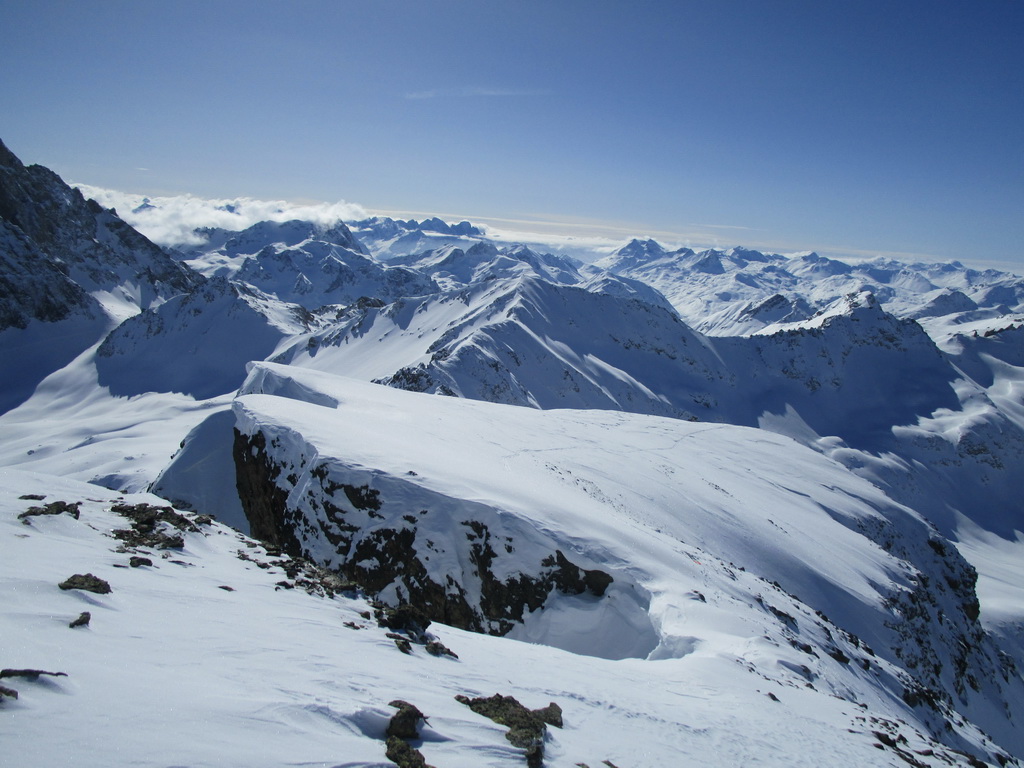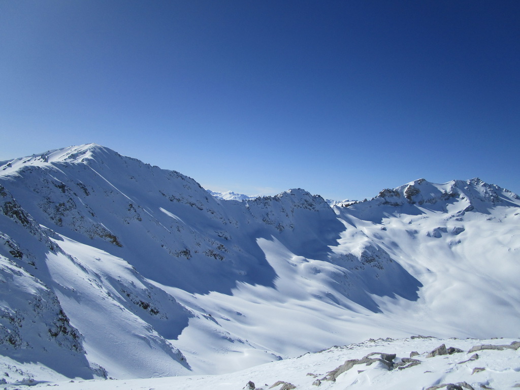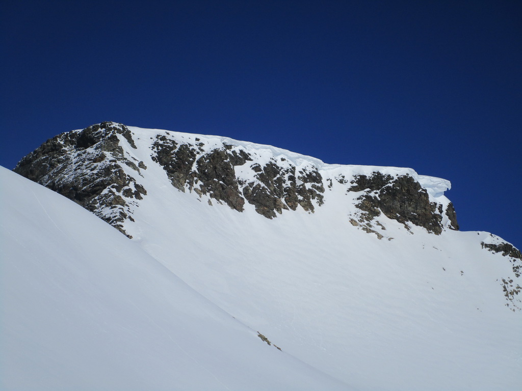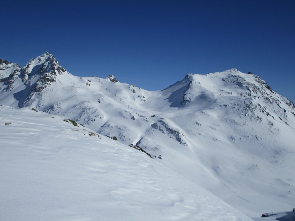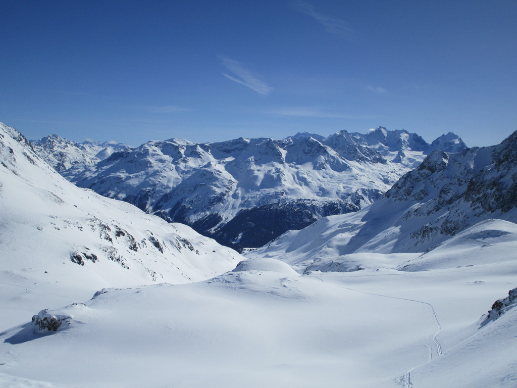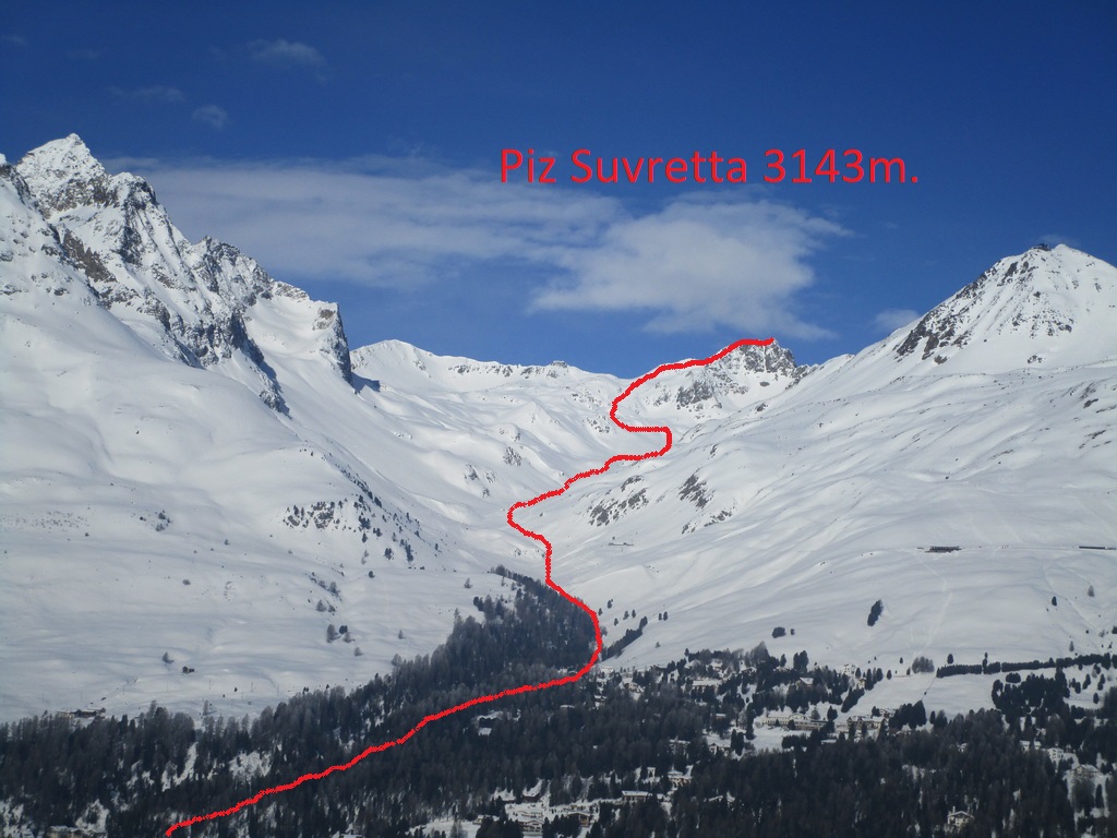 Po počiatočnom prieskume som využil pekný deň a výstup dolinou v smere od Champféru som dostiahol až na vrchol týčiaci sa nad záverom doliny s rovnakým názvom ako dolina samá: Piz Suvretta. Nepomýľte si ho s protiľahlým a lyžiarmi oveľa viac navštevovaným vrcholom s názvom Corn Suvretta. Piz Suvretta je kopec lyžiarmi oveľa menej navštevovaný hlavne kôli horšej dostupnosti. Na vrcholové plato sa treba vyštverať strmým žliabkom a na záverečné metre pod vrcholom som si obul kôli expozícii radšej aj mačky. Lyžoval som tesne spod vrcholu cez plato a žliabkom dole, potom už bezproblémová nádherná jazda pláňami a žlabmi až dole do Champferu. Poctivých 1300 v. m.