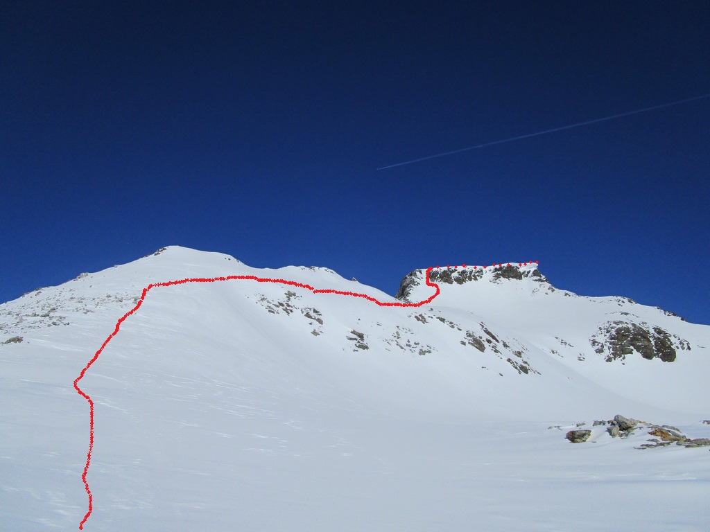 Dolina je prevažne mierna, stopy lyžiarov sú väčšinou priame a tak pri výšlape na pásoch od Champferu sa dá využiť tvrdý vyjazdený podklad, natrafil som dokonca aj na starú výstupovú stopu. Dolina je to síce mierna ale zase o to dlhšia a preto treba natiahnuť krok...