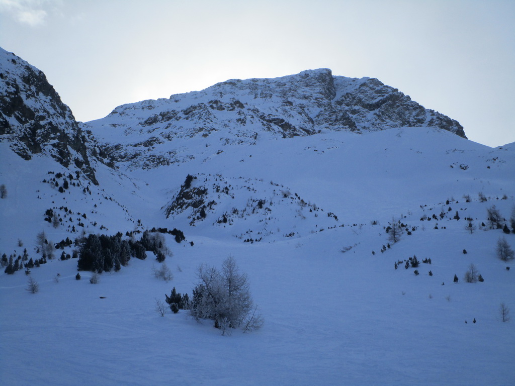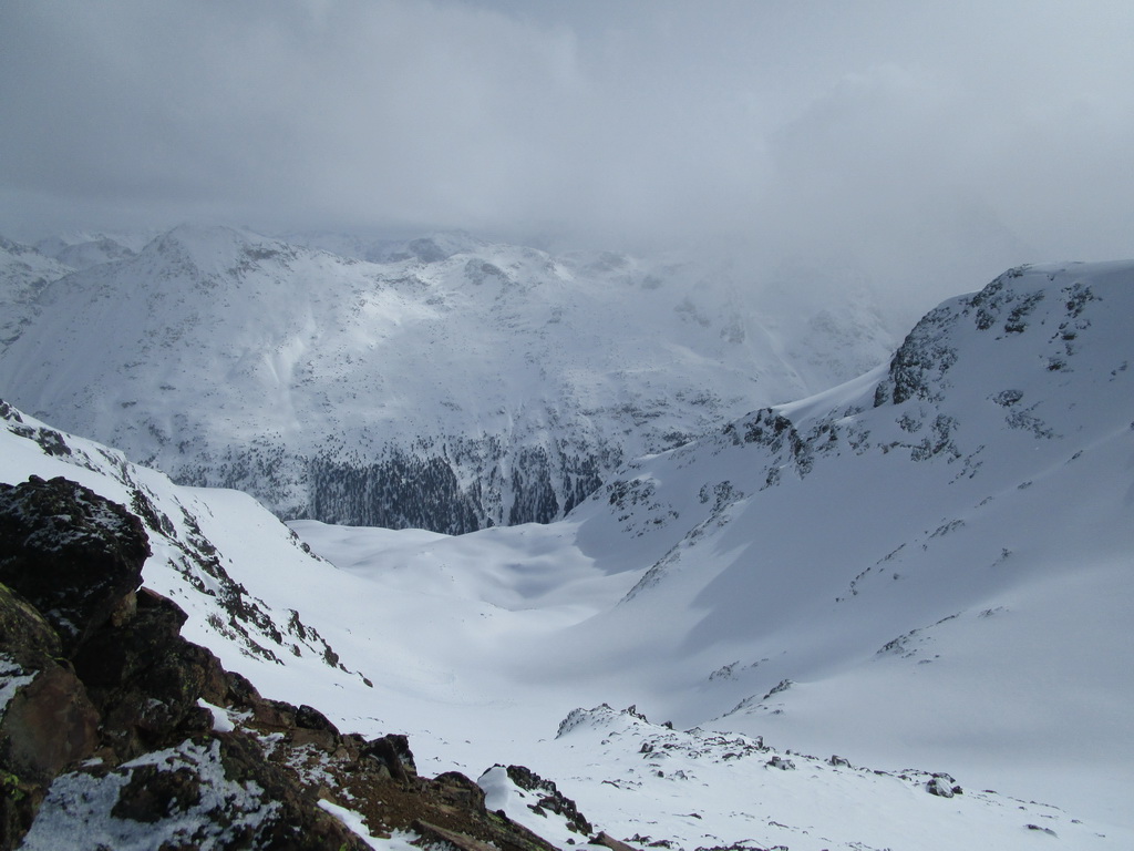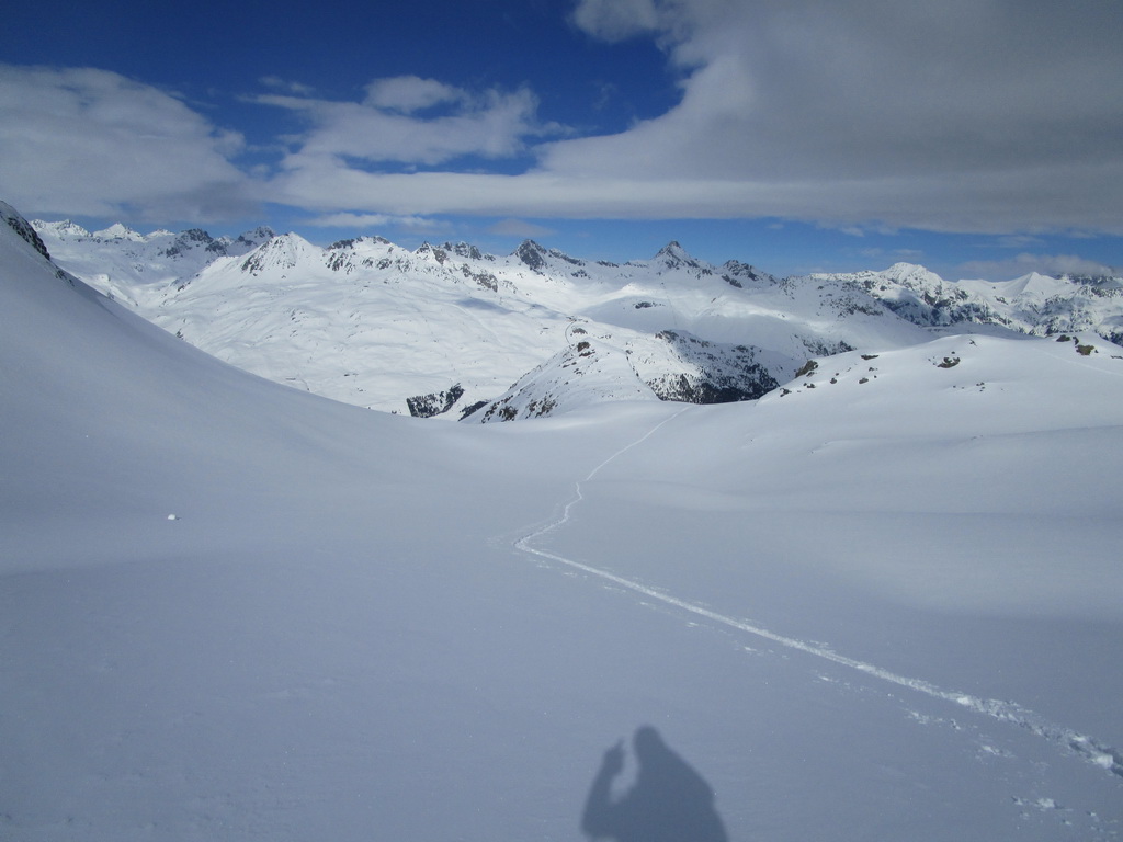 Šlapať sa dá ale aj priamo zdola pekne po trase zjazdu tak ako som to urobil aj ja. Natrafil som dokonca na starú výstupovú stopu. Najprv po bežeckej stope a chodníčkami z bezplatného parkoviska pri Champferi, potom kúsok popri zjazdovke a potom už úžasným spodným kuloárom vedúcim do kotla pod vrcholovou stenou San Gianu. V obrovskom amfiteátri pod vrcholovou stenou som si pripadal ako v mrazničke plnej snehu, raz darmo tá severná orientácia je zárukou kvality bieleho prášku.