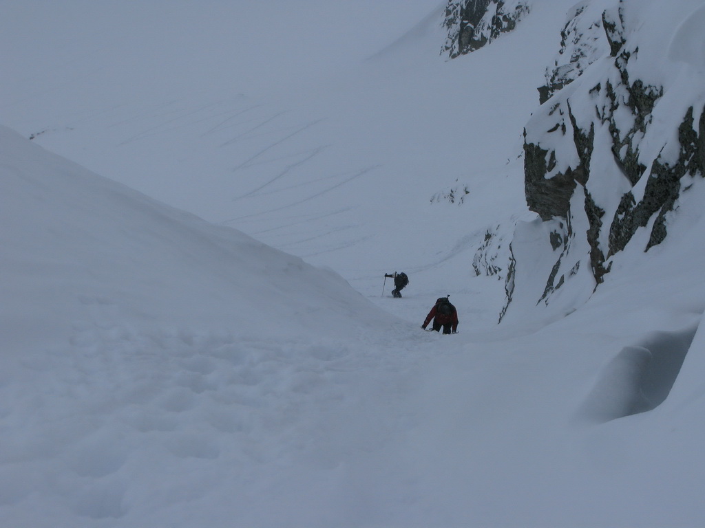 Do úplnej tmy už len pár minút. Rýchlo pásy do batohu a šup ho dole. Po zamrznutom a rozrýľovanom žľabe. Len nezlomiť lyžu!