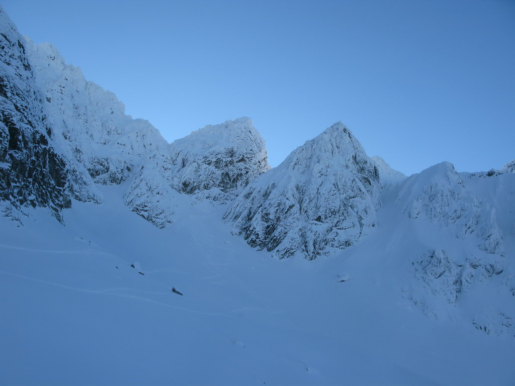 V Zmrznutom kotli fúka. Bŕŕŕ jaká zima, ale sedlo sa blíži. Moja najbližšia motivácia je uvidieť slnko. Už hodnú chvíľu pozorujem, ako osvetľuje vrchol Mlynára.
