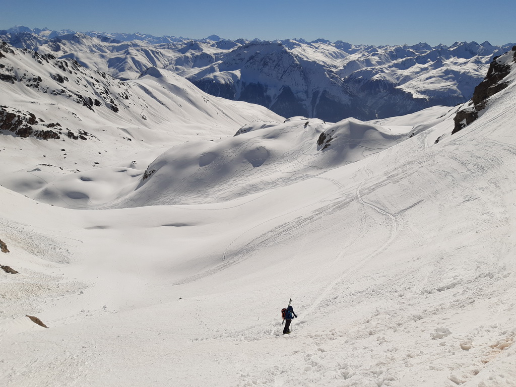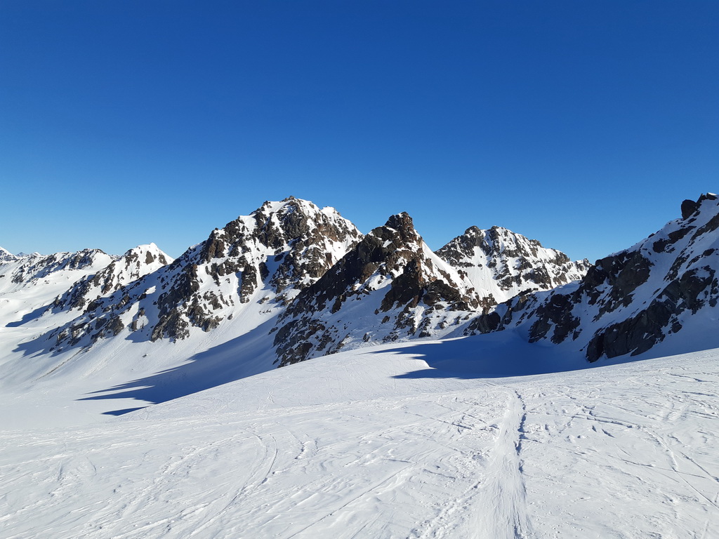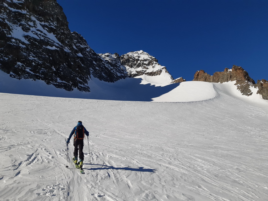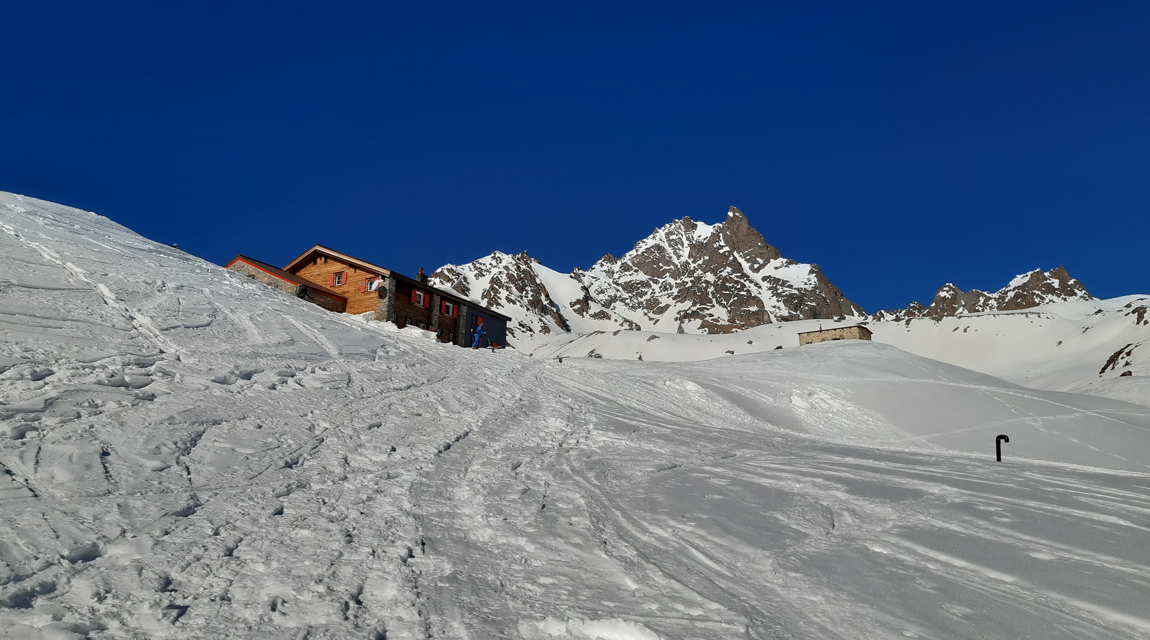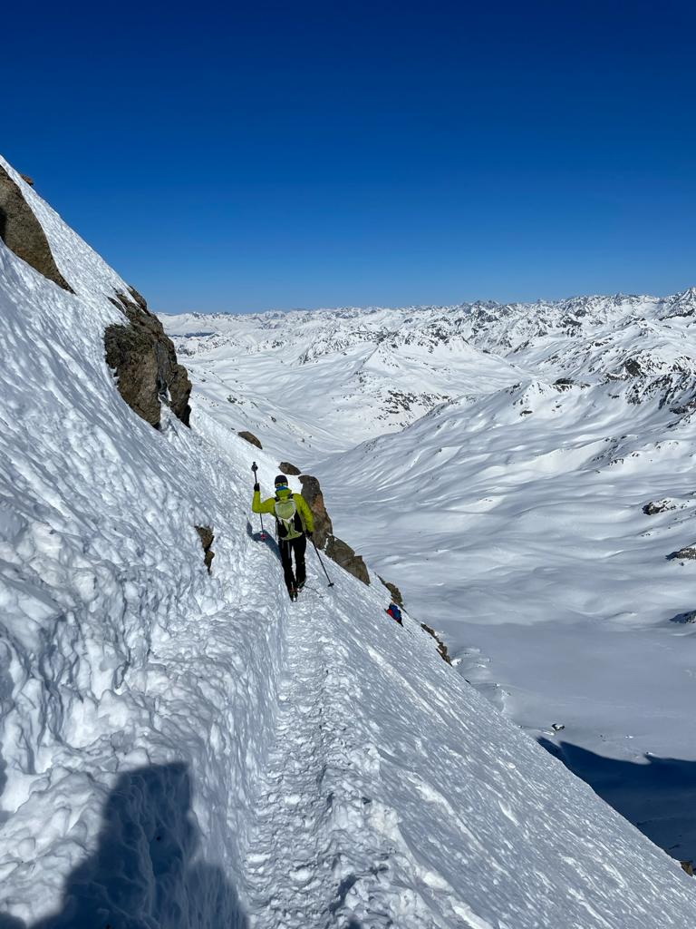 Stúpame ďalej po stope popri hrebienku až pod sedlo Porta d´Escha (3007 m). Posledné metre doňho ideme napešo s lyžami v rukách. Prešliapaná stopa dáva tušiť poriadnu premávku, tadiaľto totiž vedie nielen výstup na náš kopec, ale je to aj prechod ku susediacej chate Kesch. Táto trasa je časťou Graubundenskej Haute Route, skialpového putovania z chaty na chatu.