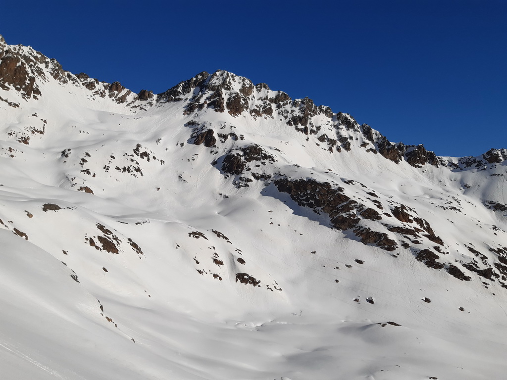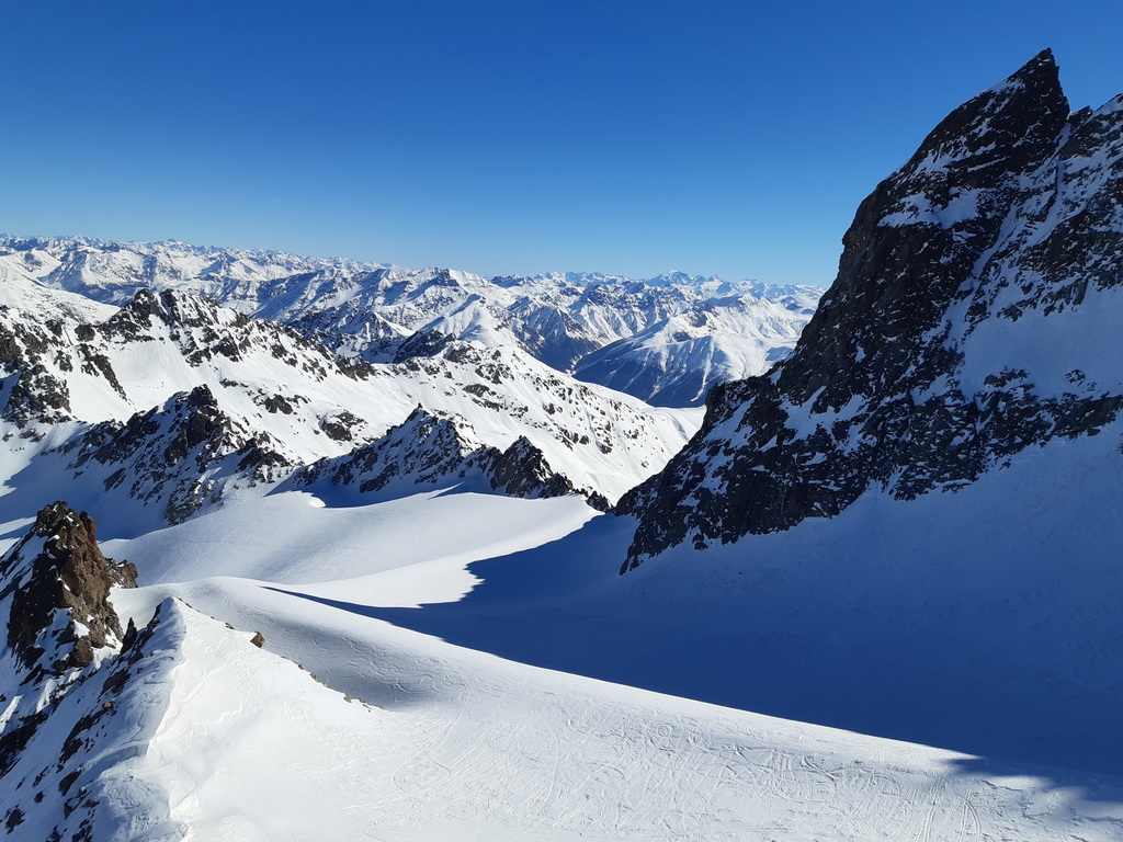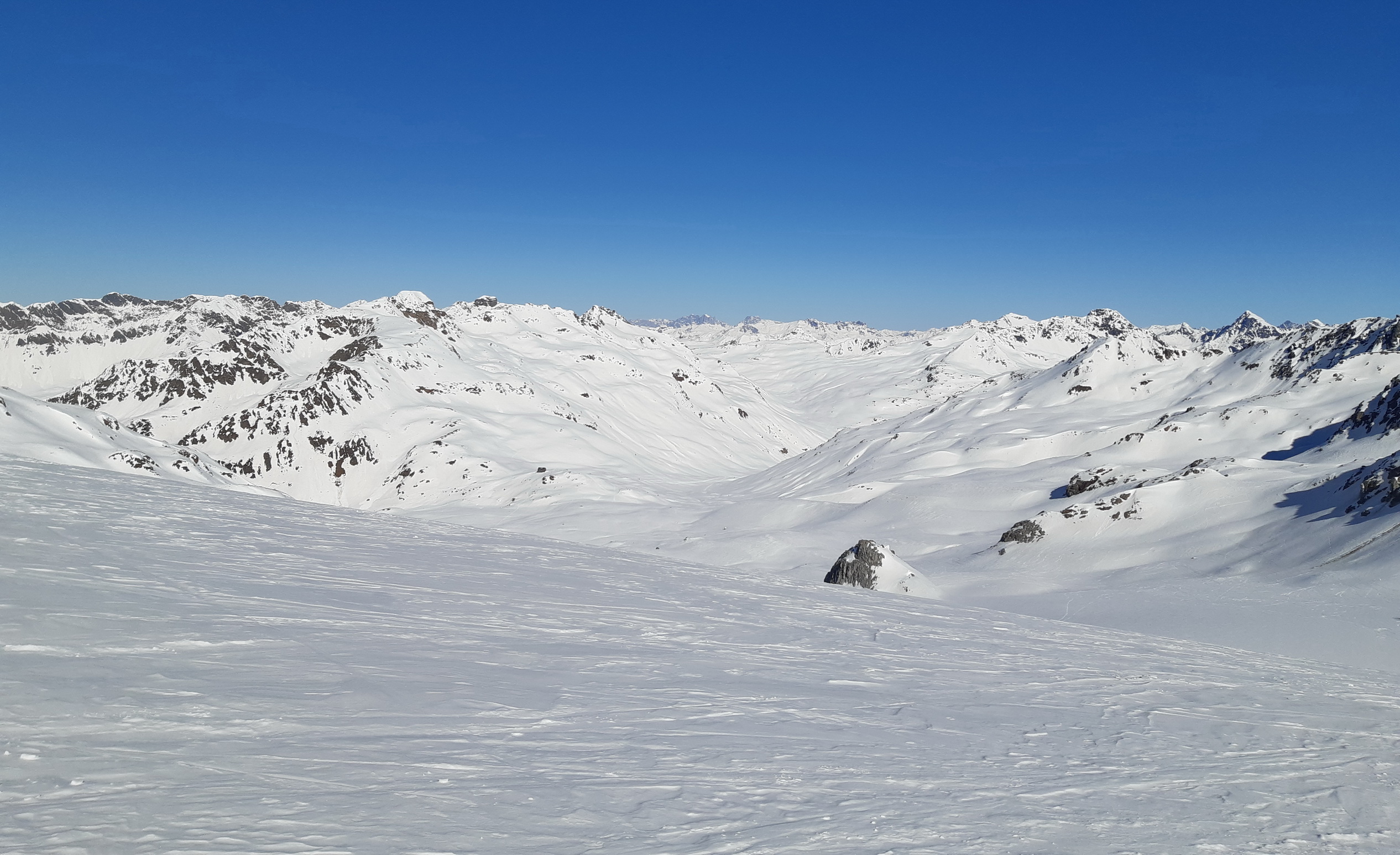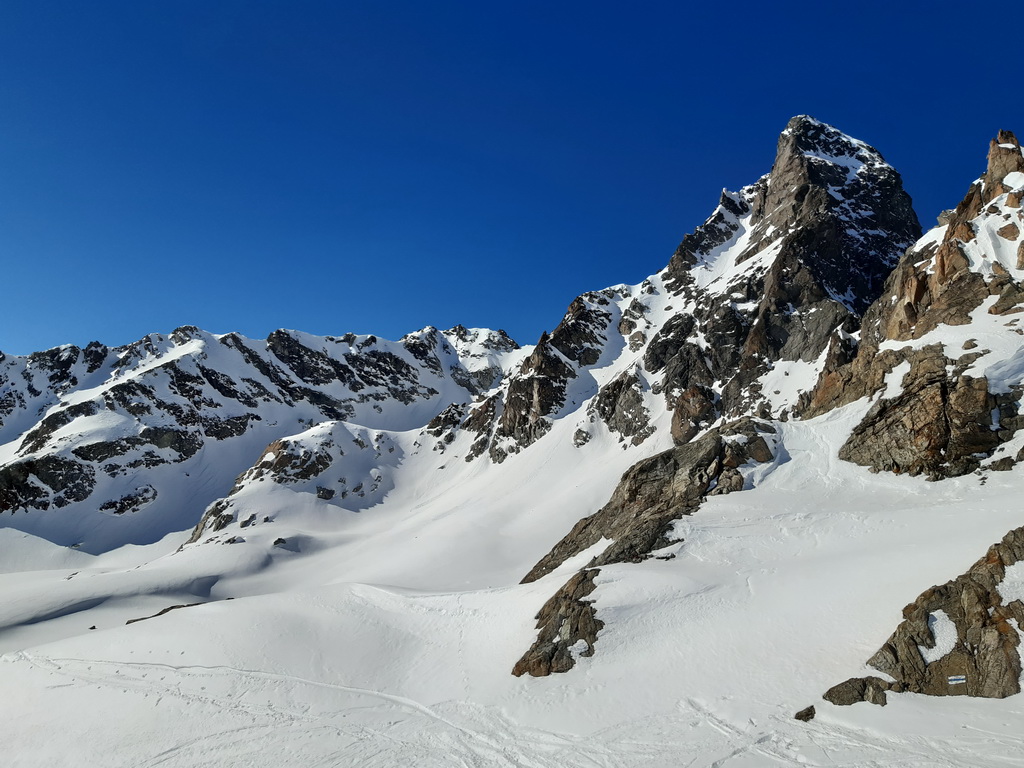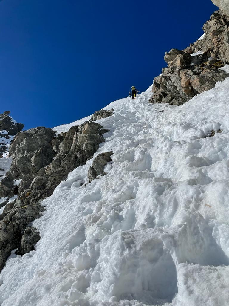 Stúpame ďalej po stope popri hrebienku až pod sedlo Porta d´Escha (3007 m). Posledné metre doňho ideme napešo s lyžami v rukách. Prešliapaná stopa dáva tušiť poriadnu premávku, tadiaľto totiž vedie nielen výstup na náš kopec, ale je to aj prechod ku susediacej chate Kesch. Táto trasa je časťou Graubundenskej Haute Route, skialpového putovania z chaty na chatu.
