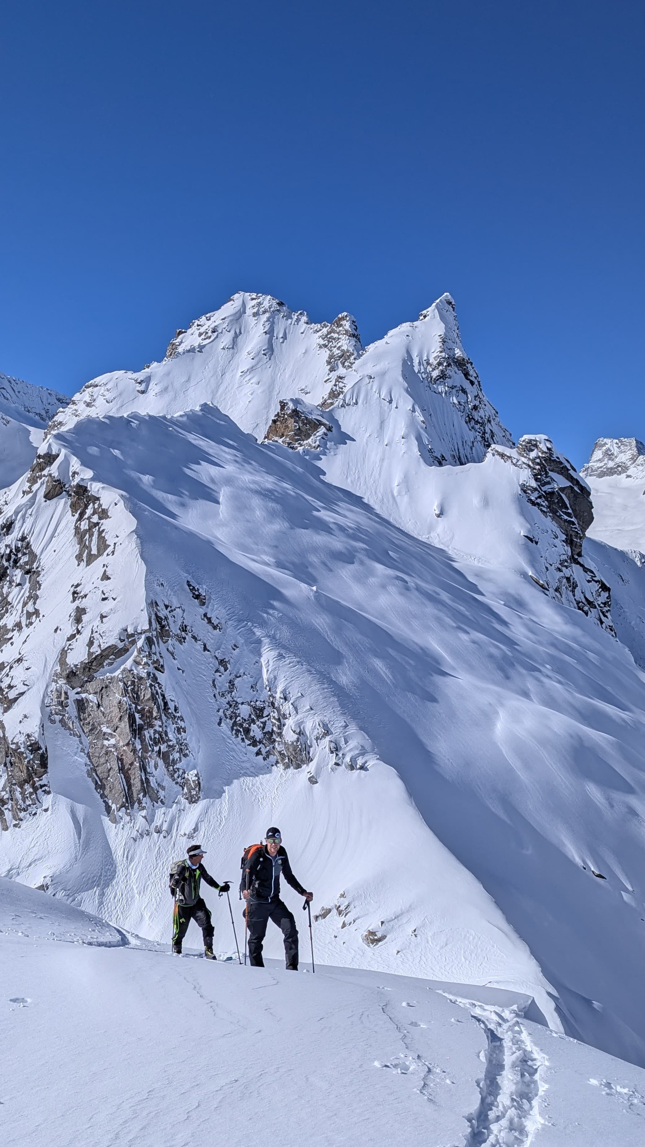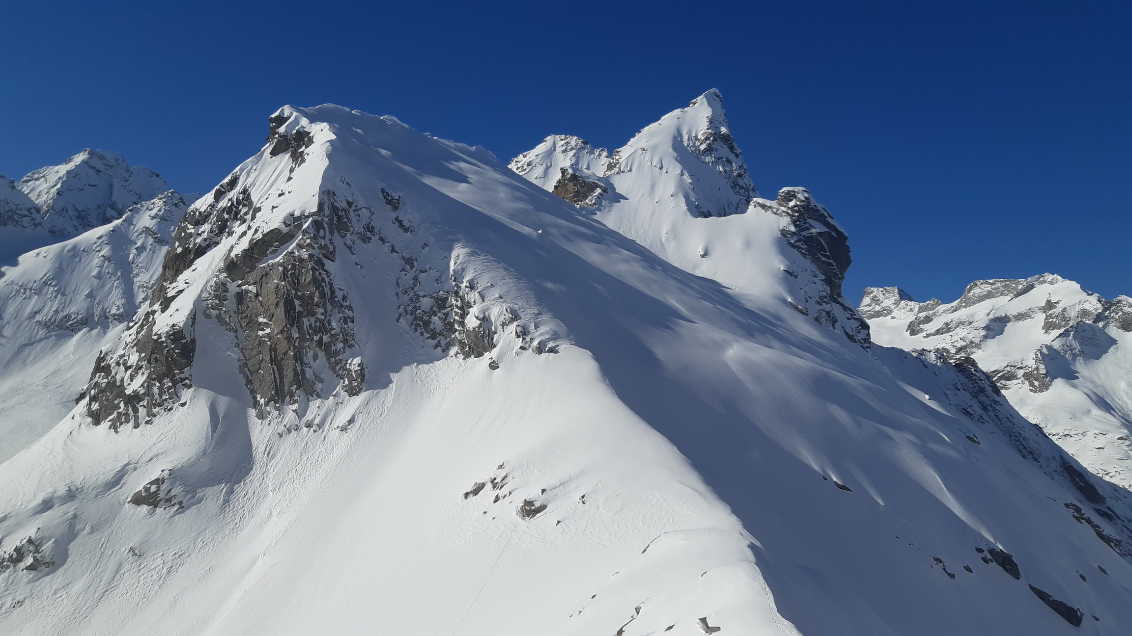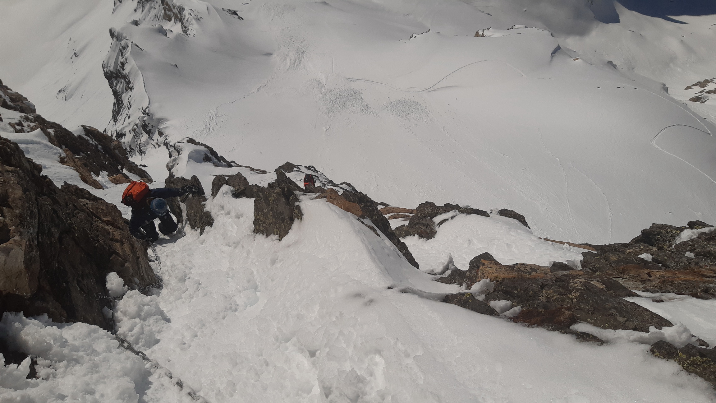 Lyže nechávame pod skalným pásom. Z vrcholu nevedie žiadna zjazdová možnosť. Reťaze idú očistiť a vytiahnuť spod čerstvého snehu pomerne ľaho a tak nám to netrvá moc dlho a už prešlapávame stopu krásnym fotogenickým hrebeňom až na vrchol. Počasie praje a po nedávnom silnom snežení sa nám celé okolie ukáže v plnej kráse.