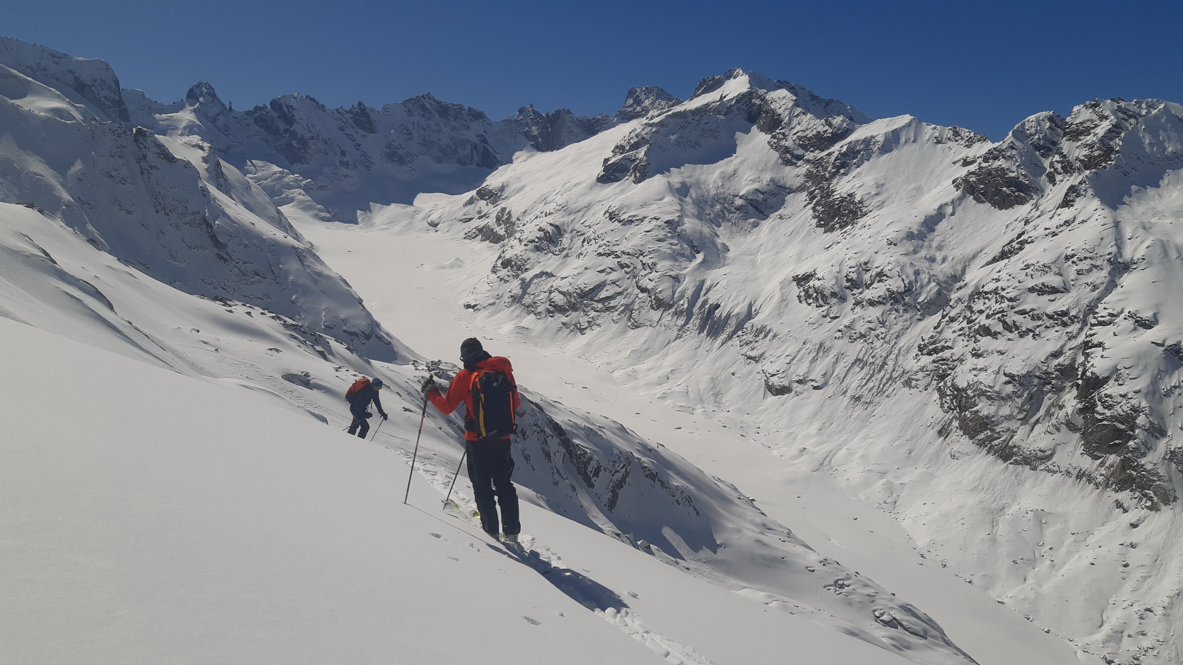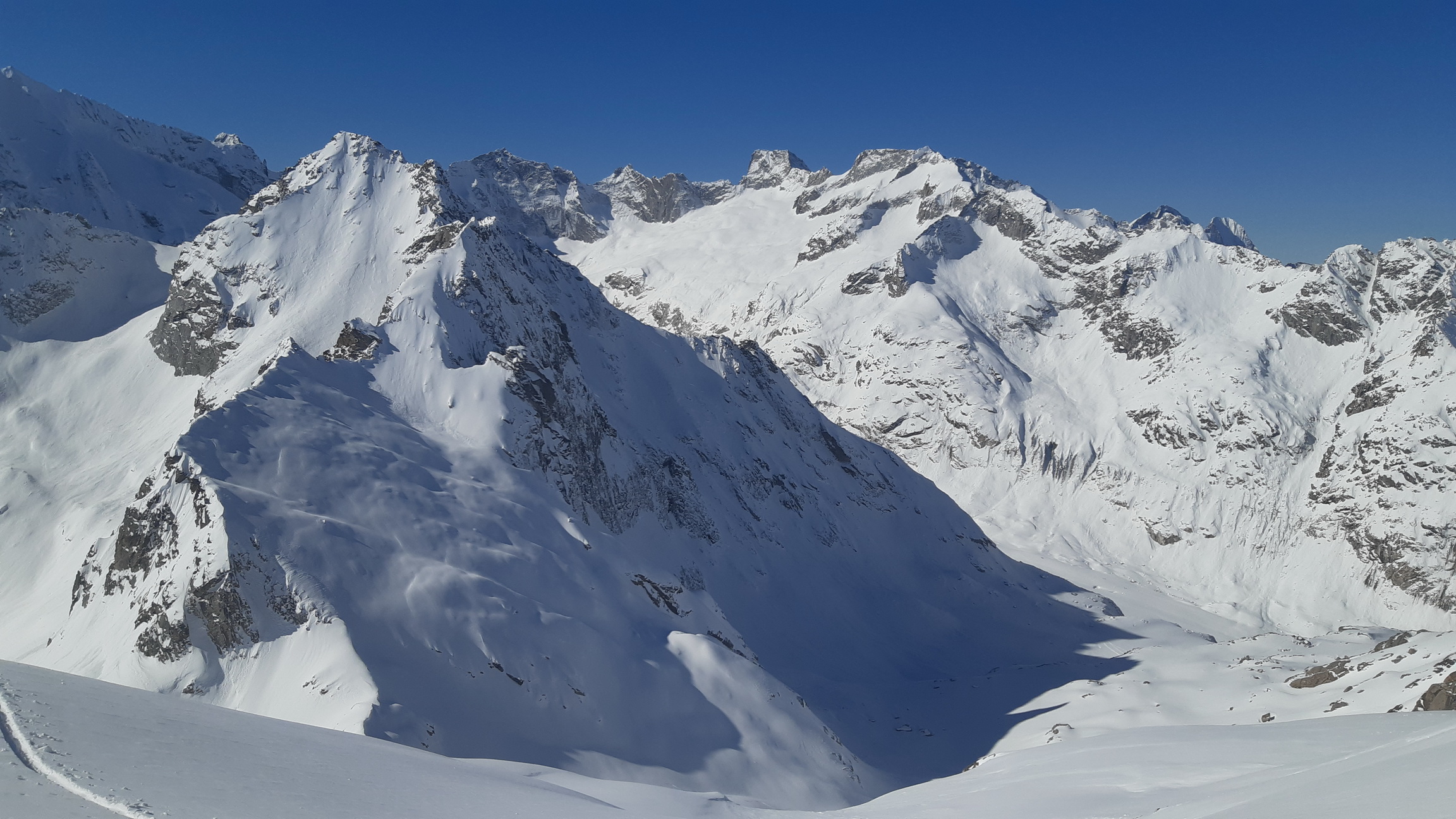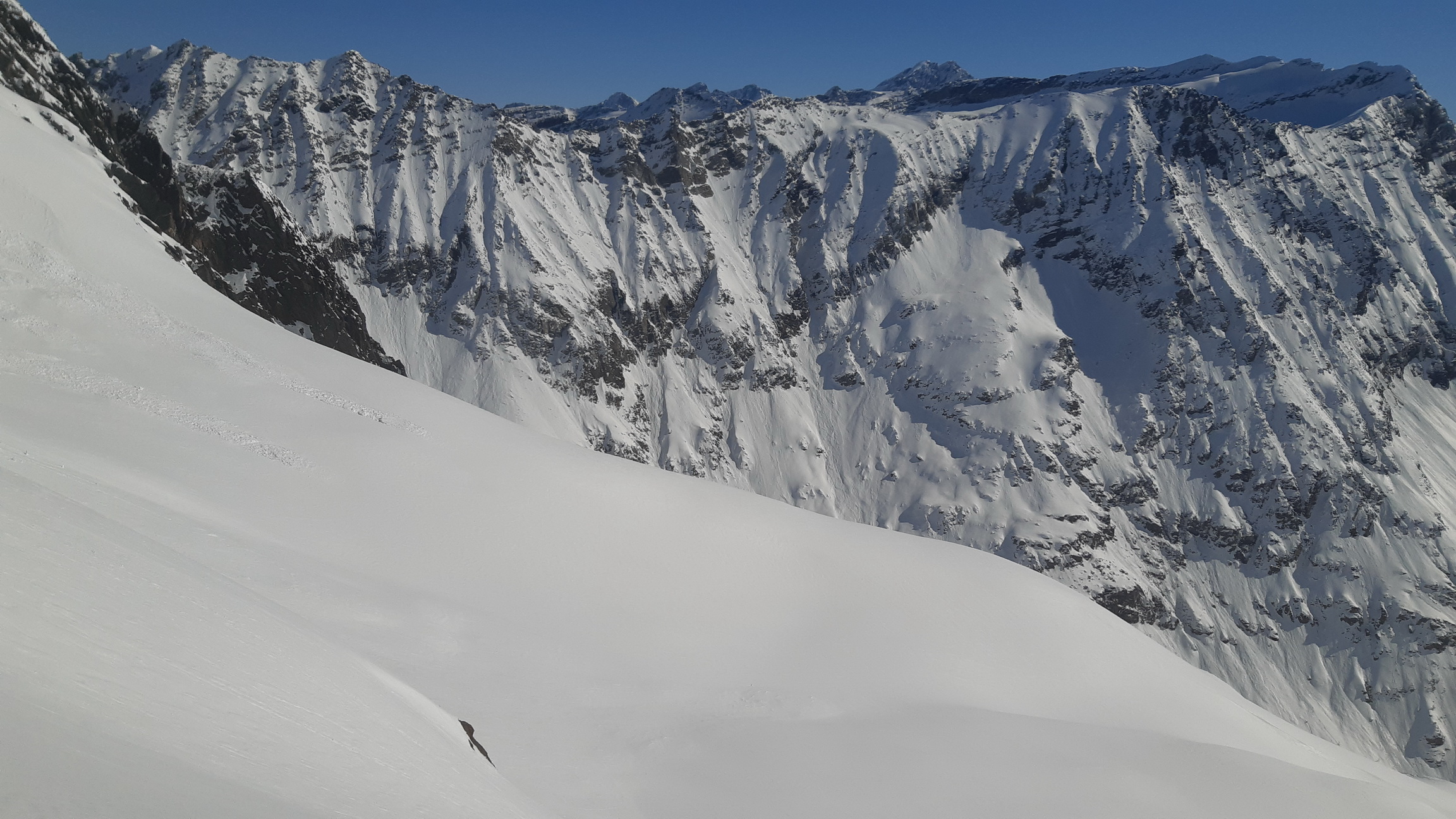 Pri návrate na chatu sa nevraciame zjazdom späť popri našej stope ale aby sme viac uvideli prehupneme sa cez sedielko v hrebeni pod vrcholom na druhú stranu a lyžujeme dole úbočím hory na ktorej sme pred pár minútami stáli. Teším sa, že vidím úplne nové pohľady a mapujem si okolie. Je tu čo robiť a najbližšie tri dni sa to veru chystám využiť naplno.