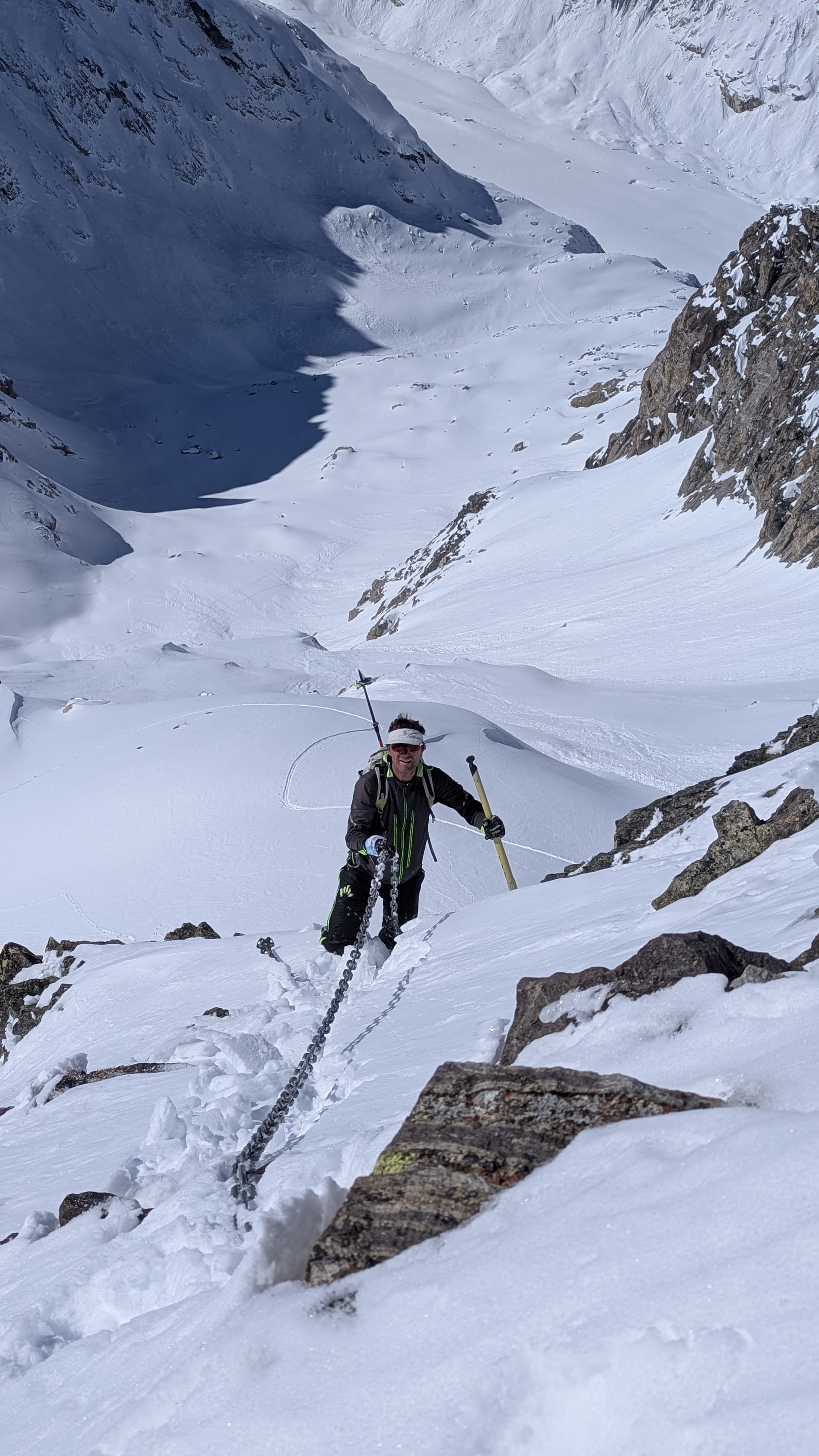 Keď večer po mojom príchode na chatu chatár Beat zahlásil, že by na druhý deň rád očistil reťaze na Monte del Forno bola úplná samozrejmosť, že sa pridám. Ráno sme vyrazili až ako poslední, najprv bolo treba vyprevadiť hostí a až keď chata ostala prázdna vyrazili sme my. Teda chatár so svojím zatiaľ jediným zamestnancom a ja. Vyšlapali sme najprv do Sella del Forno sedla nad chatou za ktorým už je Talianske Val Malenco a pokračovali strmým chrbátom pod samotný vrchol.