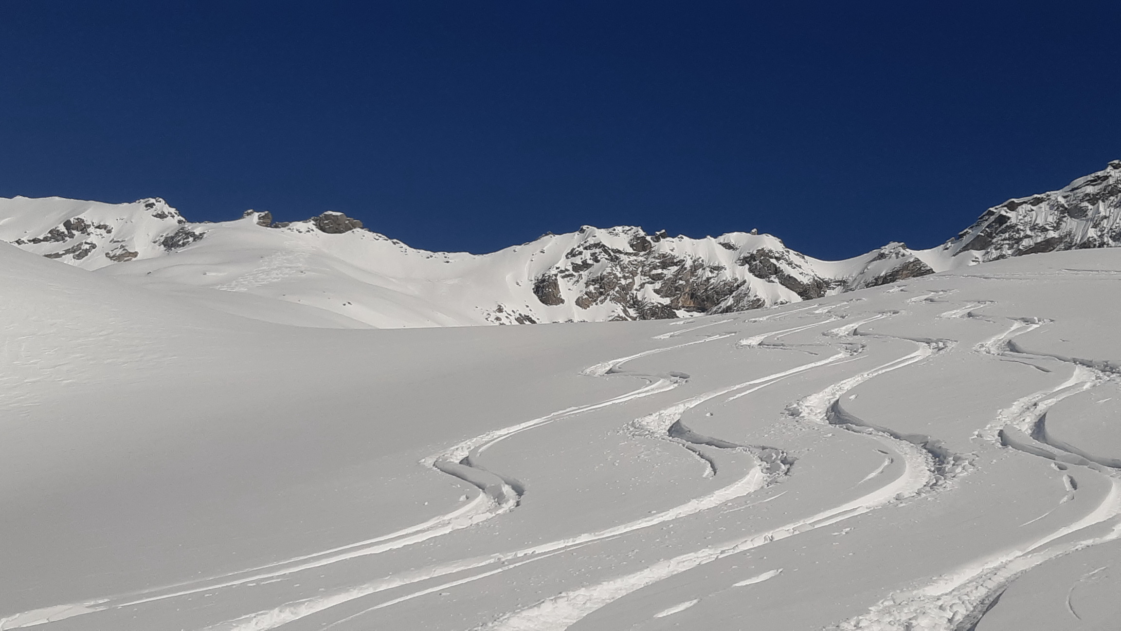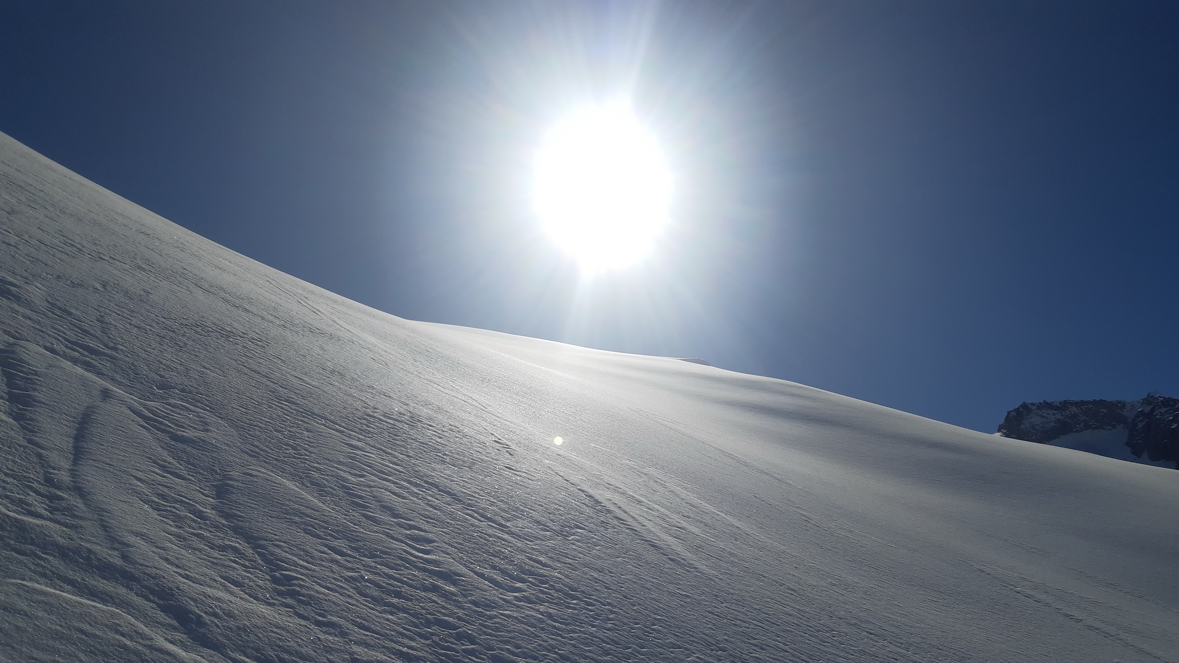 Začínam zjazdom z chaty na dno doliny. Nepoužívam prístupovú trasu v smer z Maloje ale na takéto účely tu majú roklinku vyhĺbenú topiacim sa ľadovcom a prietržami mračien v lete s efektnými padajúcimi kameňmi po jednej strane. Jednoducho sledujem stopu, jedinú v doline týmto smerom. Skupinku zakrátko stretávam, práve dokončili zjazd z vedľajšej dolinky, poďakujem za stopu a pálim ďalej. Stopa je luxus, ktorý sa snažím využiť a tak sa dostávam pohodlne a bezbolestne až hore na hrebeň. Pozerám, že sa nenamáhali traverzovať na Cima di Val Bona, nevadí. Pofotím výhľady na druhú stranu, dole pásy a už vychutnávam lyžovačku v prašane.
