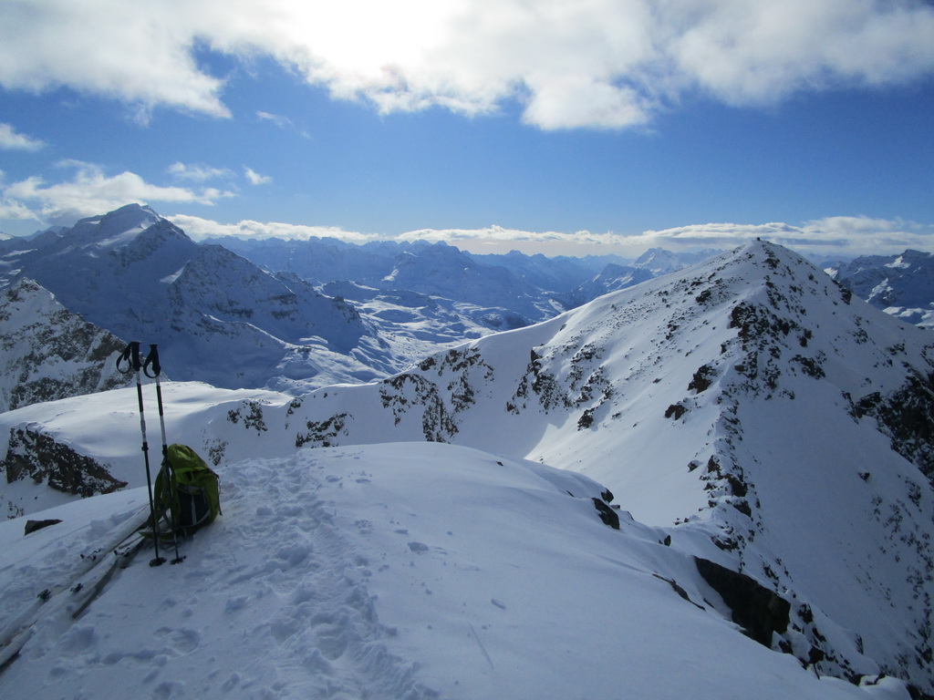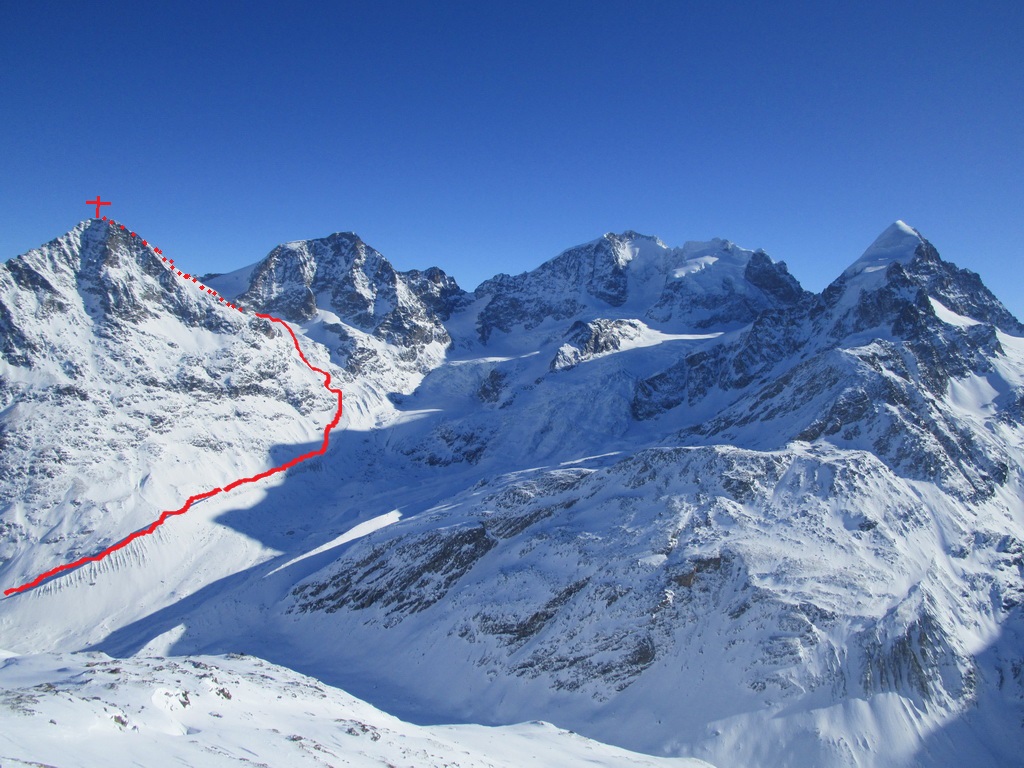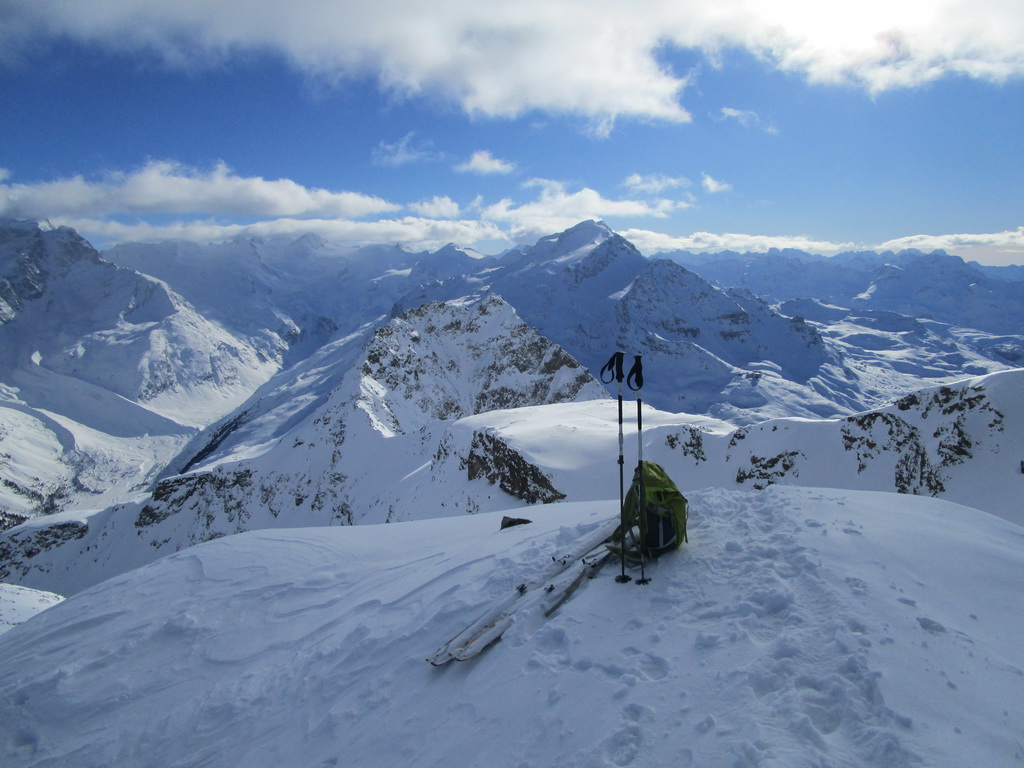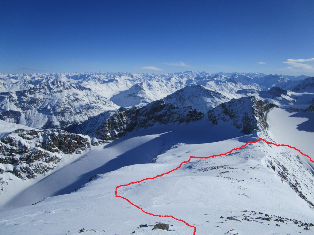 Odtiaľto už postupujem po pravej strane hrebeňa s lyžami až na vrchol. Piz Tschierva pri pohľade od Fuorcly Surlej veru nevyzerá, že by sa tu dalo dostať až hore na lyžiach, opak je ale pravdou. Je to pekná a na výhľady vďačná túra.