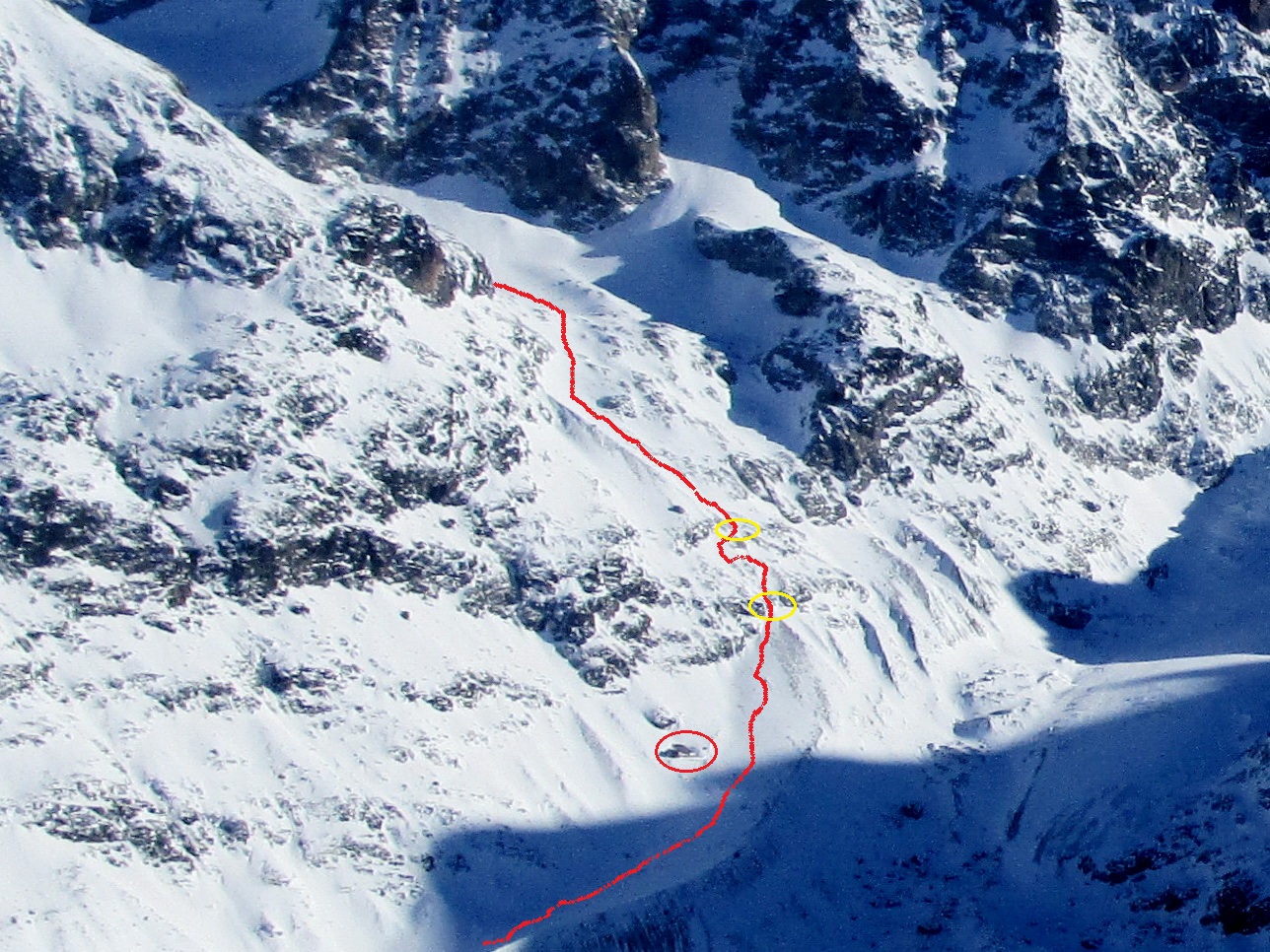 Odtiaľto už šlapem stopu príjemnými svahmi až ku ľadovcu. Pozorujem, že trhlinky sú prikryté. Vďaka častým letným výletom viem, že by to malo byť ok. Prichádzam ku miestu kde sa treba strmým svahom dostať na hrebeň vedúci až na vrchol Tschiervy. Snehu je pomenej ale je tvrdý a tak znovu pomocou haršajzní sa mi to darí na lyžiach.