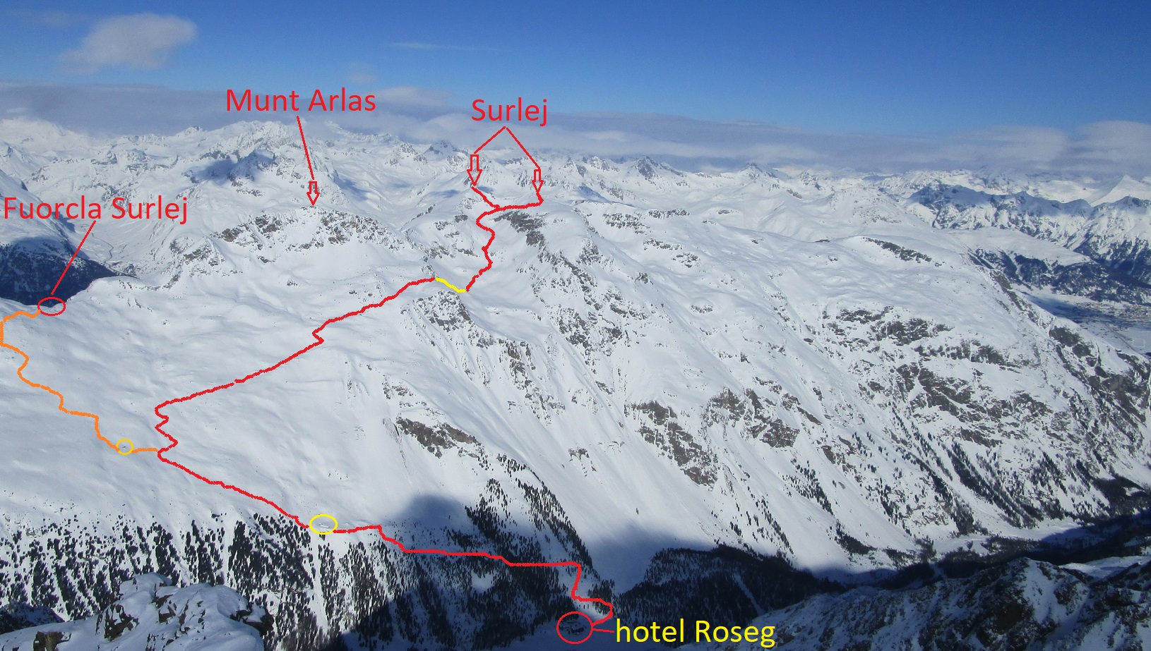 Keď doobeda som musel stopu kompletne šlapať sám a veru ma to stálo celkom dosť síl tak tentoraz si vychutnávam kvalitnú stopu na ktorú sa dostávam pri traverze terás. Po krátkom zjazde do kotla opäť nalepujem pásy a po stope sa dostávam až hore na vedľajší vrchol Piz Surlej. Je to opäť extrémna zima ktorá mi okreše dnešné plány ale aj kvalitný sneh na strane môjho výstupu ma prinúti zlyžovať naspäť popri výstupovej stope. Krátky výšlap vonku z kotla a už nasleduje zjazd parádnym prašanom dole naspäť do Val Roseg kde mám môj základný tábor...