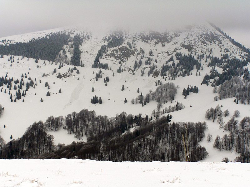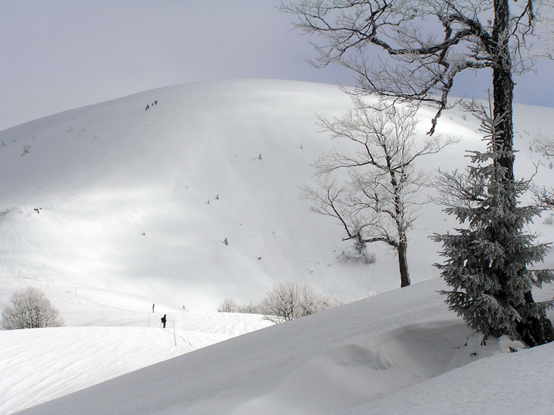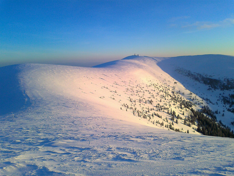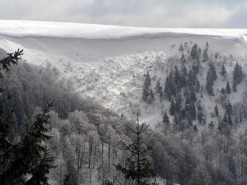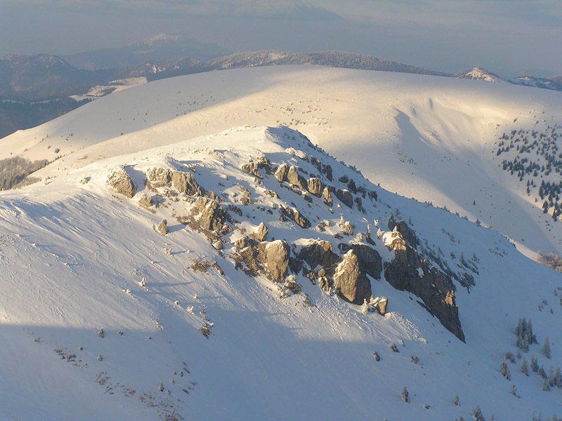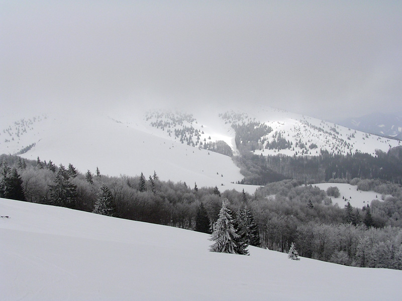 Ešte by sa patrilo v skratke zhrnúť snehové a iné podmienky. Takže hrebeň je vymrznutý na tvrdo, nie je to však ľad – takže ideálny na hrebeňovku na pásoch alebo aj na pešo. Stretli sme dokonca aj pár bežkárov. Bočné svahy okolo salaša pod Suchou a pred Suchým vrchom si doslova pýtajú polyžovať – takže hor sa tam :-) Zjazd aj výšľap na Ploskú takisto tvrdý, ale perfektný. Okrem toho – zatiaľ ešte stále zachovaná zimná krajina ako z Mrázika, čovek mal pocit že je začiatok januára, nie marca. Ako dôkaz prikladám foto, kuk dole. Tak – podľa predpovede ostáva ešte pár pekných dní, treba to využiť a prebehnúť sa po hrebeni.