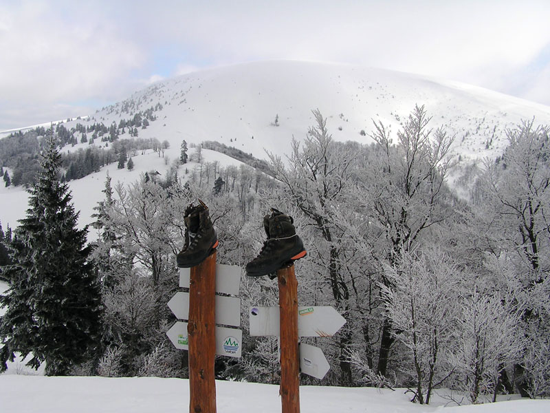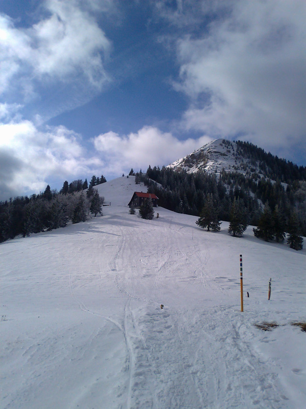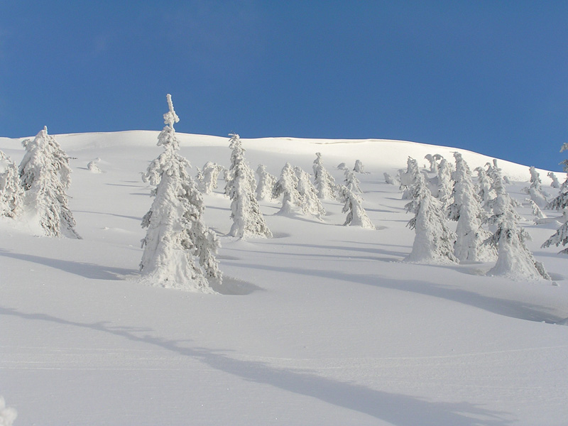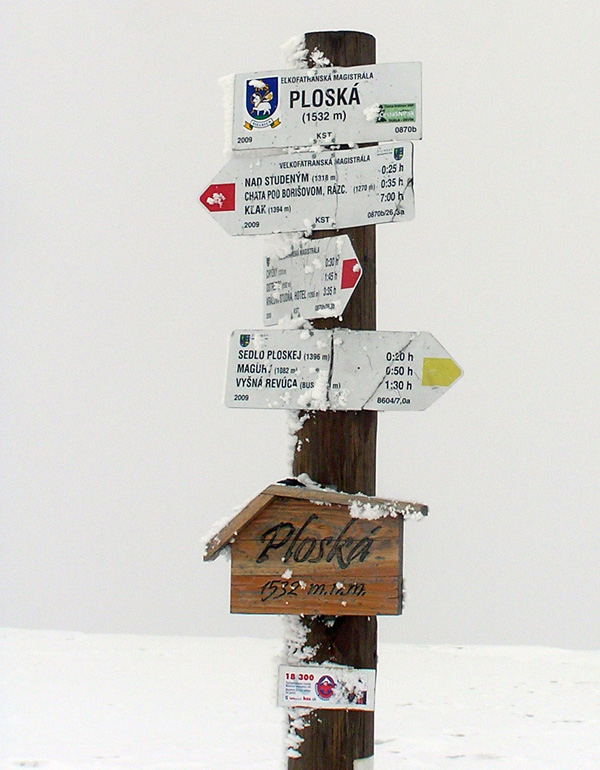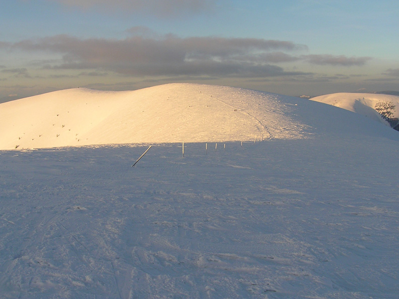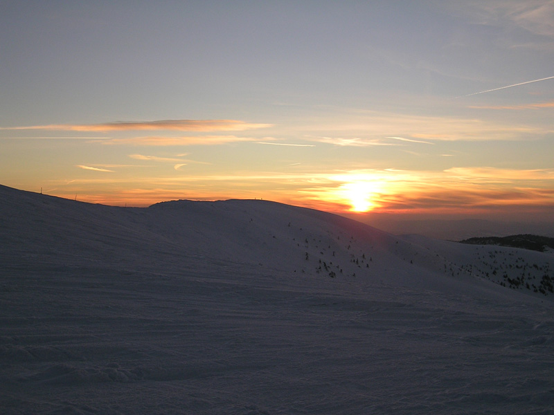 Od vrcholu sme sa pobrali pekne po hrebeni. Výhľady úžasné – od tyče k tyči, hmla sa držala až po Ostredok. Potom trochu zbledla a viditeľnosť sa zlepšila. Od Suchého vrchu až k Salašu pod Suchou parádna lyžovačka pomezi romanticky dobiela vymrznuté smreky. Nejako sme sa premotali až pod Ploskú a pekne zimnou cestou hore na vrchol. Lyžba až pod Borišovskú chatku bola takisto fajn. Posedeli sme v poloprázdnej chate. Medzitým sa vyčasilo a cesta naspäť bola síce po tej istej trase, ale spiatočná verzia poskytla väčšie množstvo vizuálnych zážitkov, končiacich západom slnka na Krížnej :-)