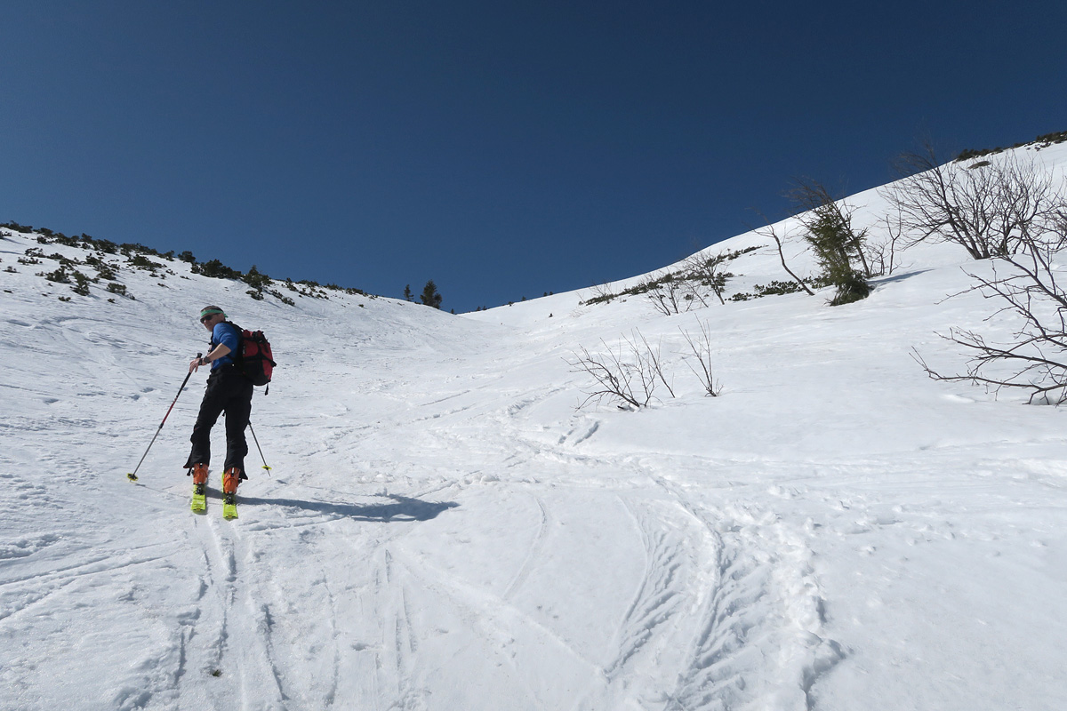 Pásy dole a zopár traverzových oblúčikov už v skoro prehnitom južnom snehu Chleba a sme v nástupe do Révajky.