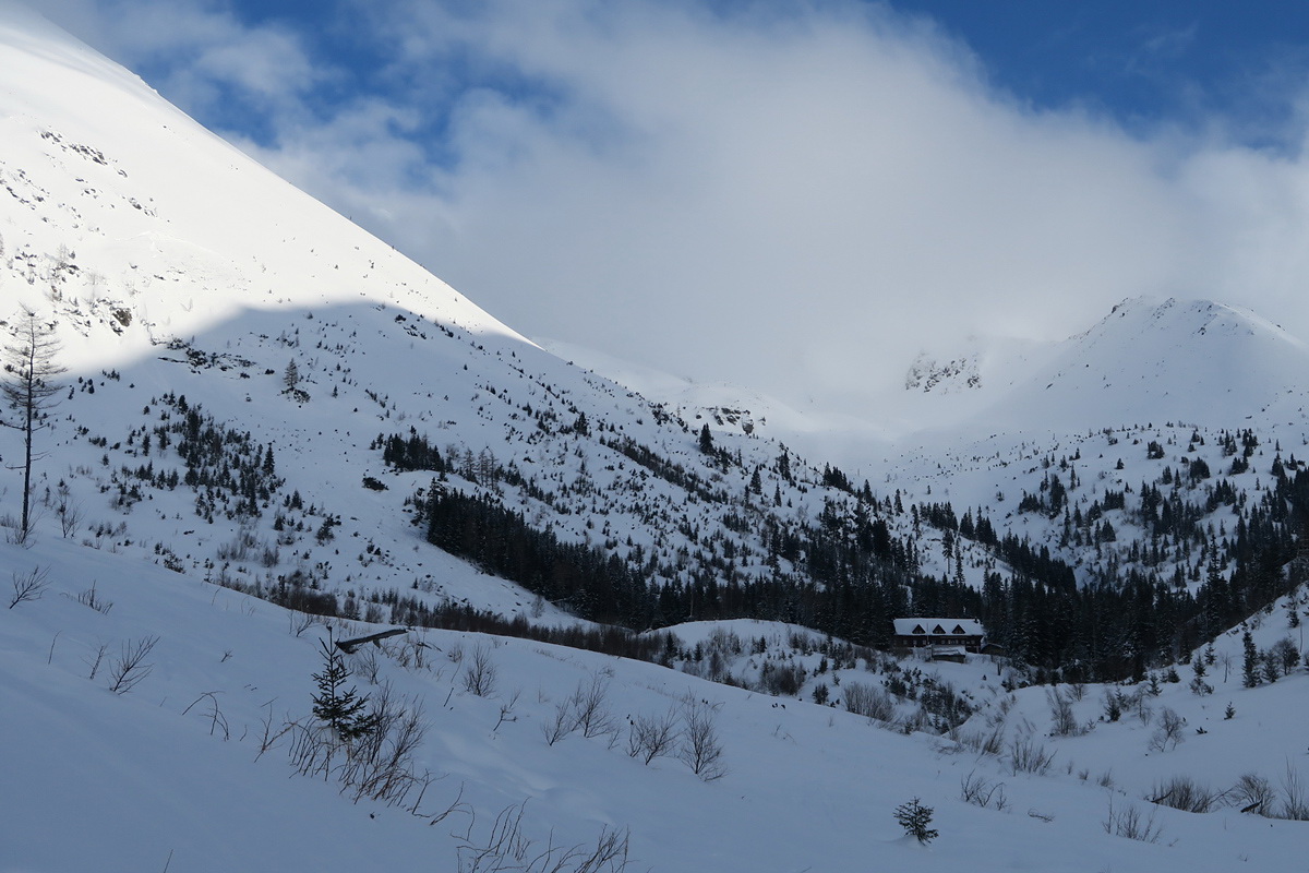 Zvyšok partie čakám len päť minút a onedlho sa už šúchame vo vyhlásenej lavínovej trojke po doline k chate.